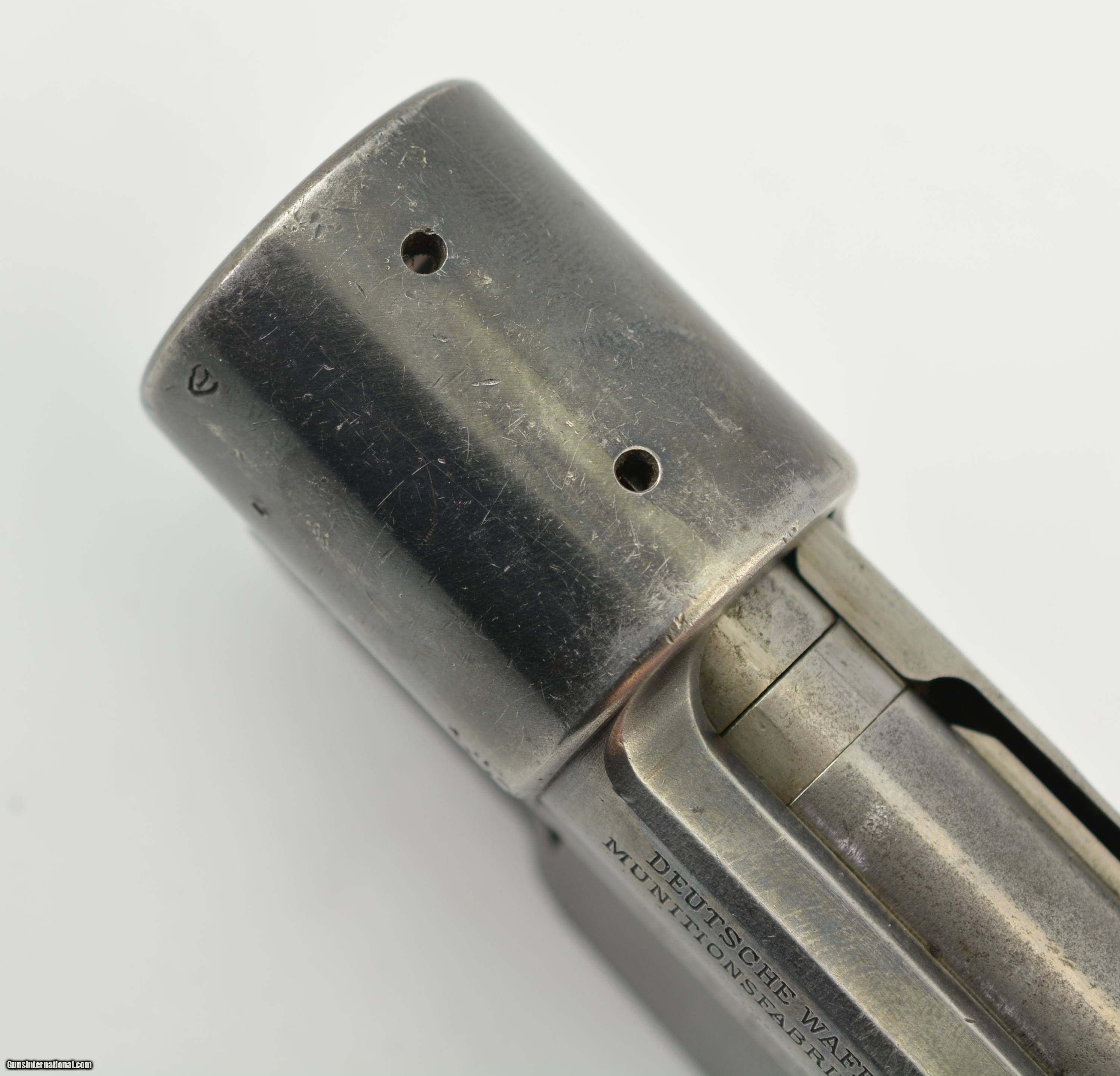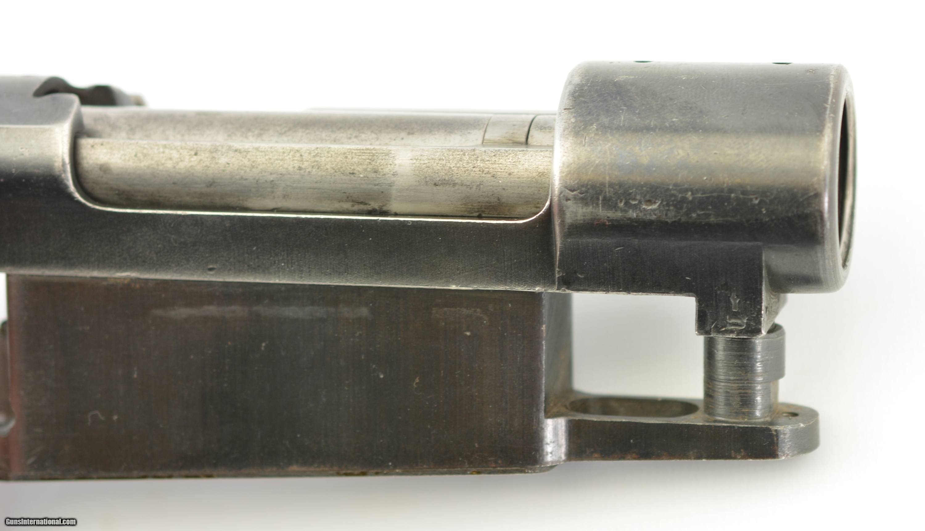 Description: Serial #2R3221. This is a DWM marked Mauser action that retains 85-90% of the original blue finish with silvering along the high edges, bright original fire blue on the bolt latch, and patches of dark freckling on the otherwise gray bolt. There is an import mark on the left side (which would be covered by the stock on a finished rifle). The follower and magazine spring are still in place, and the receiver ring and bridge have been drilled and tapped for scope mounts. The action was imported to South Africa for conversion to commercial applications by Musgrave in Bloemfontein, RSA. Their name is stamped on the underside of the action next to the magazine housing. This is a fine, DWM marked military rifle action, ready for conversion to a sporting or target rifle. FFL SOLD Manufacturer: DWM Model: Mauser |