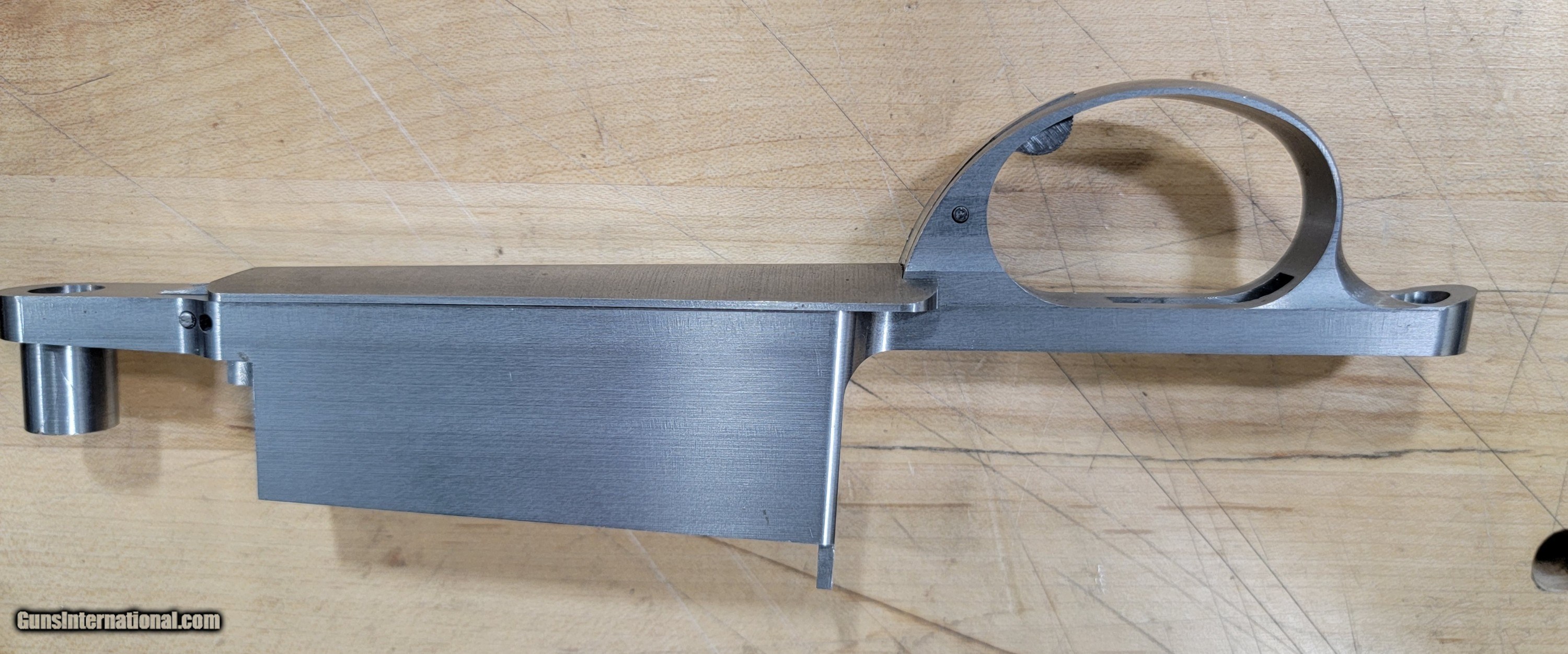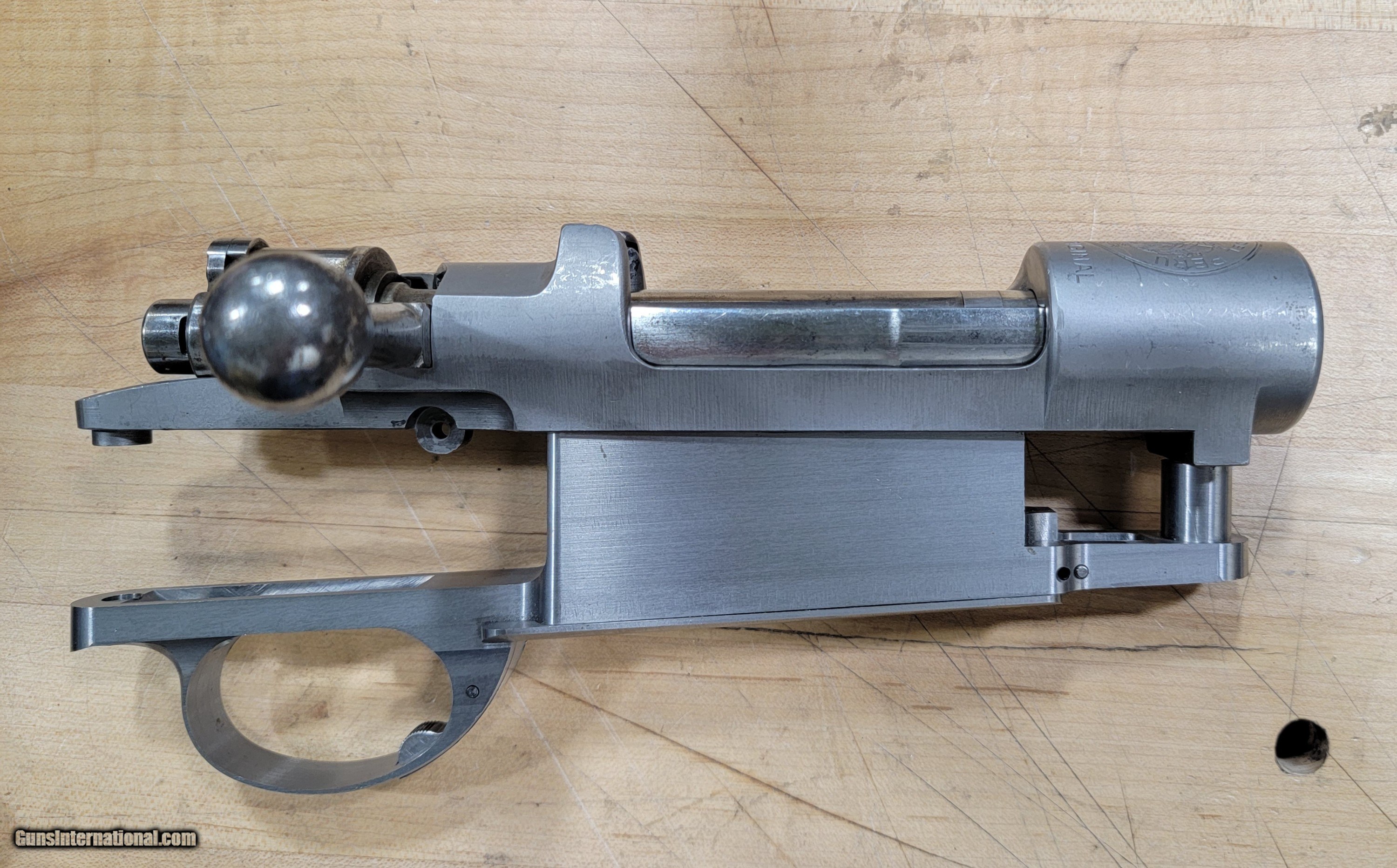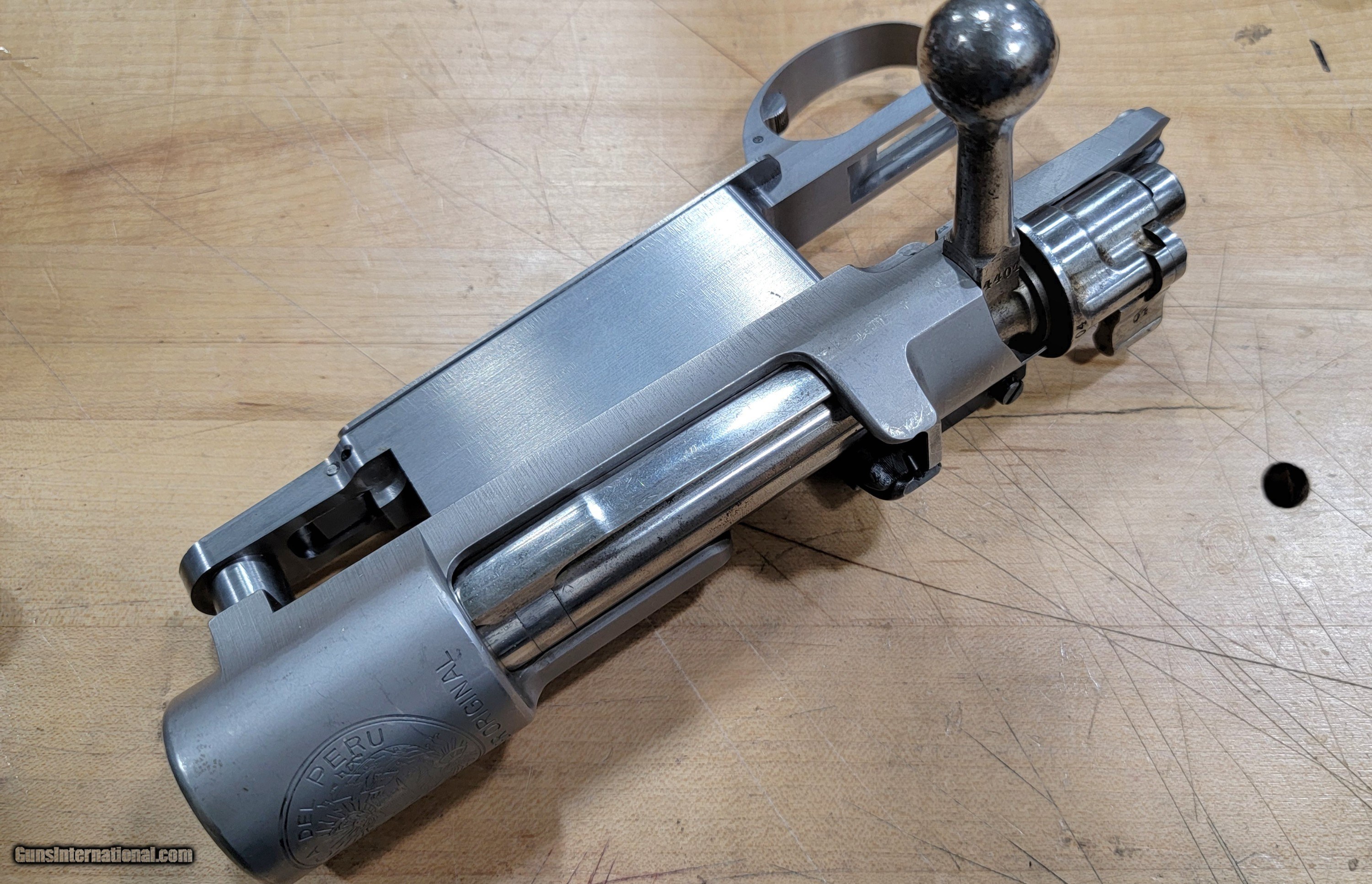 Description: 1909 Peruvian action and NOW with Original Blackburn old/ new stock bottom metal. So many ways to build a fine custom rifle on these Oberndorf made actions. These two that I have availible have had their original small Mauser threads ( .980 dia ) remove and new square or ACME type ( 1.10 x8 )threads precisely . machined in, inside torque shoulder and face of reciever all trued concentric. Both these receivers have been annealed and need to be sent out for re- hardening ( Blanchard in Utah is recommended). All this work was done to achieve the most reliable, rugged, and accurate take down system on a Mauser 98 design. Legendary gunmakers Hartmann&Weiss have used these actions and thread system on their small takedown bolt rifles. Machining the barrel threads must be done precisely for maximum accuracy. Leave the threads full and twist in place or remove approx 50% of threads in reciever and on barrel and achieve a quarter twist, fast and accurate take down. These recievers can be opened up for 30-06 length cart. Even unusual 2 barrel sets. I have built one in 30-06 and 425 Westley Richard's ( take that ) hah hah. Extended tangs and all. I you are concidering building a takedown rifle one of these actions deserve consideration. $1800 per action with one Original Blackburn bottom metal. Thank you, Steve SOLD |