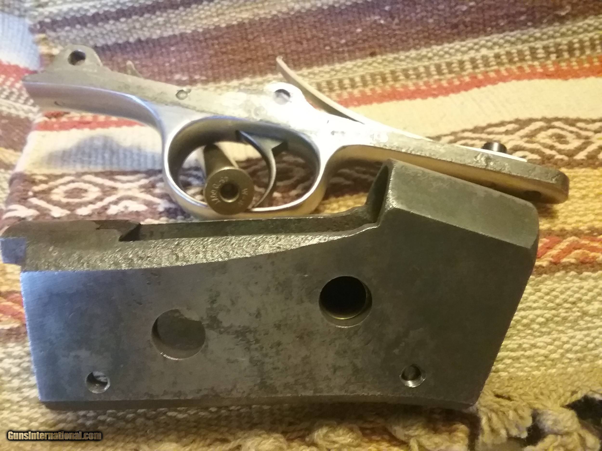 Description: Remington Rolling Block 1 1/2 Receiver, Very hard to find,metal is pitted and upper tang is broken and missing, and could be repaired by a good gunsmith. Lower tang and trigger guard is from a #1 military action and will work in the 1 1/2 action. Sorry don't have any other parts. Shipping will be extra. SOLD |