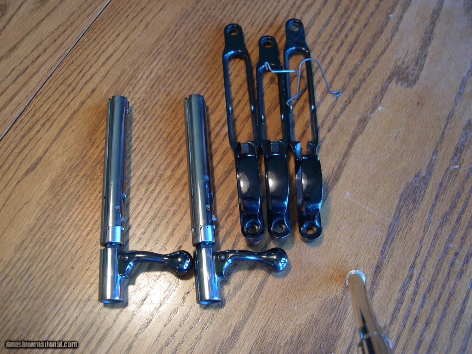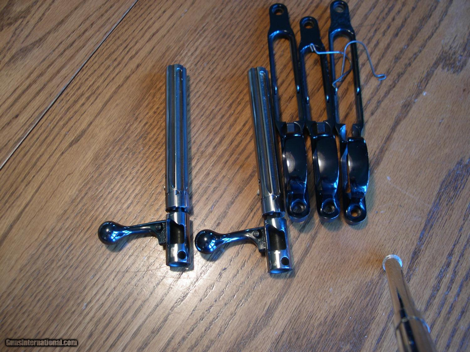 Description: These two Bolts I think would fit Sauer 90's and Colt sauer rifles , they measure 7 1/8" long without the rear portion of bolt, they are ser numbered 10042 and 10101 both are in mint original condition, and come with Sauer Floorplates in the same mint condition, both bolts will need to have the rear portion of them, added to work, these are only the front portion, two of the floorplates are for Magnum rifles and one is for smaller caliber rifles, hope somebody can use them. SOLD |
