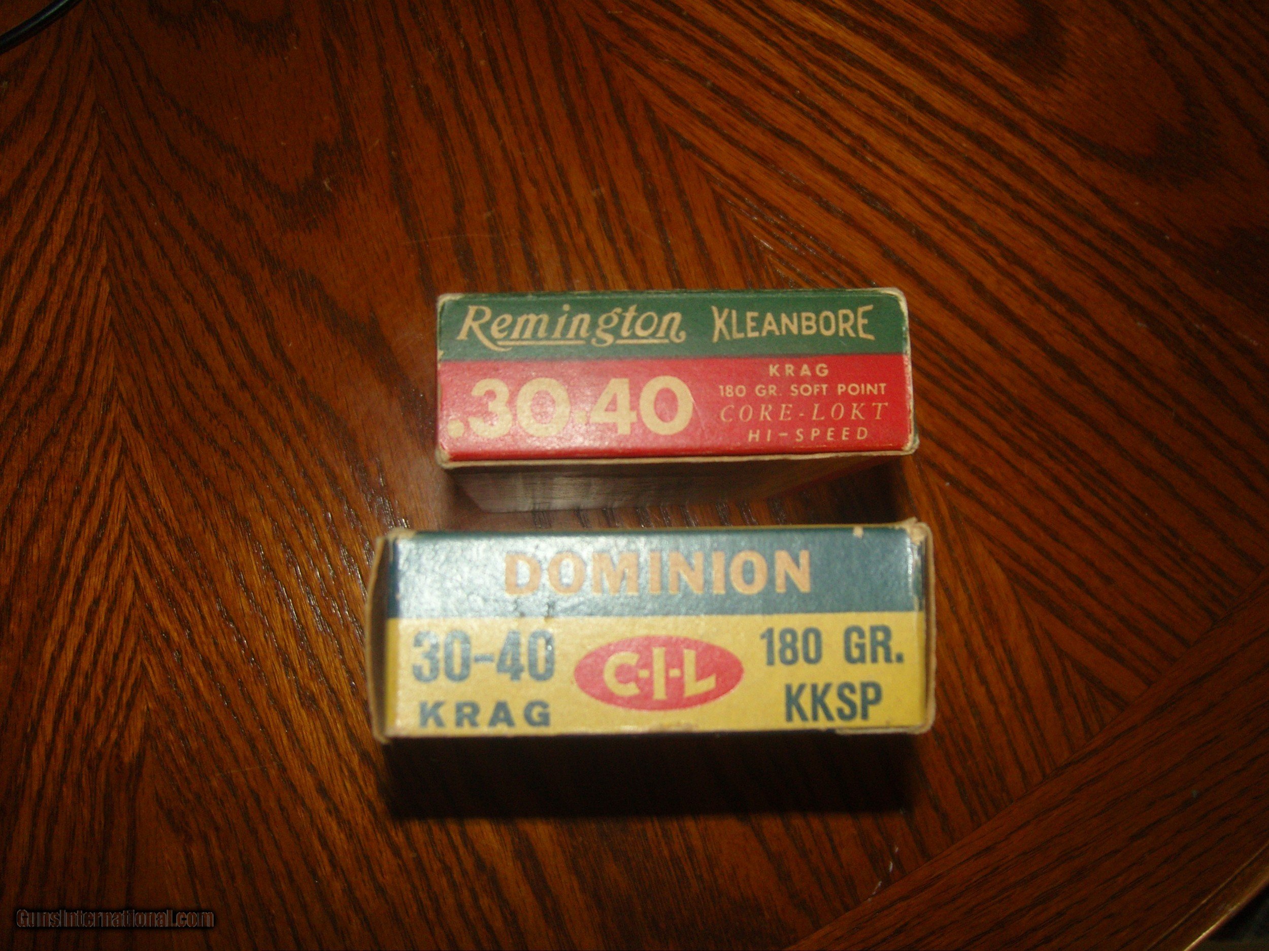 Description: .30-40 Krag, 1 box remington klean bore, 180 grain S/P 17 rounds, box has only some slight corner wear, end tabs mint, only $ 75 1 box Dominion, top flap box, mfg. Canadian Industries Limited (1950s), 180 GR KKSP, box clear picture, near new, ammo mint, only $100 SOLD |