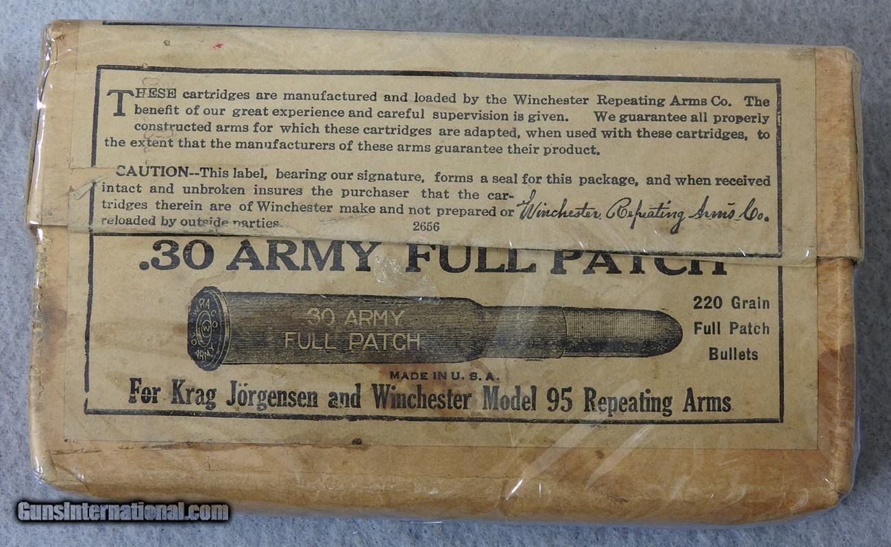 Description: #30 Army Full patch for the Krag Jorgensen and Winchester model 95 rifle. Ths is a Full box made by Winchester and is 220 Grain Full Patch bullets. This is a sealed box in very good condtion. Must ship UPS. SOLD |