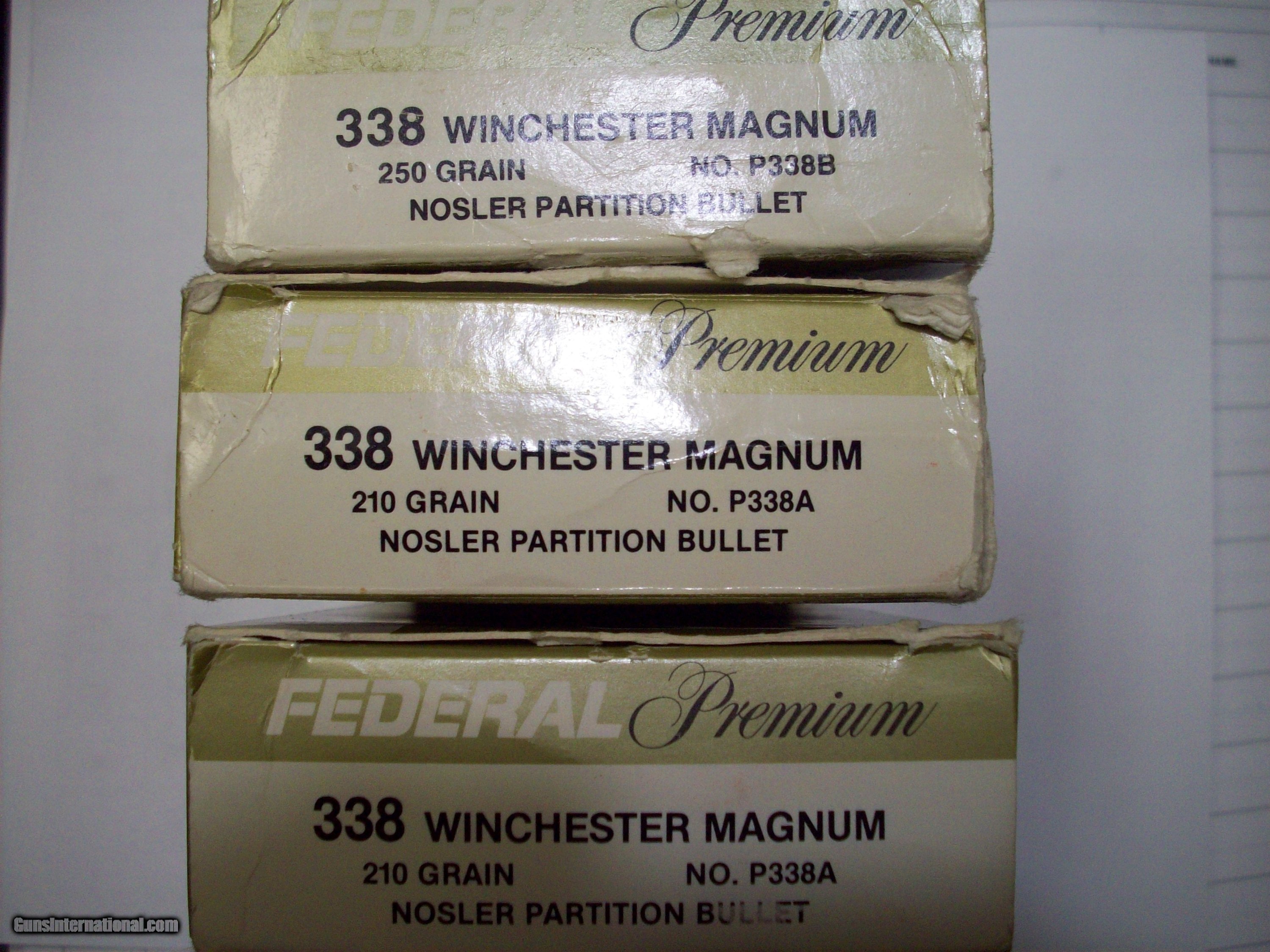 Description: I have THREE boxes of Federal Premium 338 Winchester MAGNUM Ammo. ONE Full Box of 250 grain Nosler Partition, ONE Full Box of 210 grain Nosler Partition and ONE box with 13 rds. 210 grain Nosler Partition. $90.00 a box for the full boxes and SOLD |