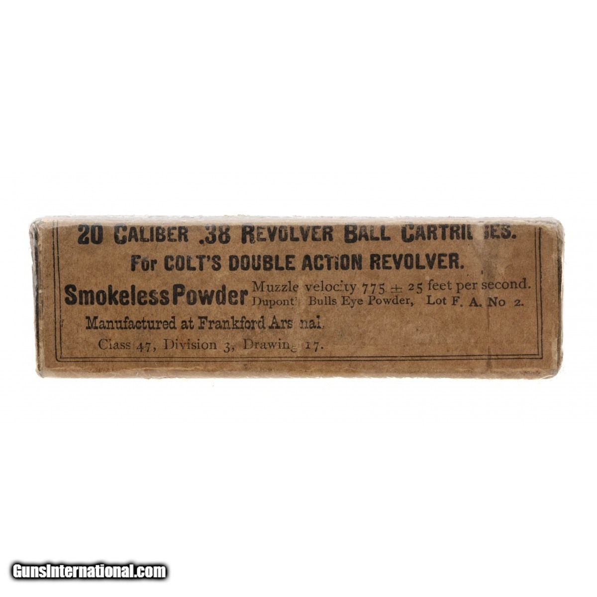 Description: " .38 Caliber Revolver Ball Cartridges""38 long Colt ""For Colt`s Double Action Dated 1913. Full Sealed Box of 20 By Frankford Arsenal. SOLD |