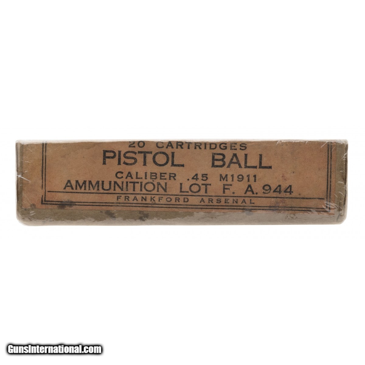Description: " .45 Caliber 1911 Pistol Ball From Frankford Arsenal. Unopened Box of 20rds. SOLD |