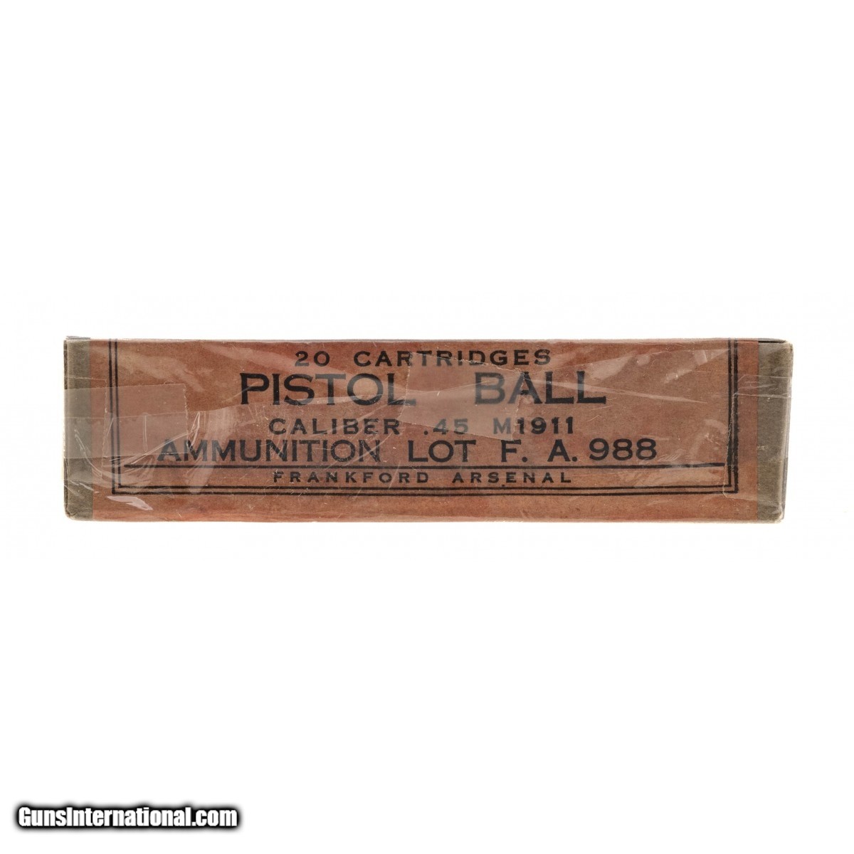 Description: " .45 Caliber M1911 Pistol Ball Ammunition By Frankford Arsenal. Sealed Box of 20. SOLD |