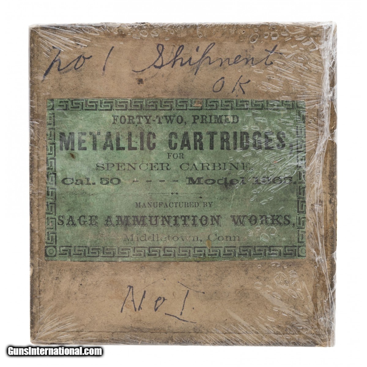 Description: " .50 Caliber Spencer Carbine Primed Metallic Cartridges. 6 Individual Boxes of 7rds each. Made by Sage Ammunition Works. SOLD |