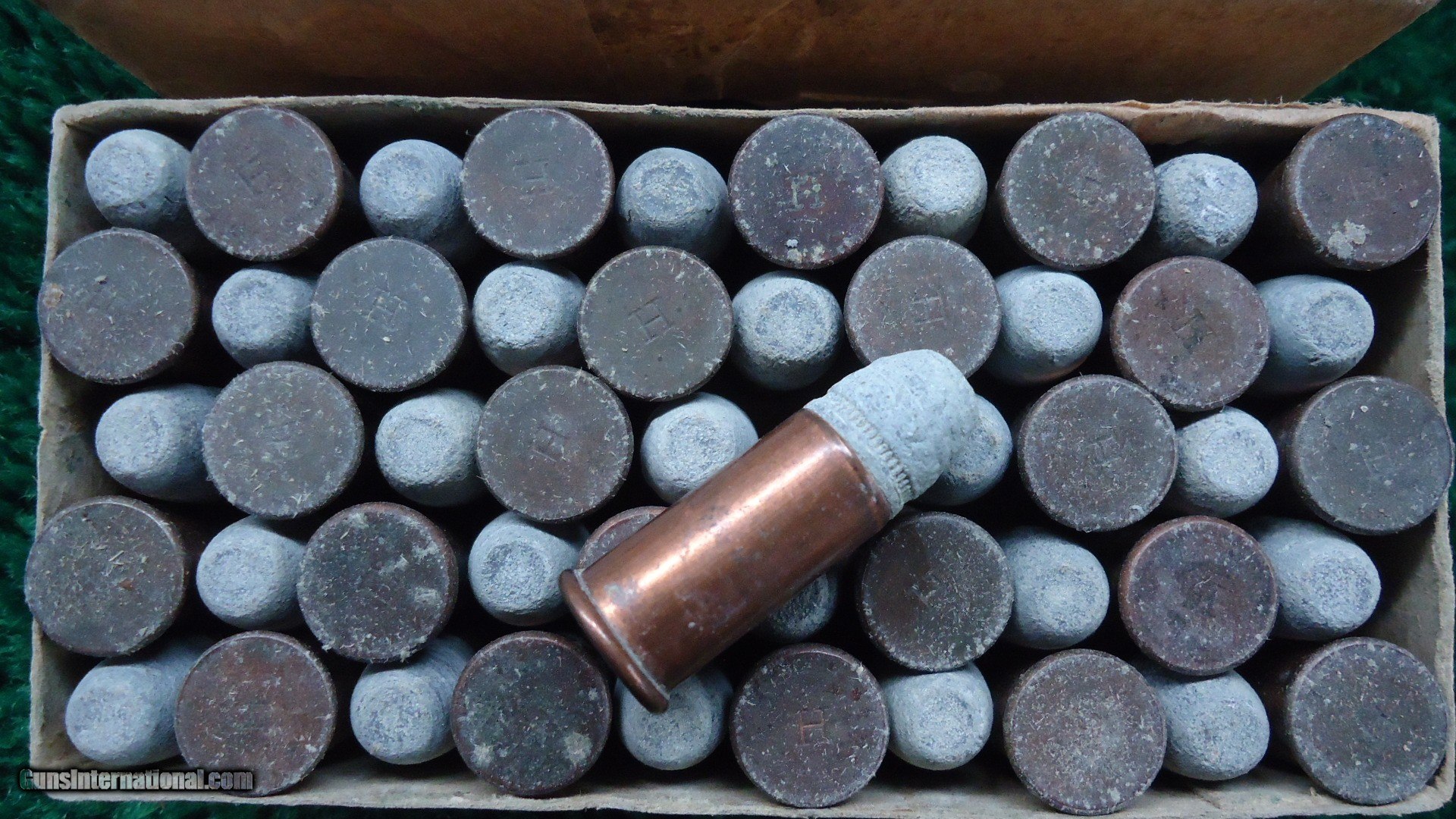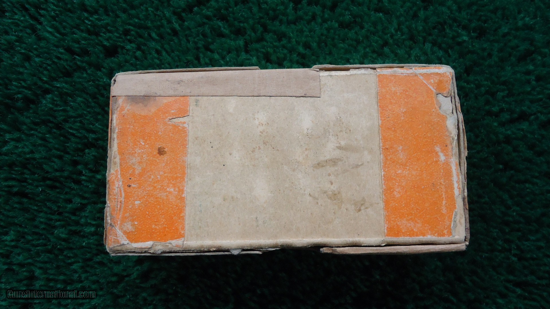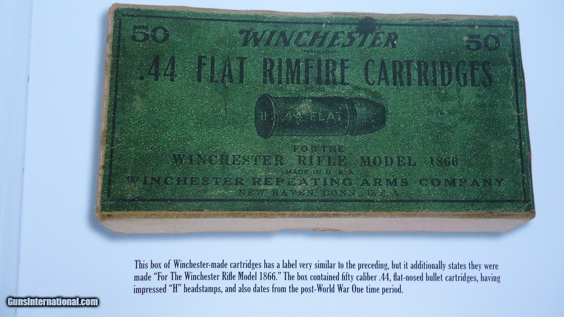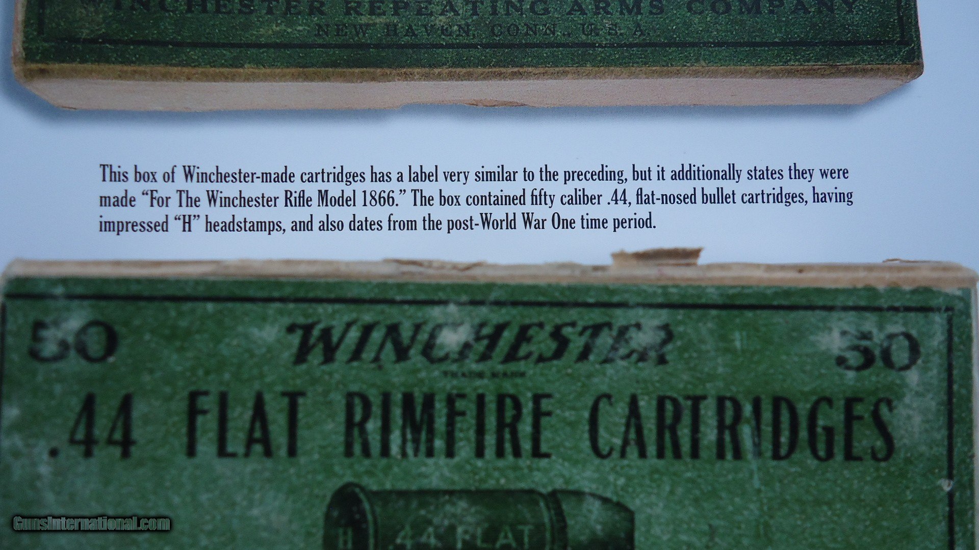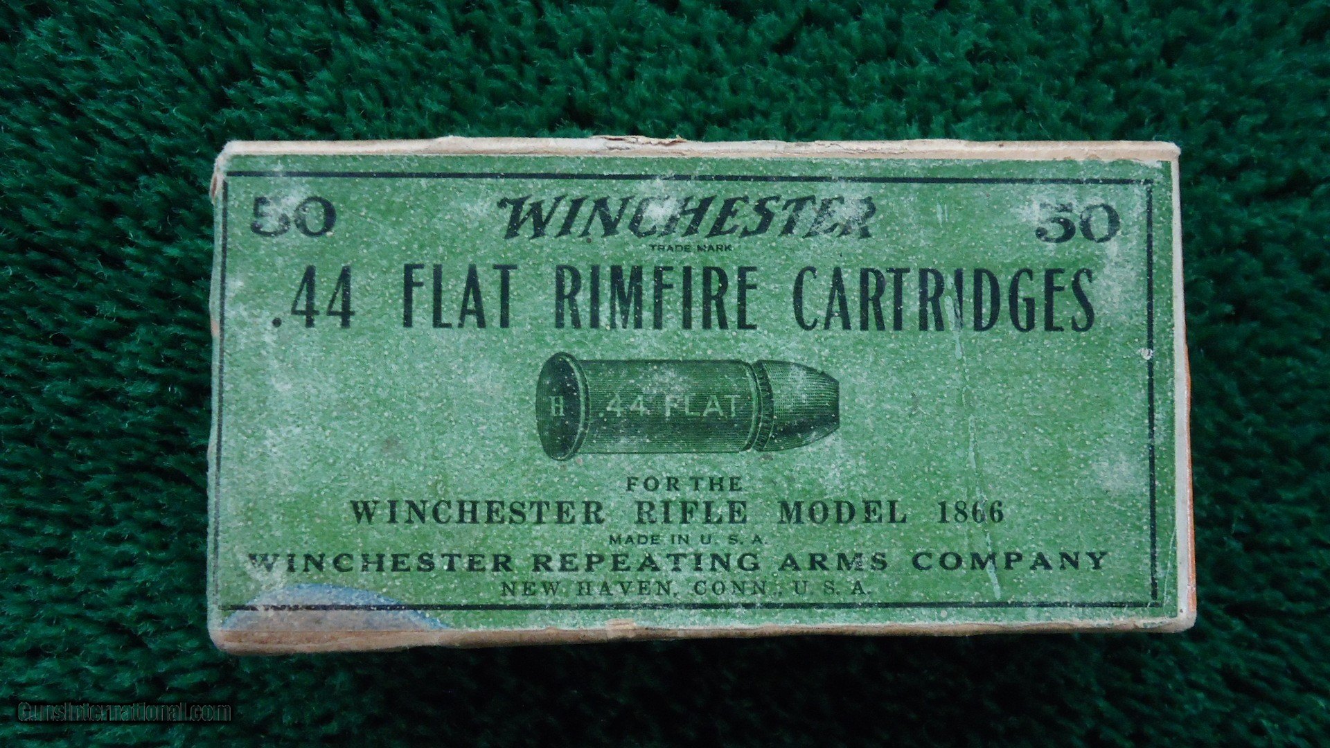 Description: Excellent condition with a green label and orange end flaps. Box states it was made for the Winchester Rifle Model 1866. Full box of 50 cartridges with the "H" headstamp. Good looking box that displays well. Leroy Merz Antique Firearms specializes in antique and vintage Winchesters and other fine American firearms. Since 1965 Mr. Merz has taken part in the world of firearms and has been a contributor to many well known reference books. We have hundreds of additional guns in every price range at our home online. Search for Merz Antiques in google. SOLD Rifle Caliber: .44 Rimfire |