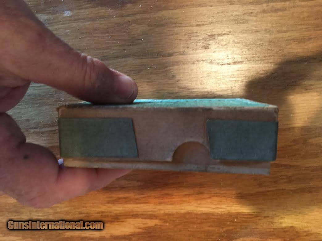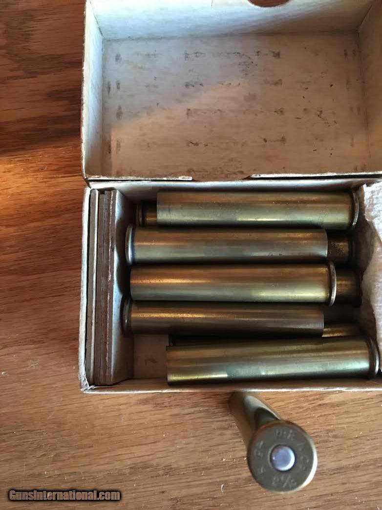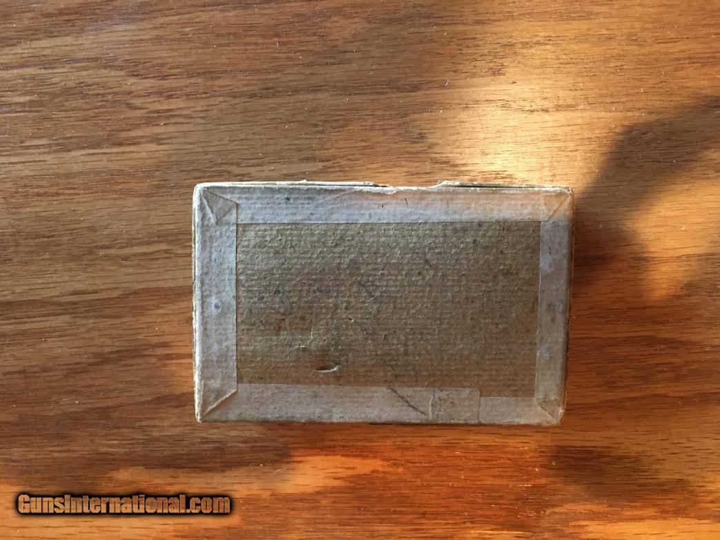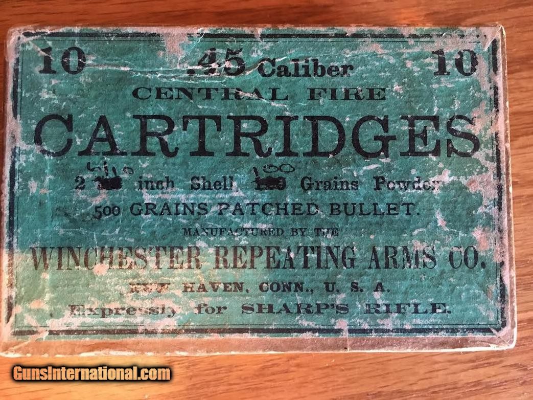 Description: 10 Cartridge box 45 Cal that has exactly the same hand written modifications as the illustration in Giles book Winchester Cartridge Boxes: 2 7/8 modified to 2 6/10 inch shell and 120 Grains Powder to 100--exactly the same. The box is in good condition with some tape, see pics. Cases are head stamped properly with all solid heads suitable for reloading if desired. SOLD SOLD |