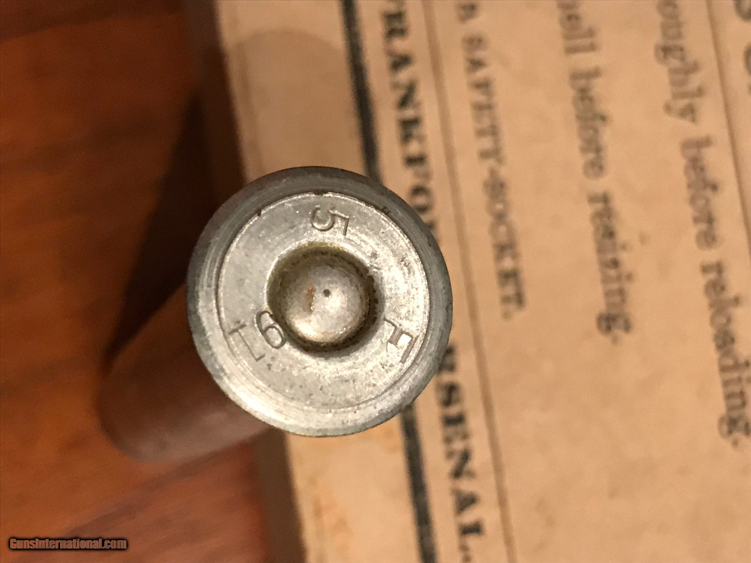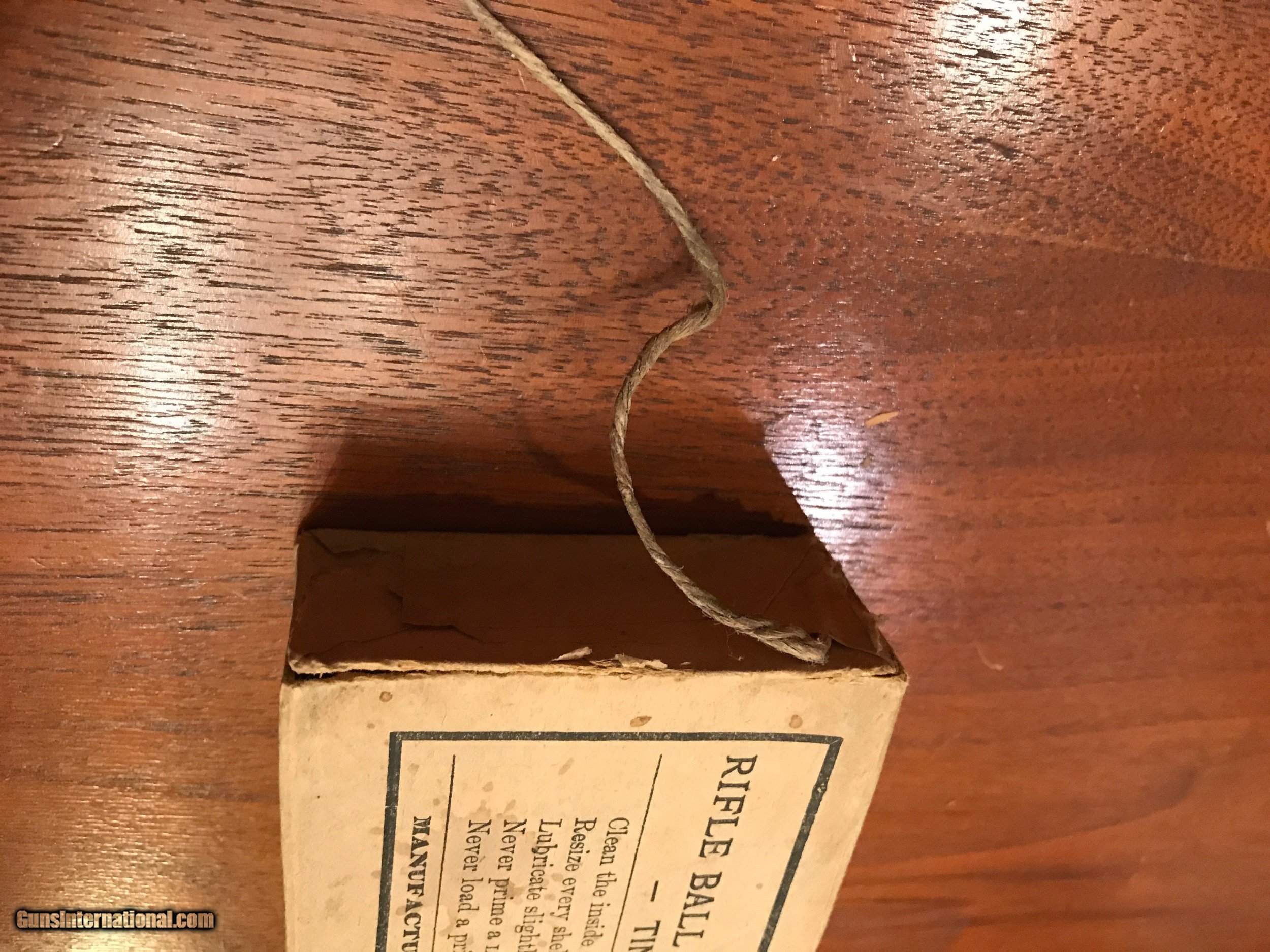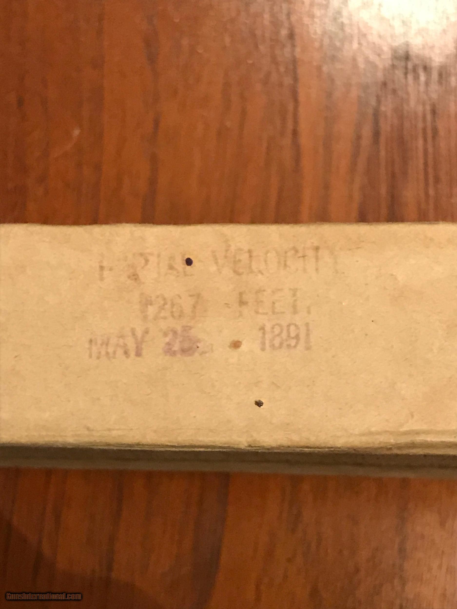 Description: Here is a neat item, a full box of 45-70 loaded ammo, dated May 25, 1891, produced by the Frankford Arsenal. One end is open the other is almost opened and the string loose. These cartridges were an improvement to the Morse cartridge which was designed to be components, but after the cost was found prohibitive, the tinned brass case remained until about 1895-ish, and is referred to as the Model 1888 cartridge. This is nearing the end of the US production of the 45-70 as the 30-40 krag found favor with the Army. The head stamp says F for Frankford Arsenal and 5 91 indicating May 1891 date of manufacture which matches the box date stamp. Shipping will be $12. SOLD |