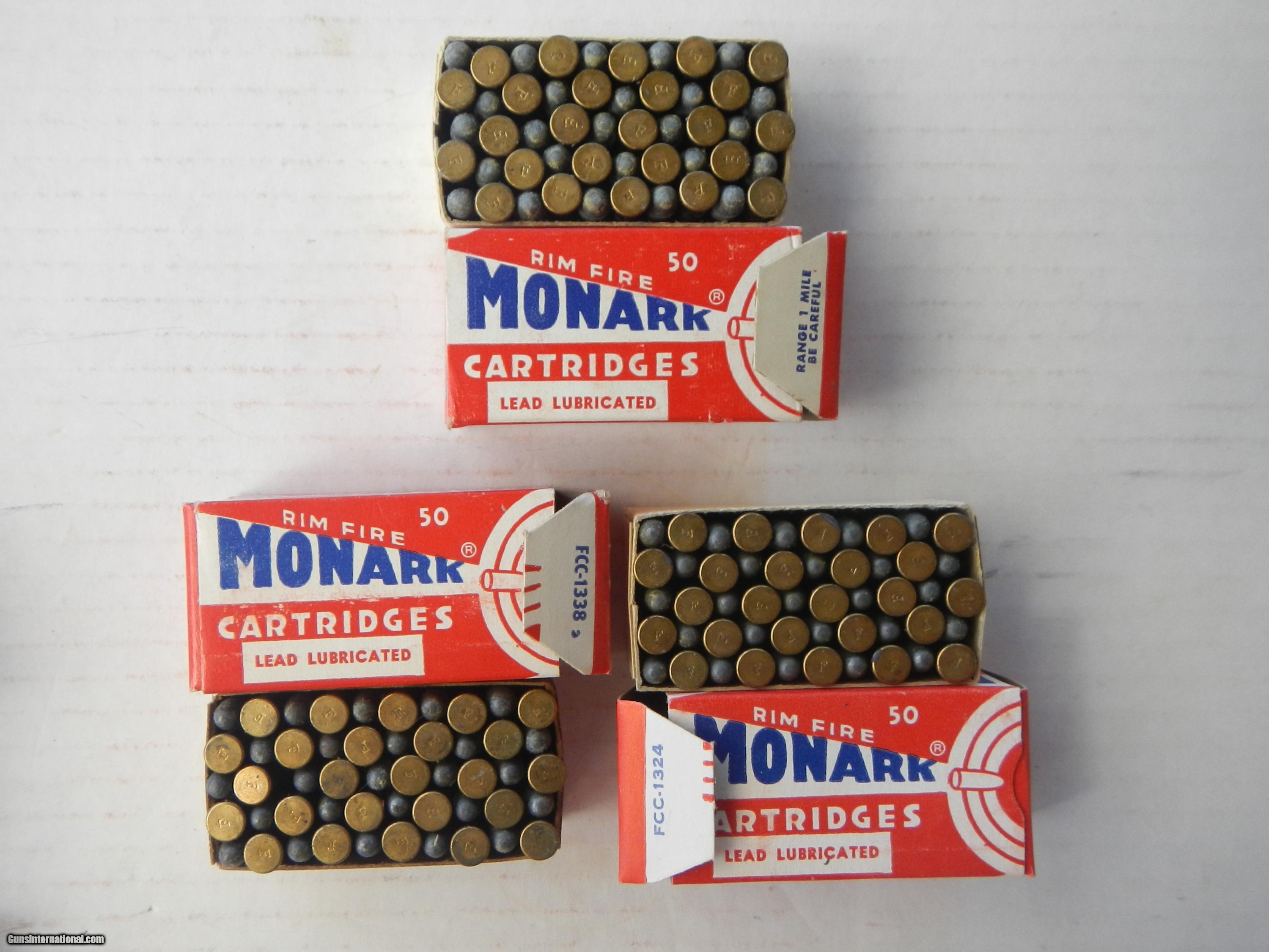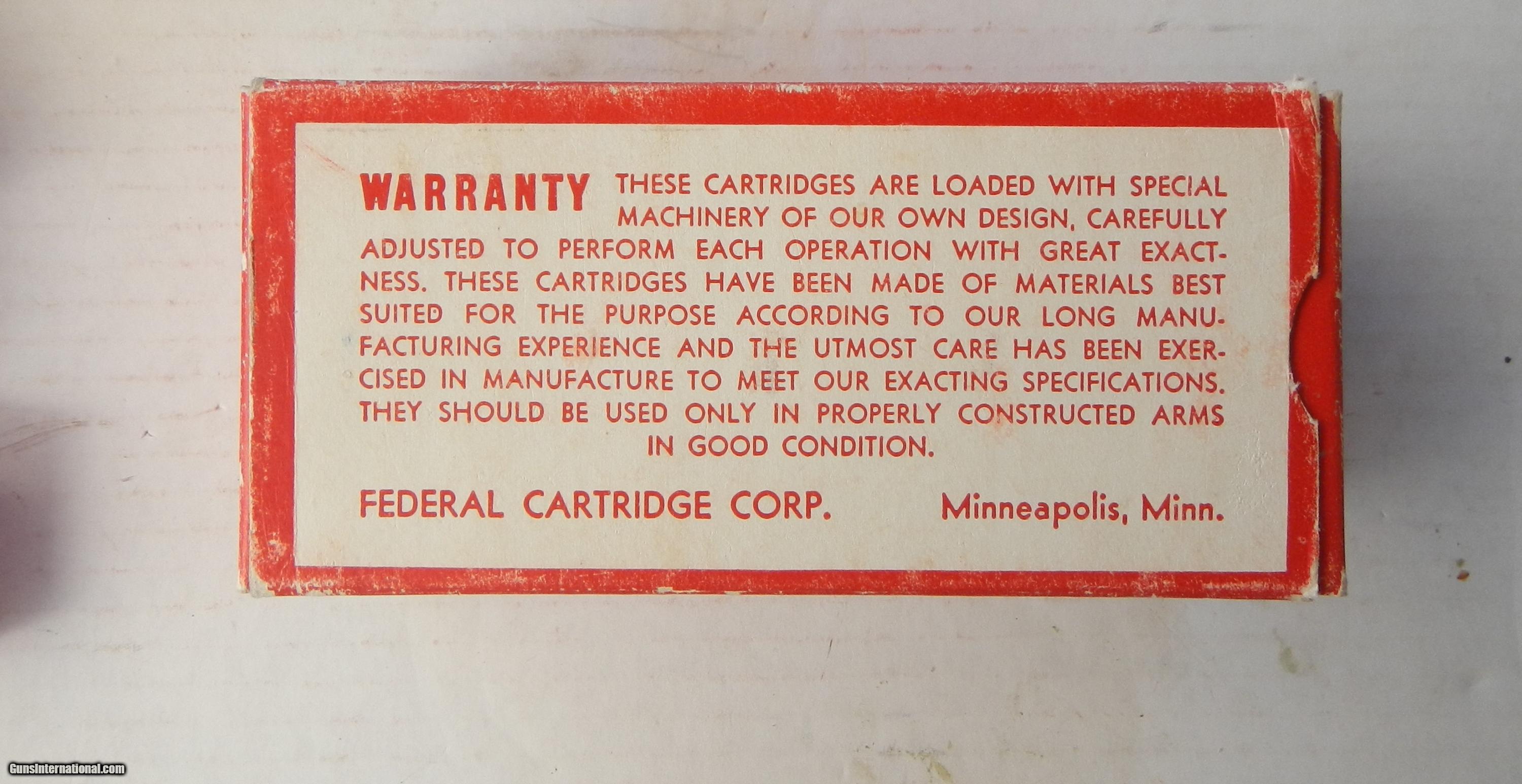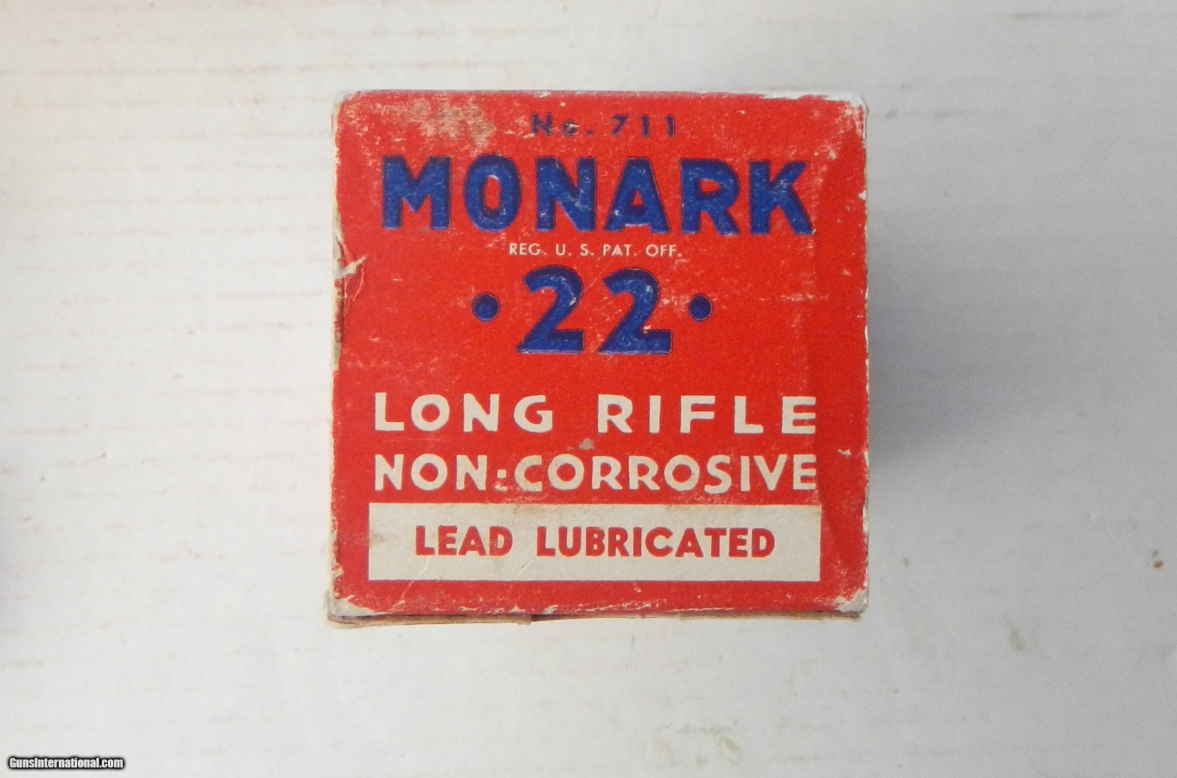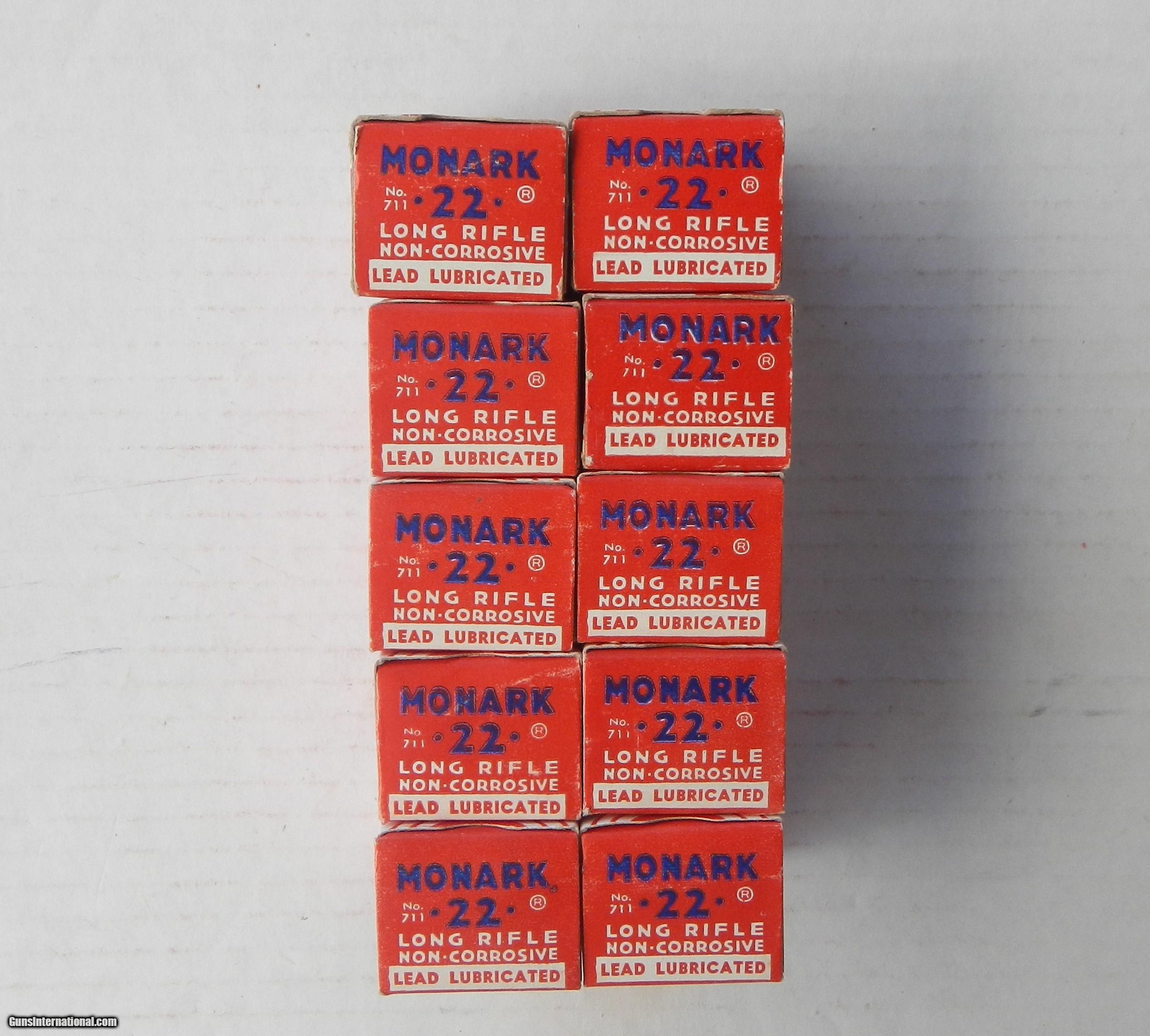 Description: Federal Monark 22 Long Rifle full brick of 10 boxes 50 cartridges each, total of 500 cartridges, box code 711 Lead Lubricated Bullets. Both flaps attached to brick as are the 4 inside locking flaps. The boxes are identical except for some of the end flaps, two have no numbers, having the range caution, one is 1338 the other 7 are 1324. Price includes UPS ground shipping to USA CONUS 48 only. Email me if you have questions about this item. Thanks SOLD SOLD SOLD |