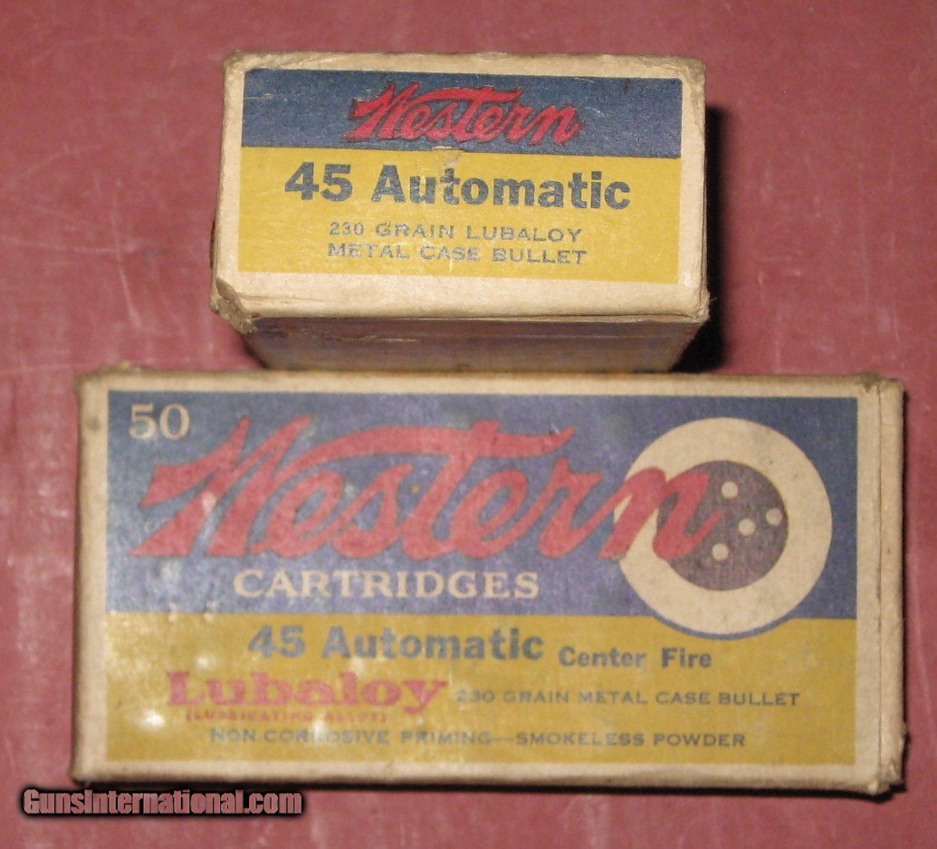 Description: Two full boxes of Western 45 auto 230 grain lubaloy full metal case ammo.Both boxes have the "bullseye" logo and are in very good condition with bright graphics.The ammo is clean and free of corrosion. SOLD |
