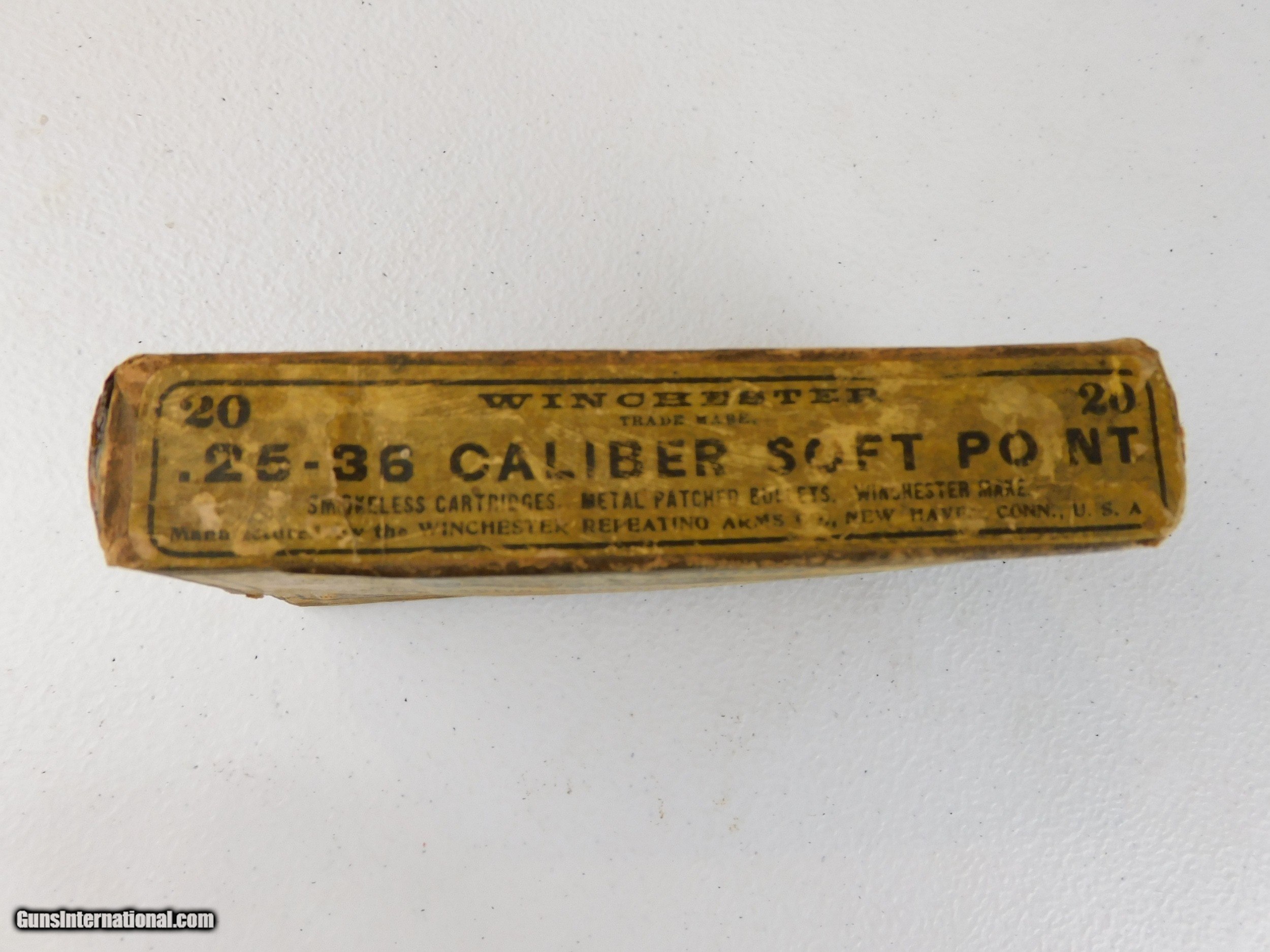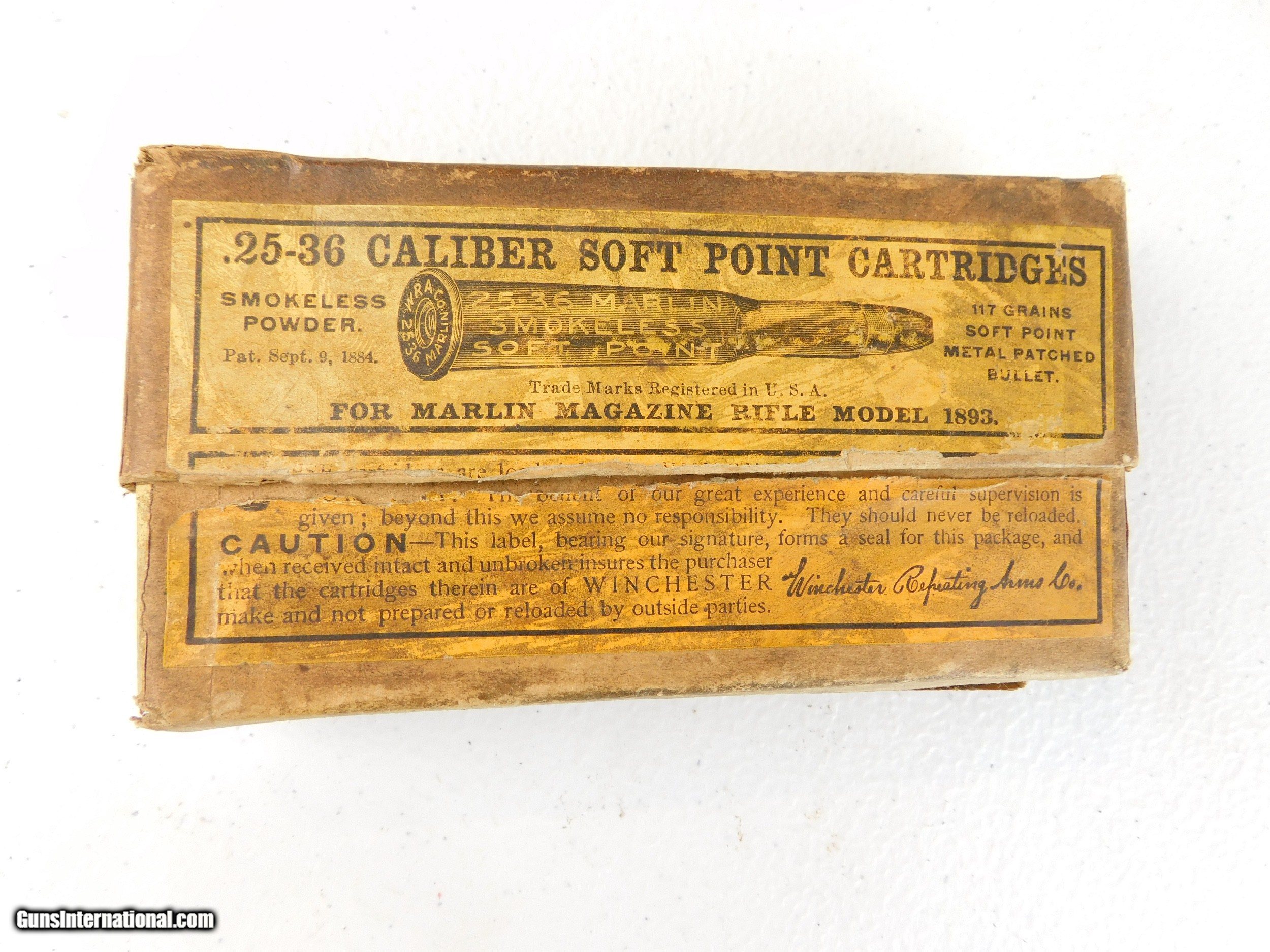 Description: #3874MA 25-36 Marlin, Win. yellow & tan 2 piece 20 rd. box, 117 gr. soft point bullet, box is solid but worn & dirty but cartridges are in good condition, they have protect3ed primer. $40 SOLD Rifle Caliber: .25-36 Marlin |