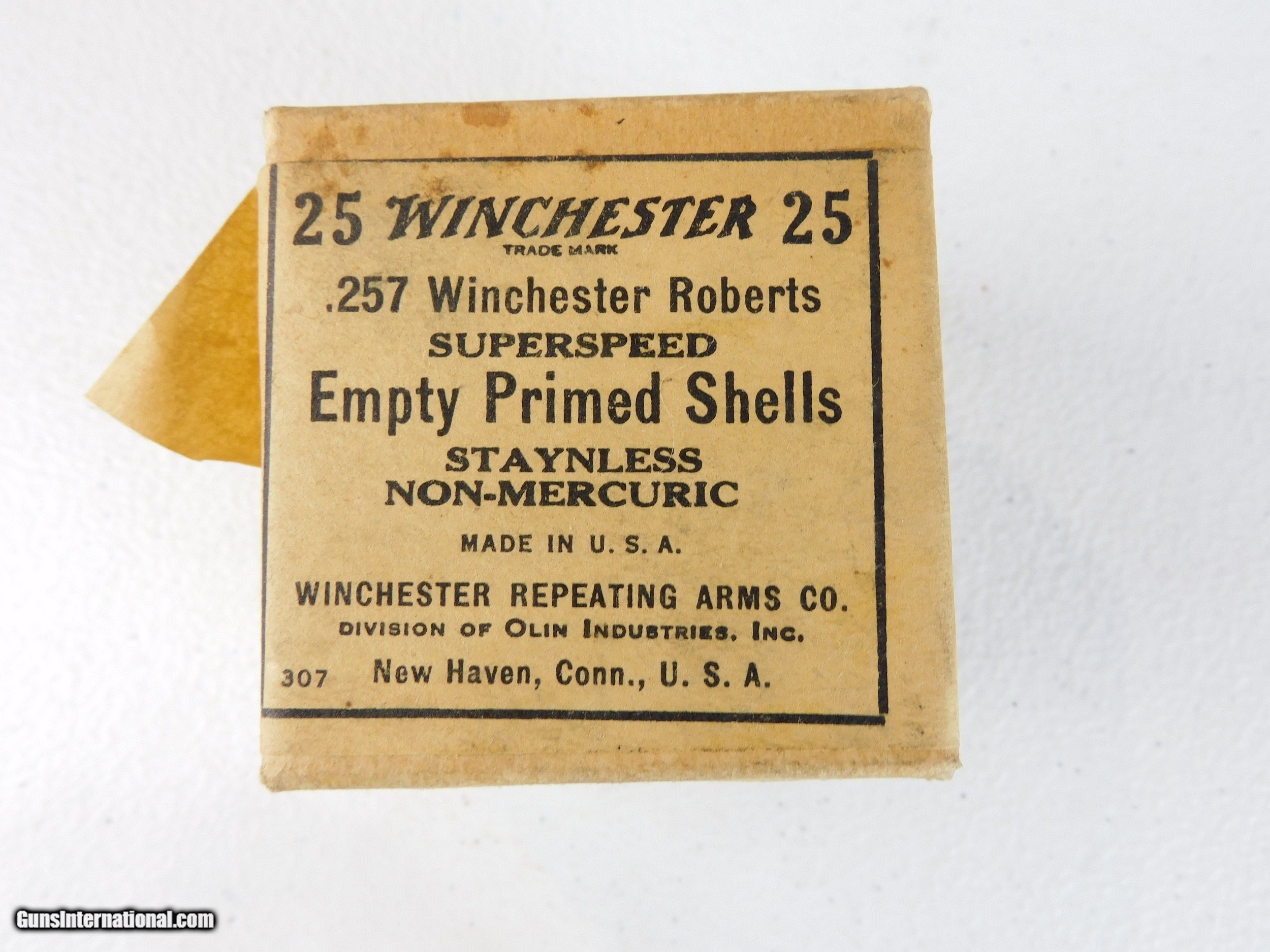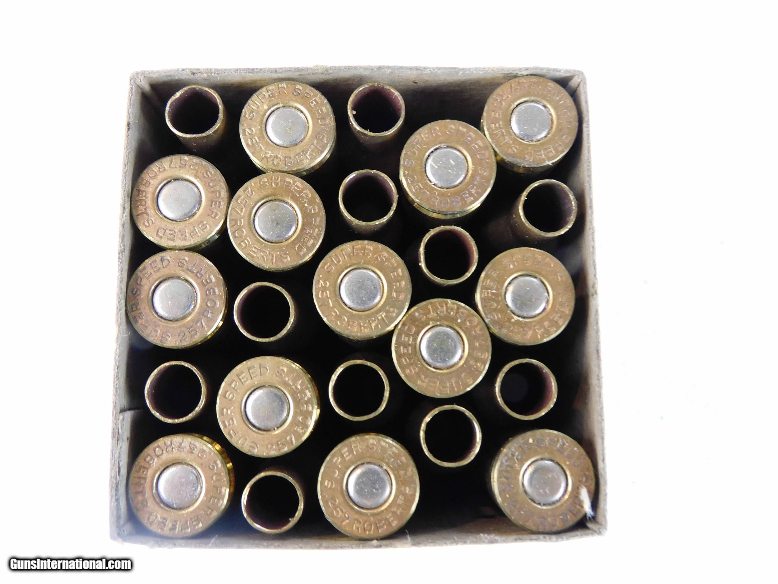 Description: #3867MA 257 Roberts primed empty shells, Win. 25 rd. tan 2 piece box, VG condition, circa 1930s. $45 2 boxes available SOLD Rifle Caliber: .257 Roberts |