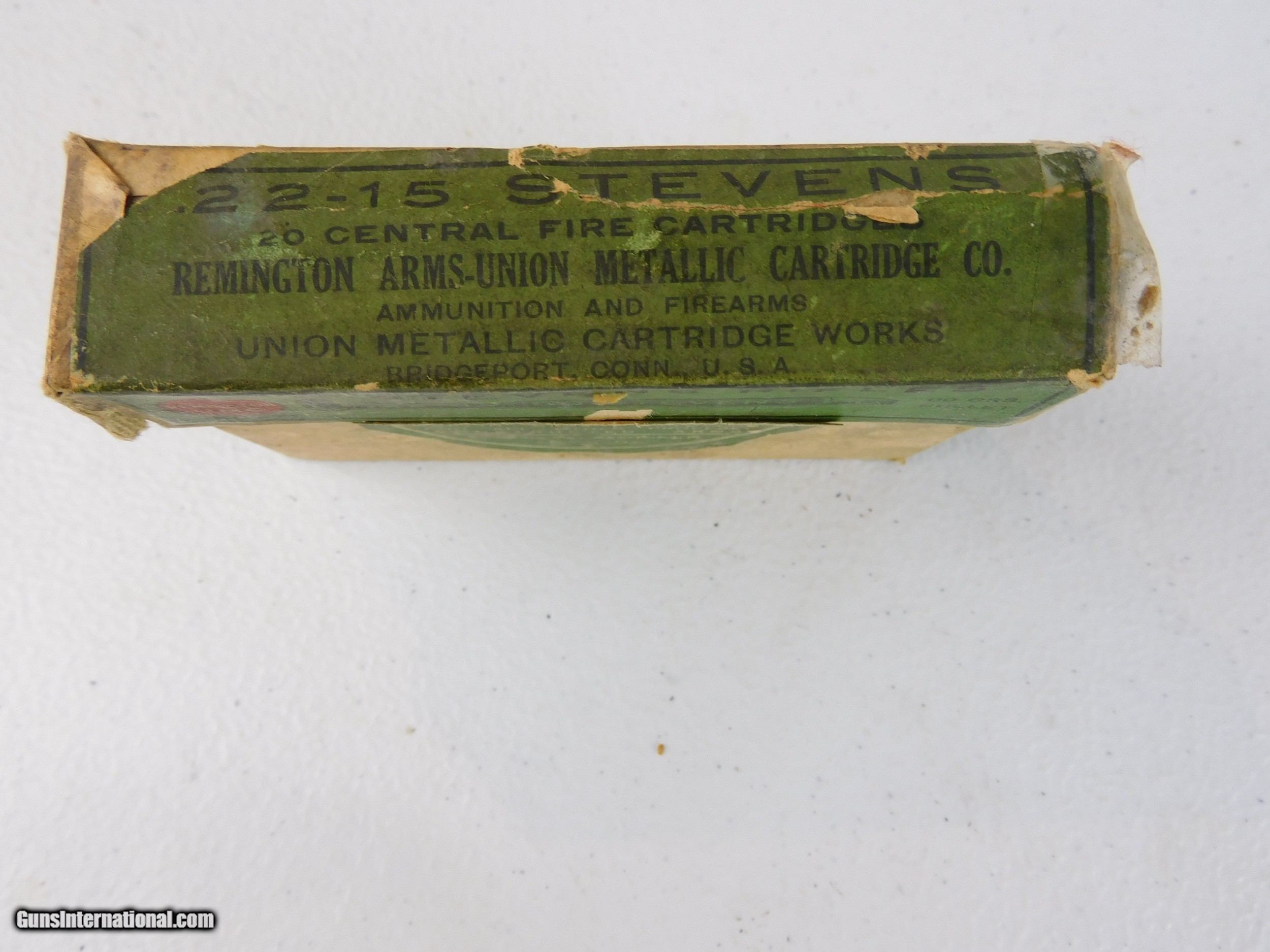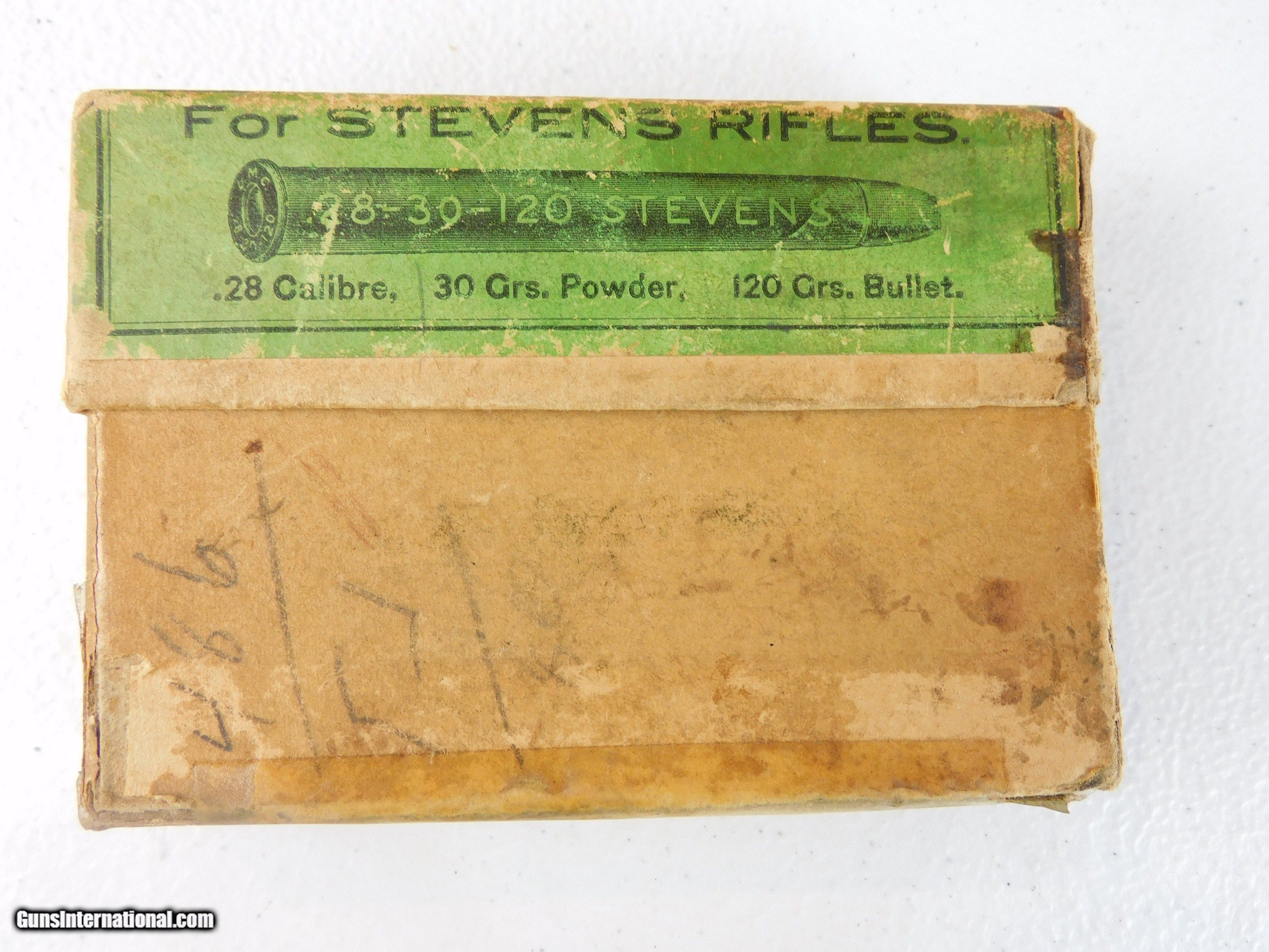 Description: #3848MA 28-30-120 Stevens, UMC green & tan 20 rd. 2 piece box, lead bullet, circa about 1919, good condition. $195 SOLD |