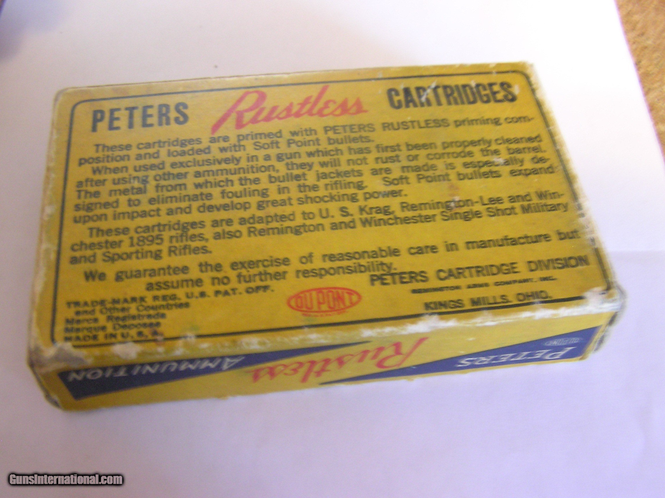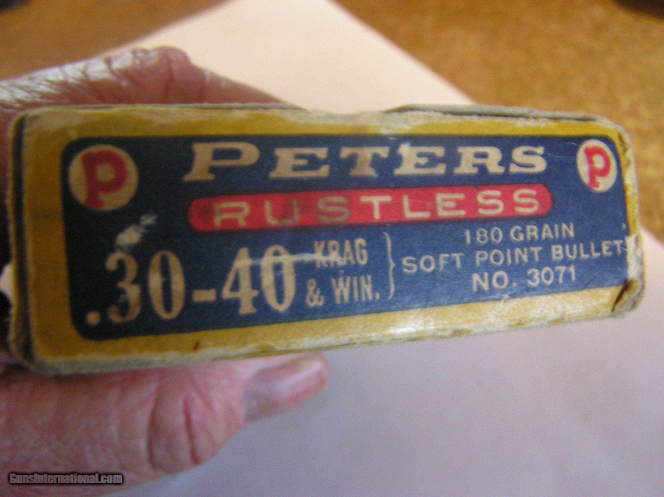 Description: 30/40 Krag Peters "Rustless" 180 gr in decent box..10.00 S&H to the lower 48.Sorry for the fuzzy pictures, the box and lettering are much sharper than this and better condition than shown SOLD Rifle Caliber: .30-40 Krag |