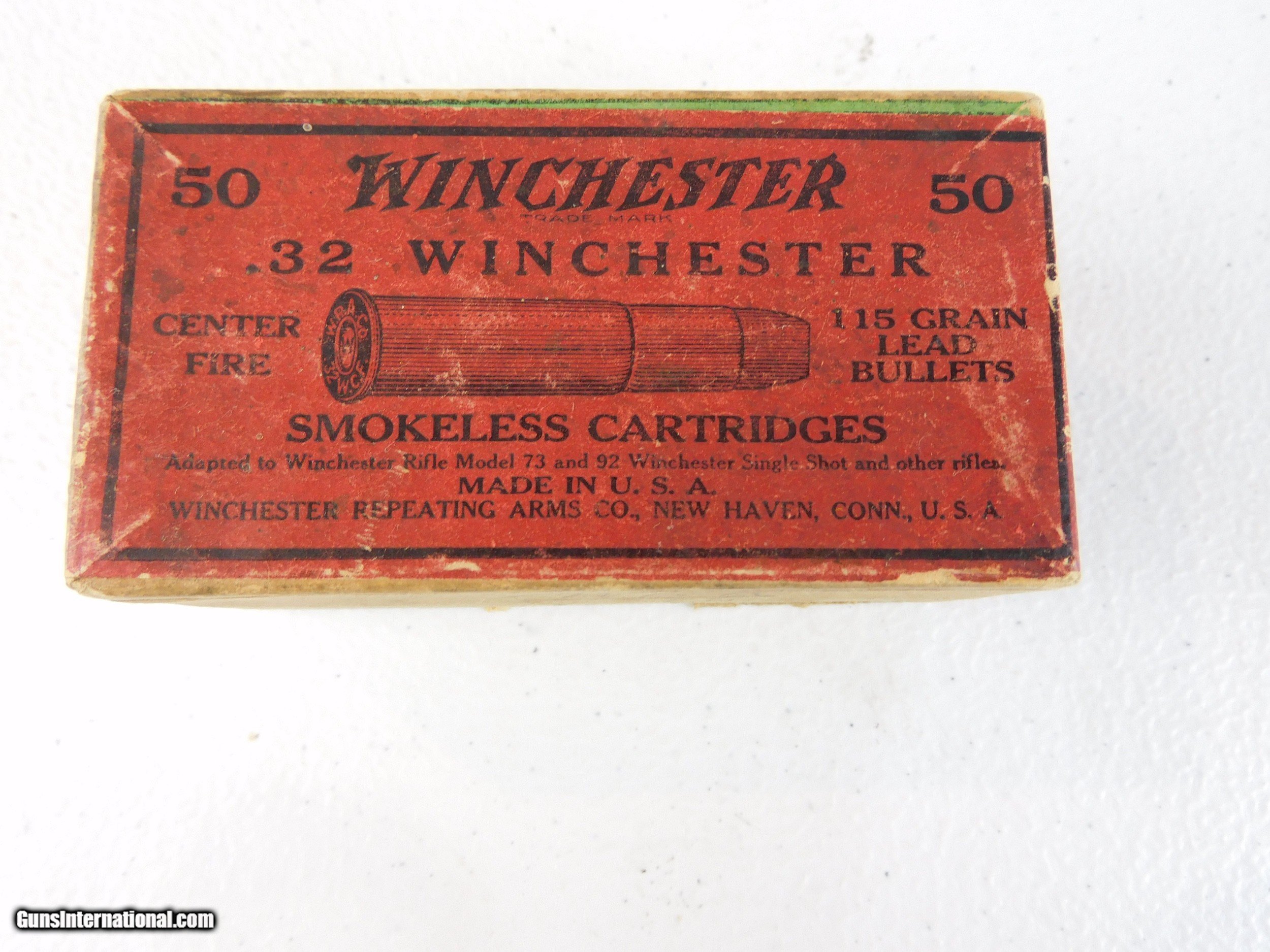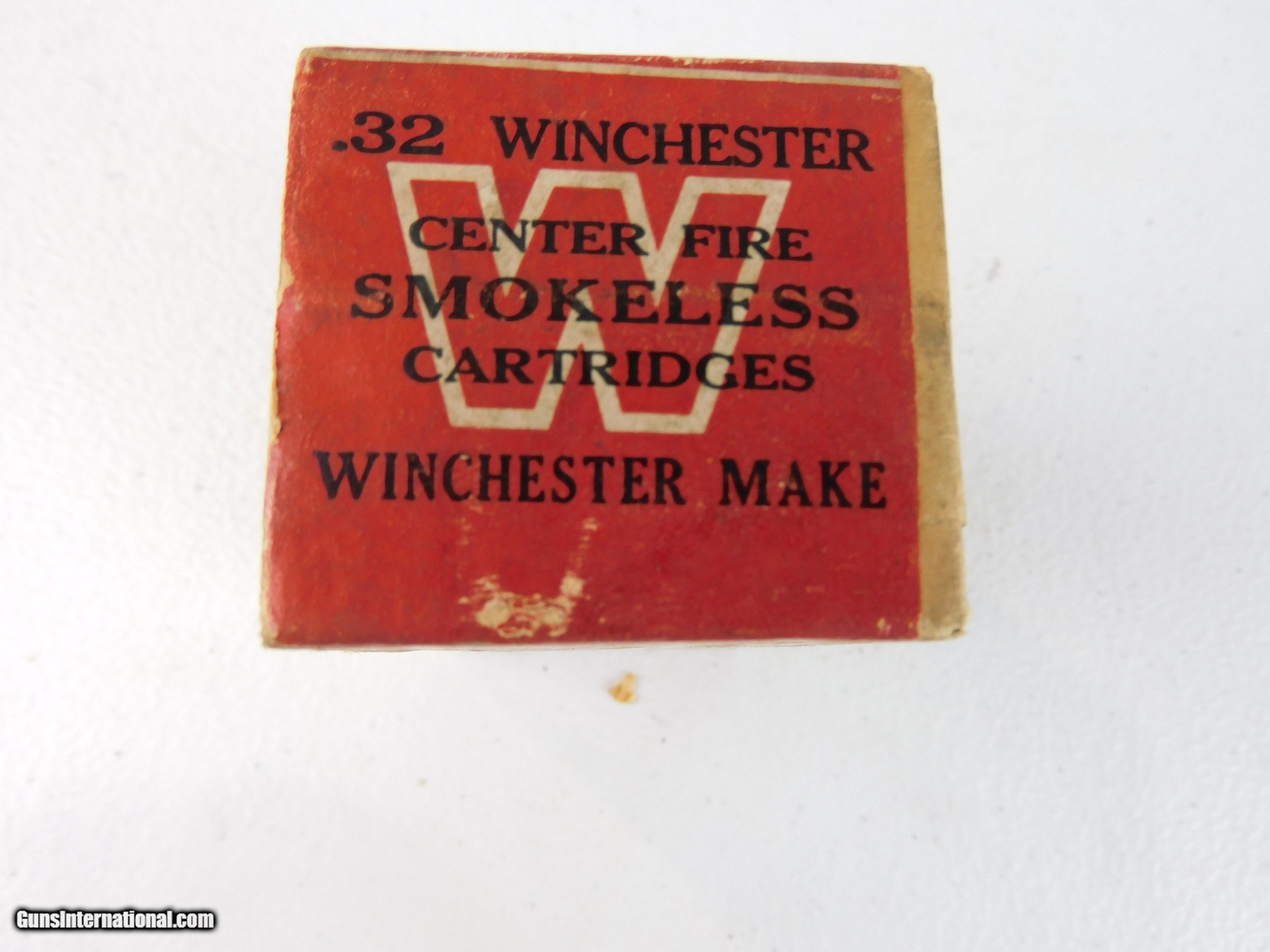 Description: #3837MA 32 Win. (32-20) in Win. tan 2 piece 50 rd. box with red label, factory sealed, smokeless powder, marked “Adapted to 73 and 92 rifles”, circa early 1900s, in VG condition. $165 SOLD Rifle Caliber: .32-20 Winchester |