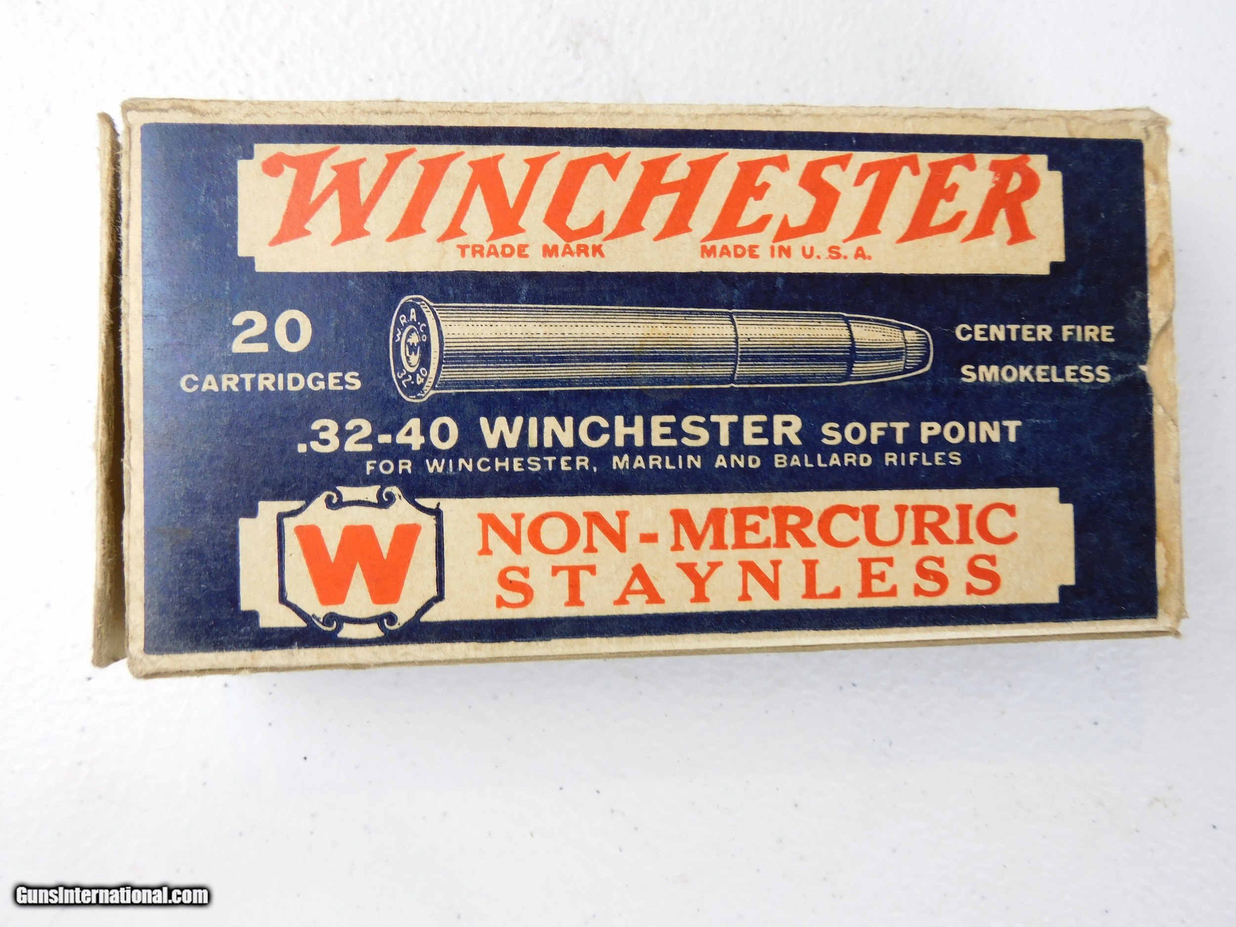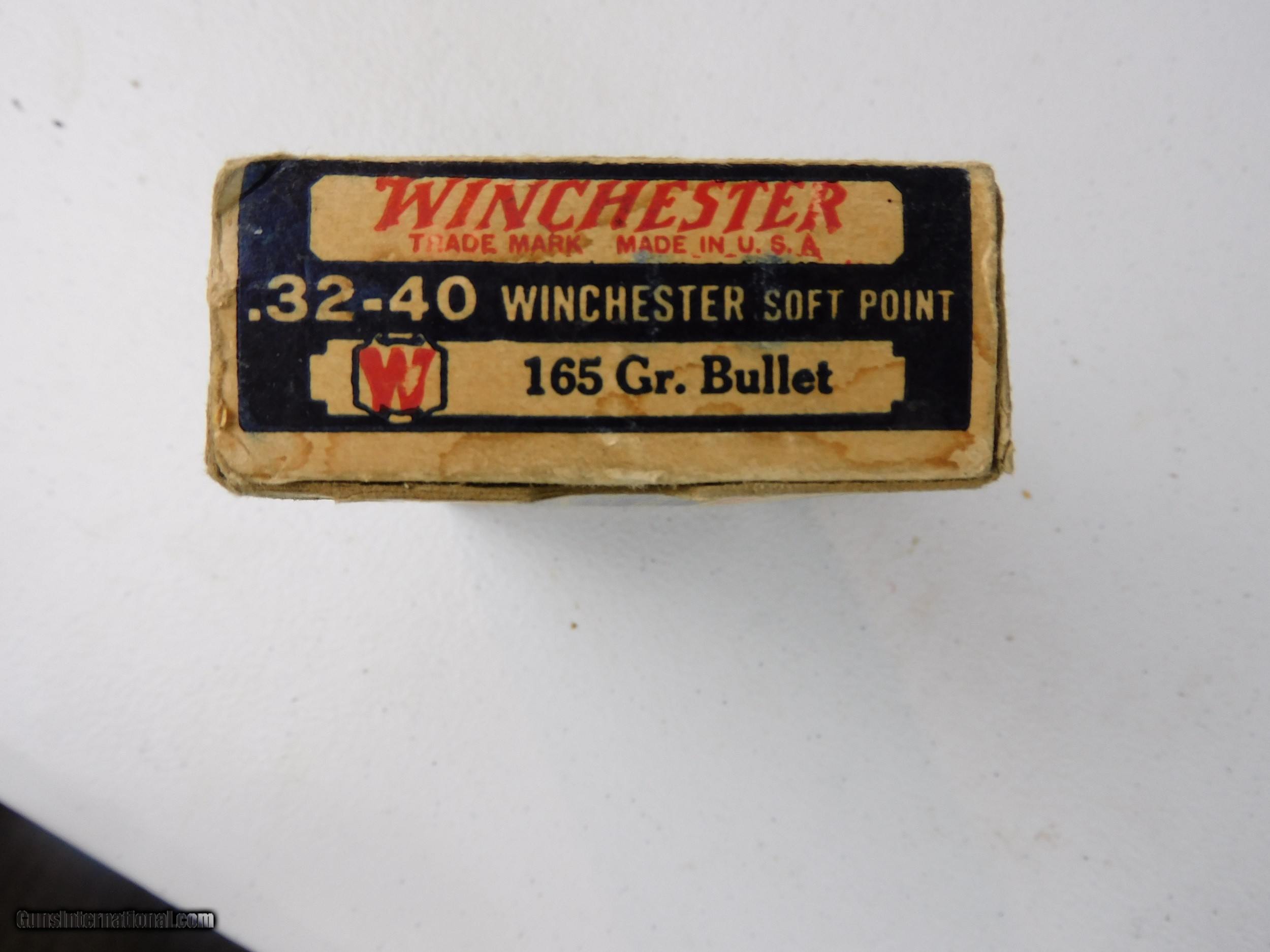 Description: #3893MA 32-40 Win. CF cartridges, Win. 20 rd. blue & white box, one end flap is loose, good condition. $40 SOLD Rifle Caliber: .32-40 Winchester |