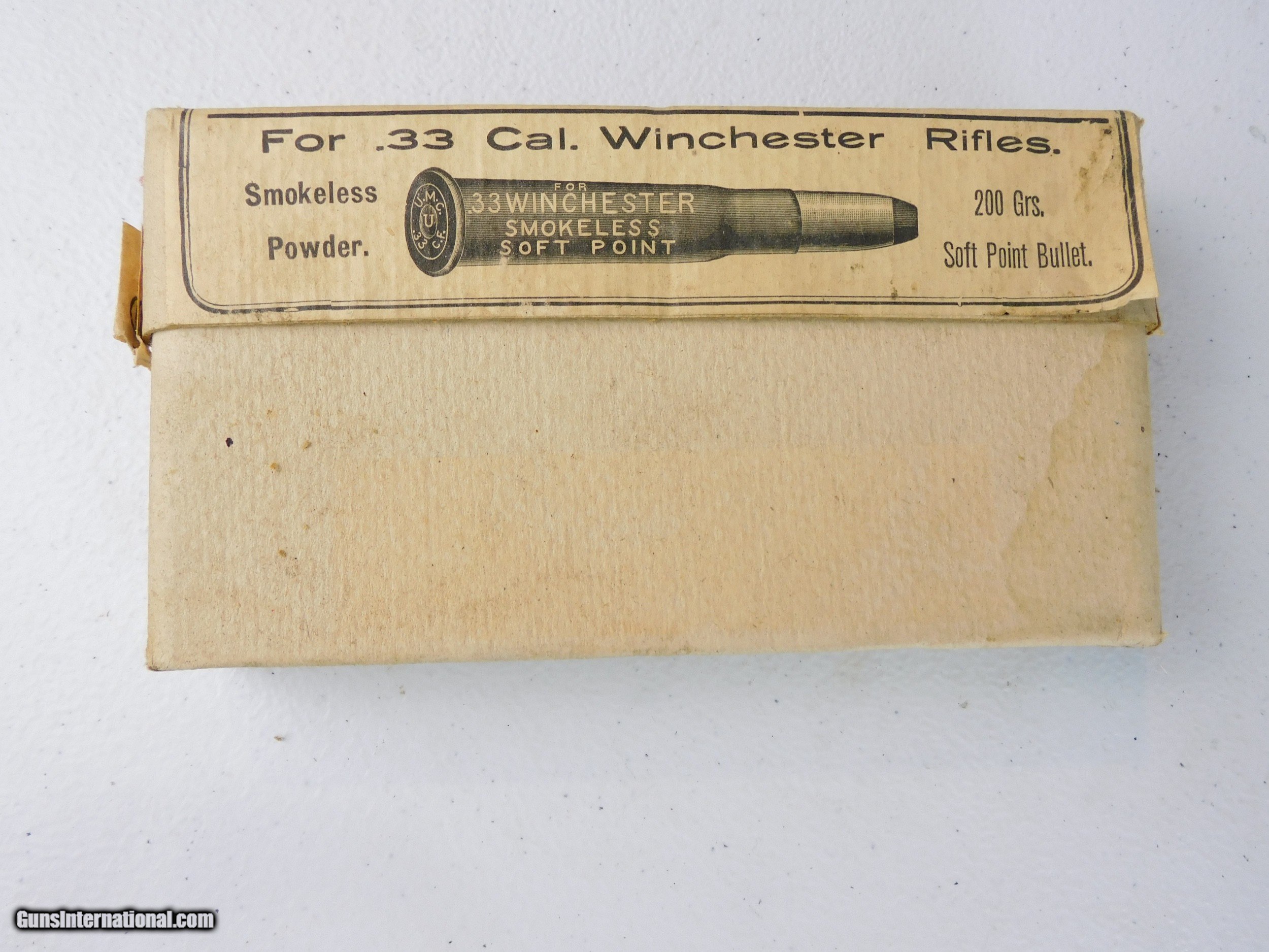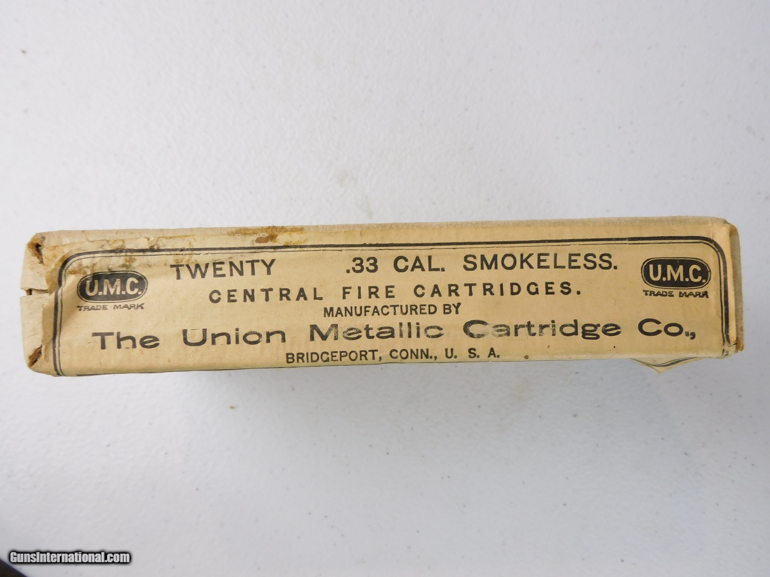 Description: #3885MA 33 Win. 200 gr. SP cartridges in UMC 20 rd. tan 2 piece box in VG condition, circa 1930s, very early. $100 SOLD |
