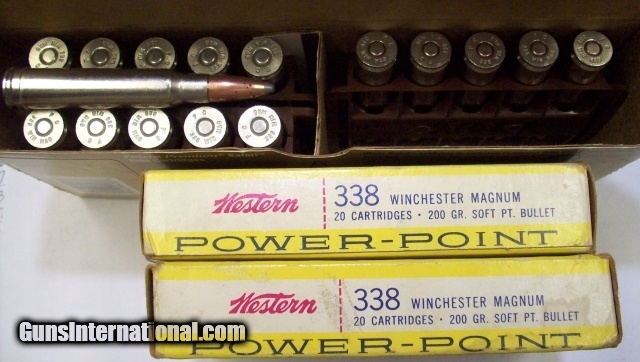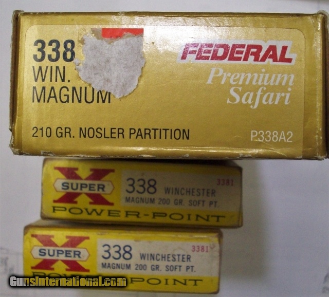 Description: I have THREE boxes of 338 Winchester MAGNUM ammo. The Western ammo is TWO FULL boxes of 200 grain Soft Point. $55.00 a box. The third box is Federal PREMIUM 210 Grain Nosler Partition with 16 bullets. 4 missing. $45.00 for the box. rmgrigolet SOLD |