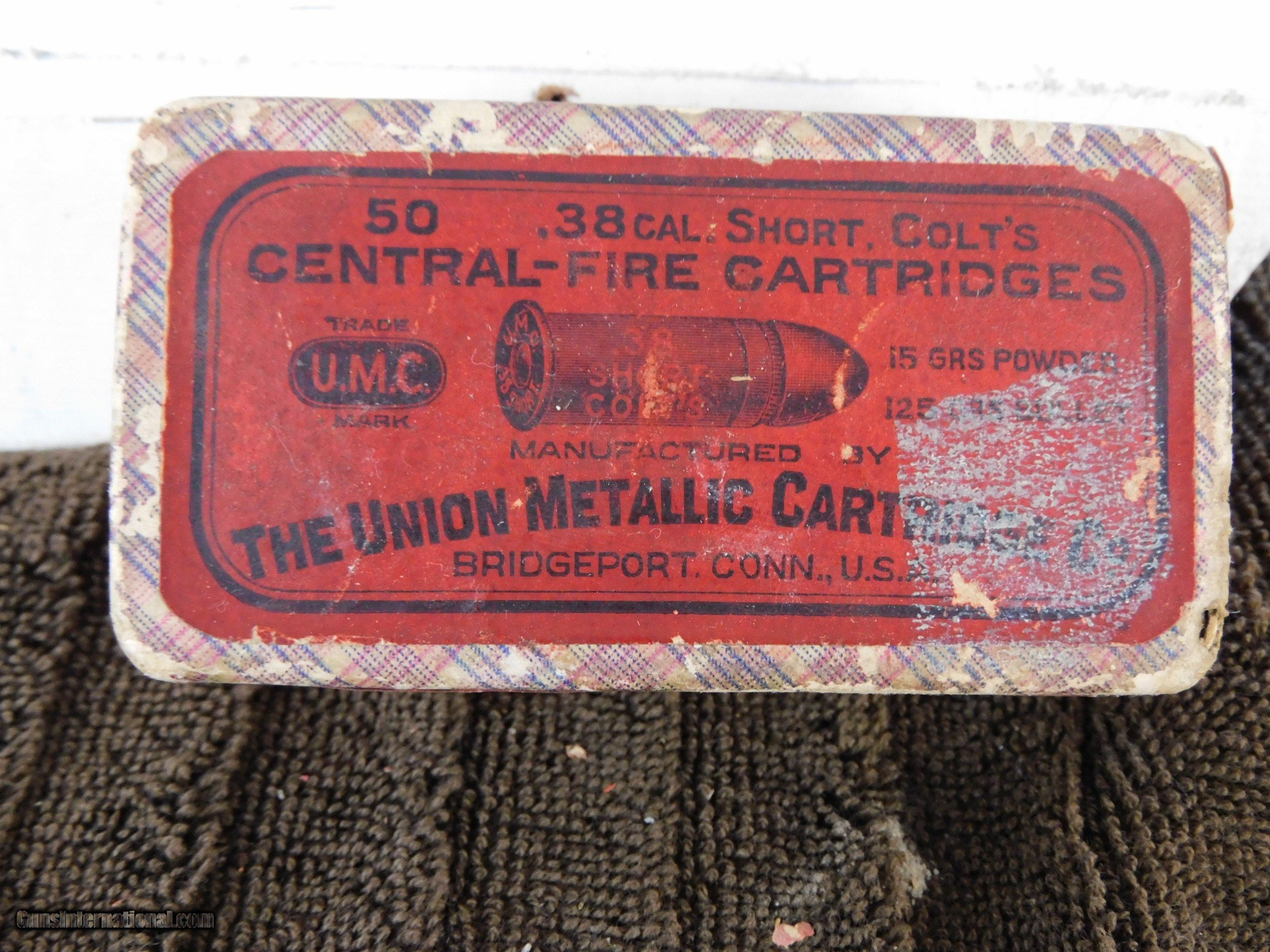 Description: #3973MA 38 CF short Colt in UMC red 50 rd. 2 piece box, fair to good condition, circa about 1900, mixed lot. $80 SOLD Handgun Caliber: .38 Short Colt |