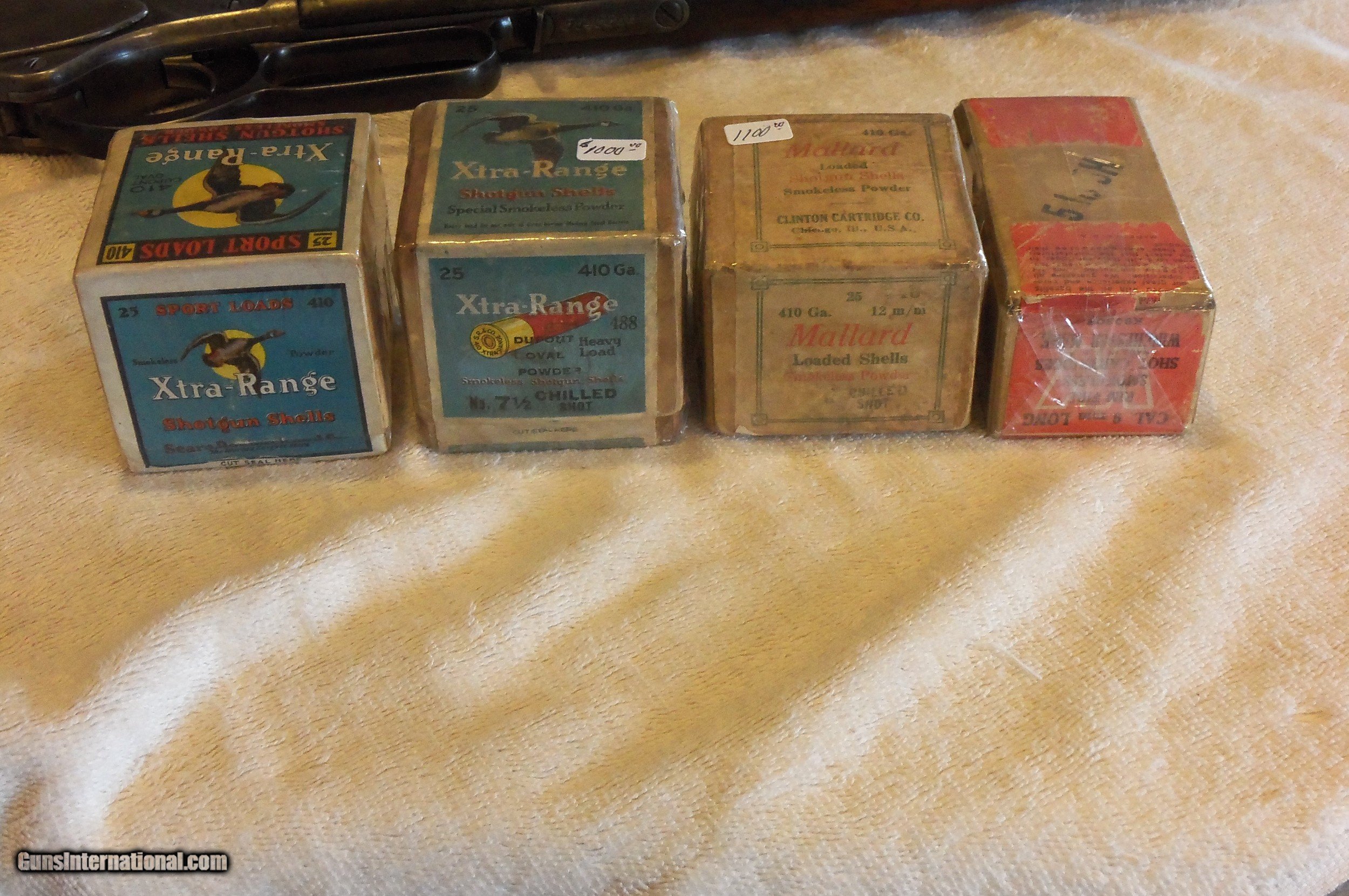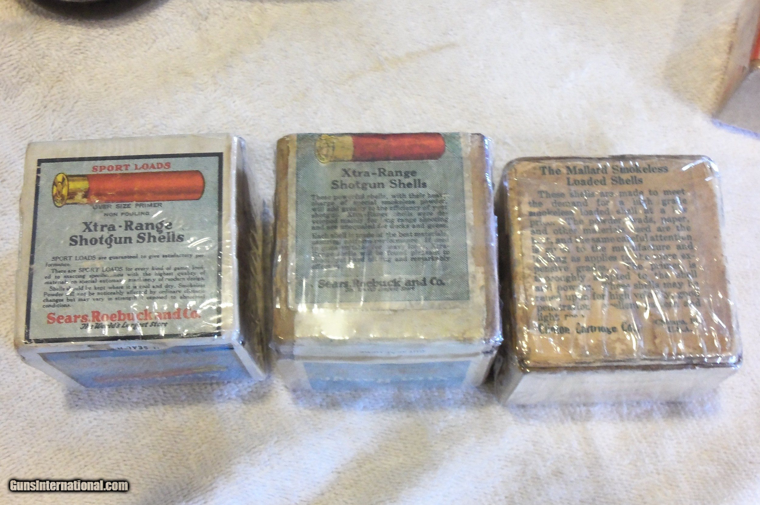 Description: FOR SALE a sears and roebuck 410 Xtra-range with goose flying in front of yellow moon full and sealed box excellent condition 700.00 plus shipping also a Xtra-range 410 sears and roebuck flying goose on just blue back ground full and sealed 1000.00 plus shipping also a clinton mallard box empty but very good condition 1100.00 plus shipping(very hard to find in any condition) also a winchester 9mm long shot cartridge box full and sealed very nice 250.00 plus shipping also a full carton winchester BOY SCOUT 22 still sealed from factory 195.00 plus shipping any questions feel free to call,text or email me if you want to buy more than one item could work out a better price thanks for looking!! also i buy single boxes and or collections of old shotgun shell boxes and or 22 shell boxes also and i do pay cash! feel free to call or ask any questions SOLD |