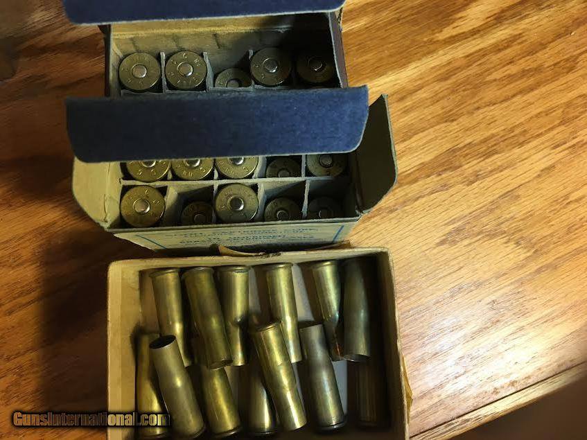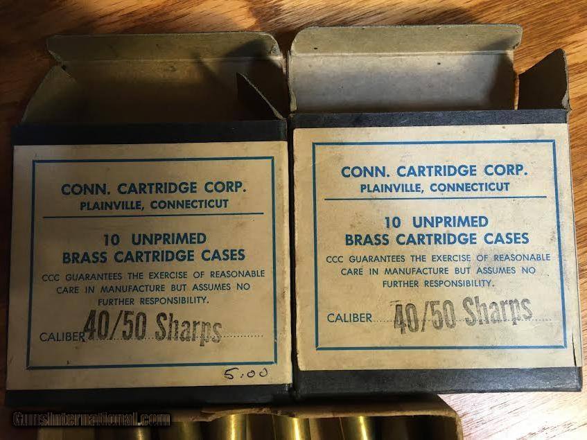Description: Two boxes of 10 cartridges each by Connecticut Cartridge Company. Both boxes are in excellent condition. One box of 10 are loaded with lead bullets. The other box has a single cartridge loaded with a PP bullet, the other nine are not loaded. Additionally there are 13, no head stamp original solid head cases for the same 40/50 caliber, also in excellent condition. $190.00 Sold SOLD Rifle Caliber: .40-50 Sharps |