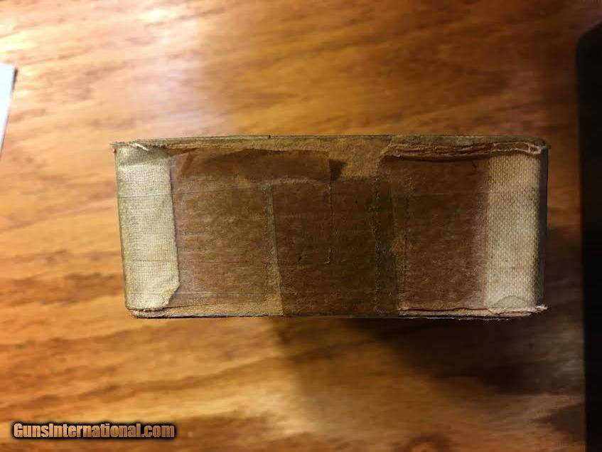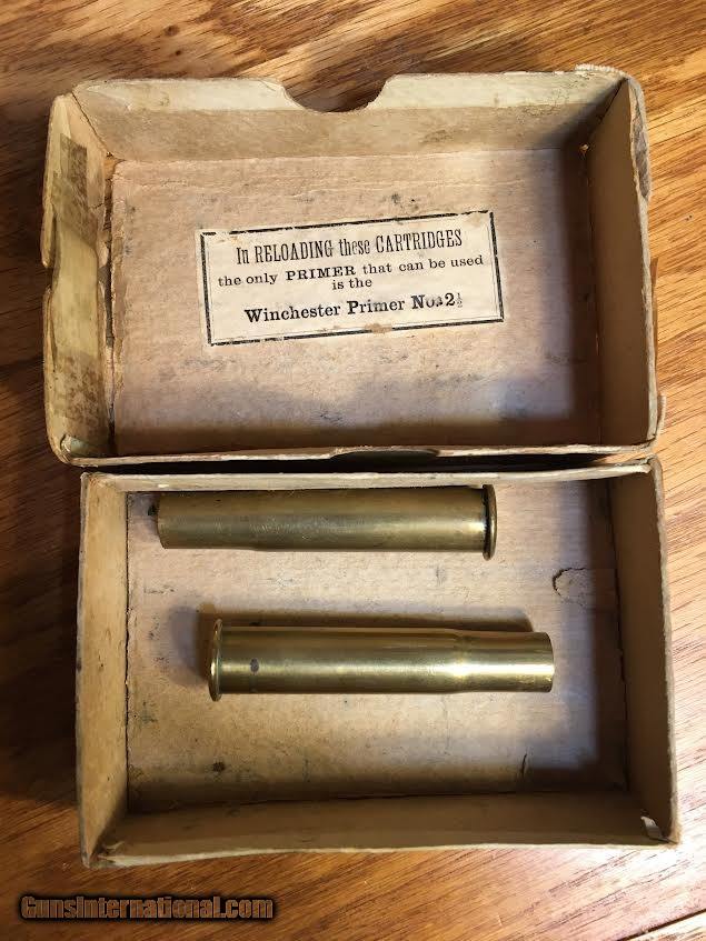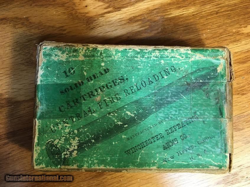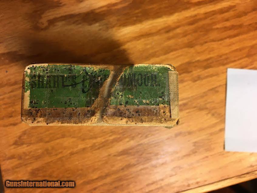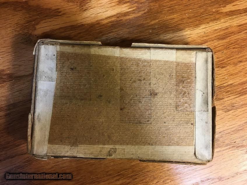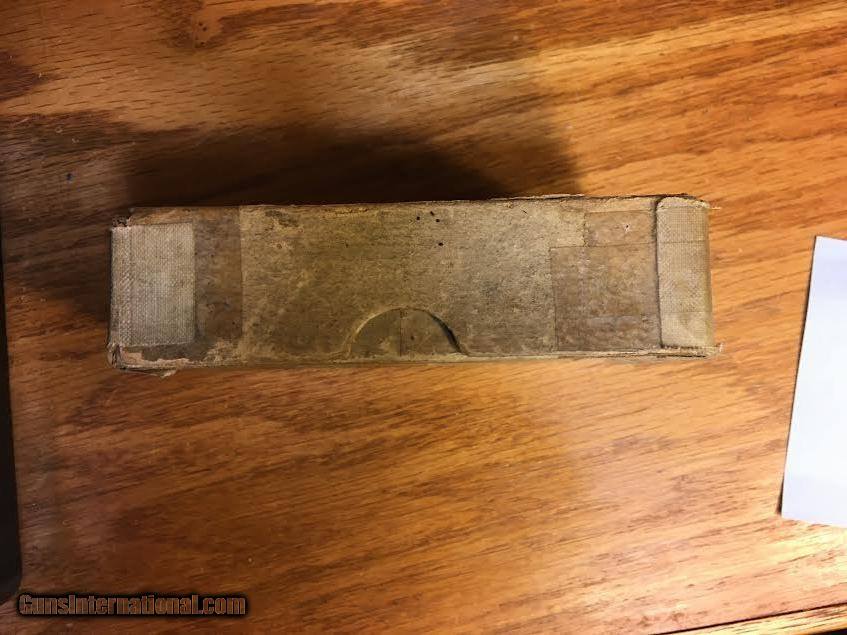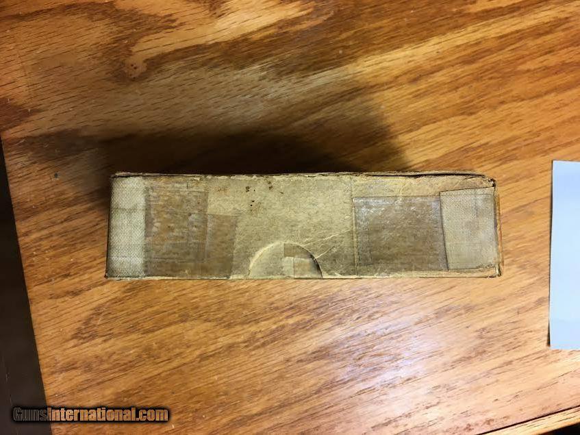 Description: Rare box of 44/90-105 solid head cartridges for Sharps Rifle by Winchester. Only two of the original solid head no headstamp cartridge cases remain. The end graphic of Sharps Creedmoor is damaged but readible. Tape. It's jsut a hard box to find. SOLD SOLD |