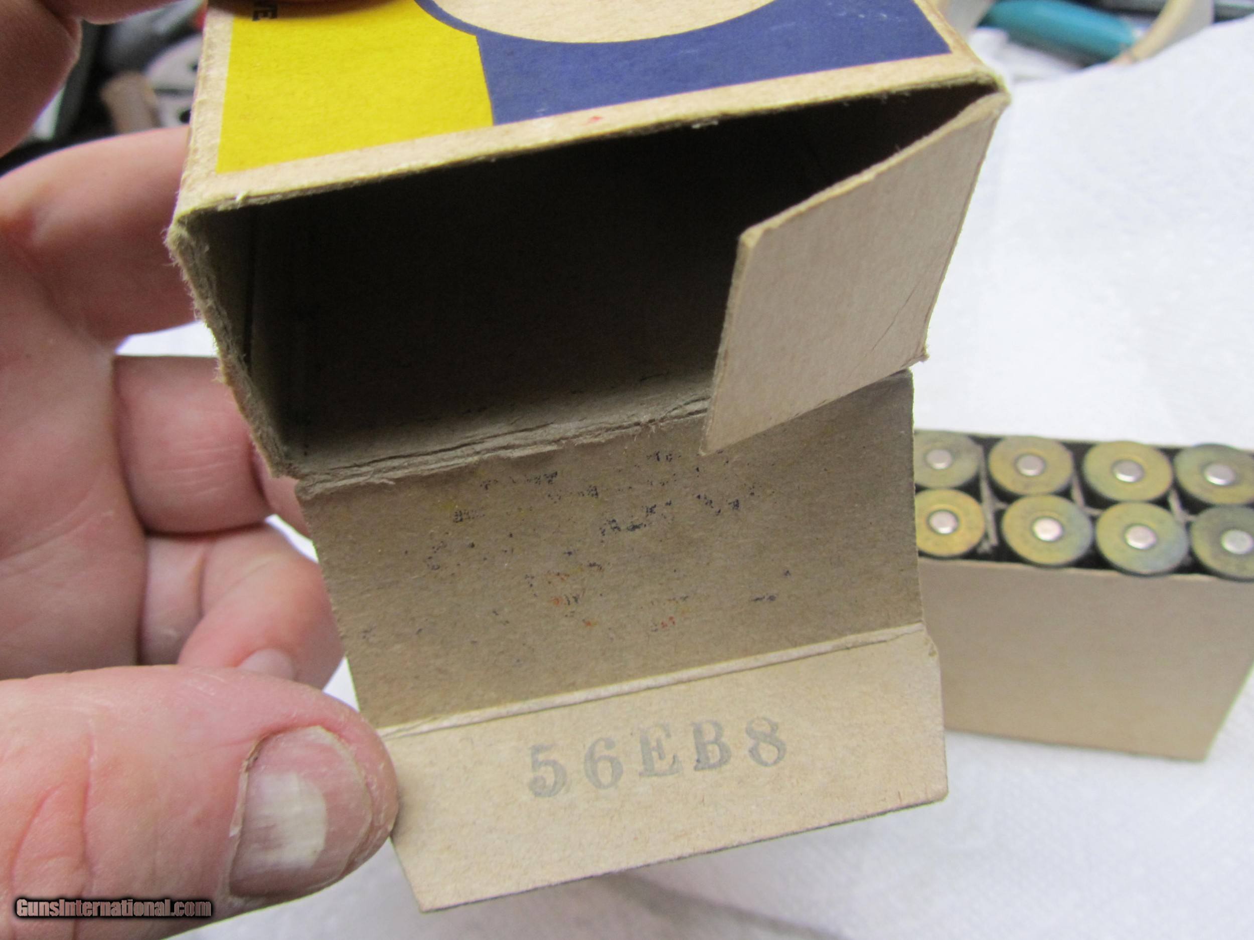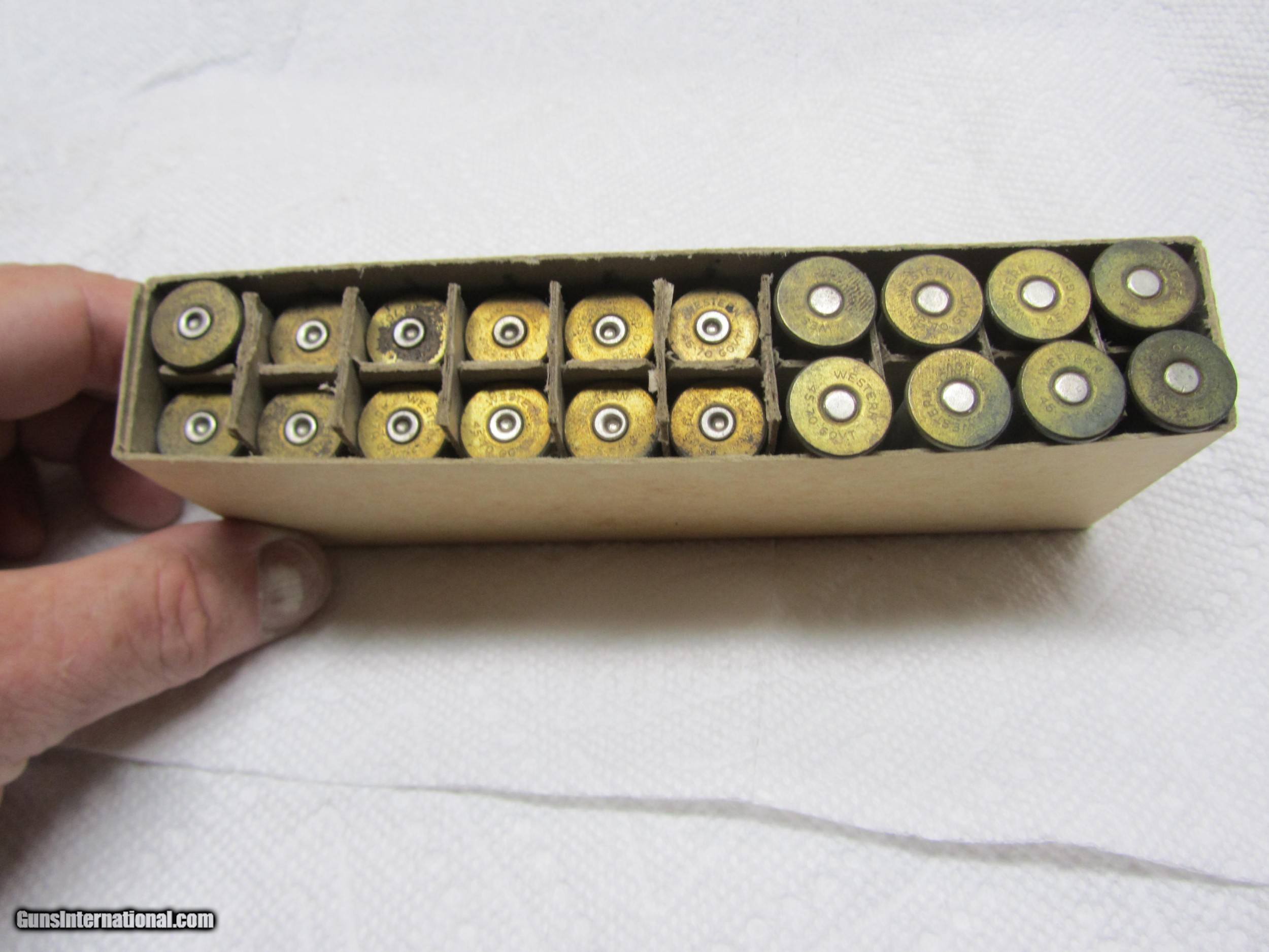 Description: 45 -70 western box and 8 rnds ammo 12 cases . SEE PHOTOS !! Box is missing one Flap !!! 1930 ? SOLD |