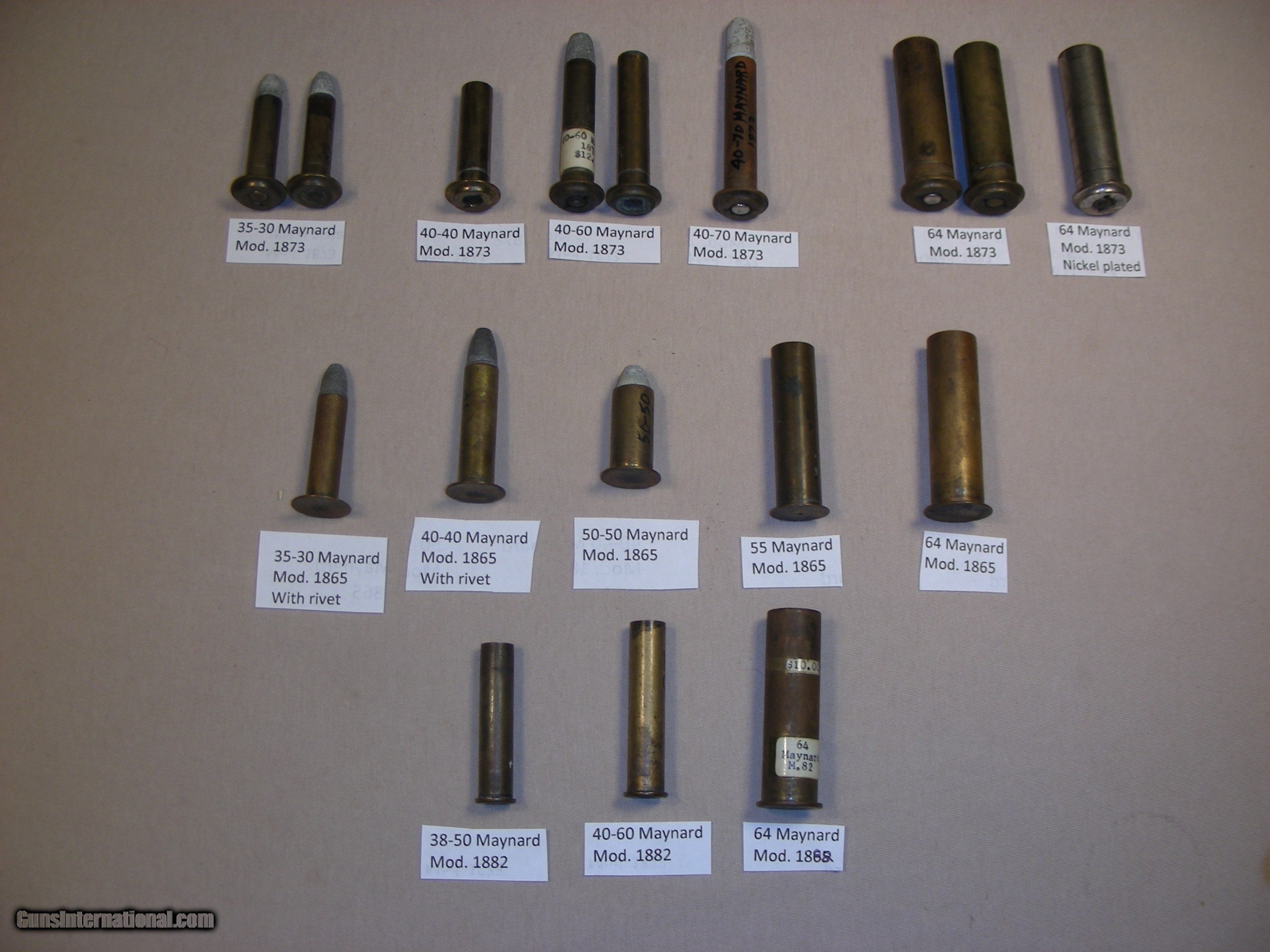 Description: This cartridge is in good condition. Someone wrote 50-50 on case with sharpie, comes off with alcohol. Bullet has very slight dent and light whitish corrosion. See photo. It is in middle row, center.l Take check or paypal. Other Maynard cartridges are also for sale. SOLD |