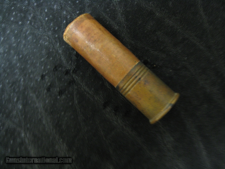 Description: An 8 gauge shotgun shell, marked "Leader, 1061 no. 8". It is 3 1/8" in length. Nice patina, with no damage to the brass or wadding. SOLD |