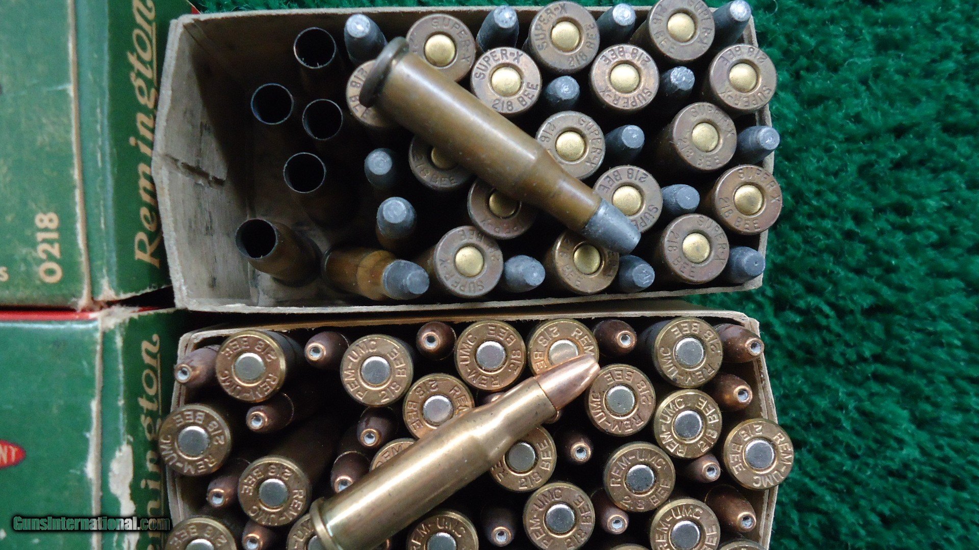 Description: 1 full box of 50 46 Grain Mushroom Bullets. Another box with 35 rounds of Super X head stamp lead bullets. You get live 85 rounds total and 5 brass. Hard to find caliber. Free Shipping. Leroy Merz Antique Firearms specializes in antique and vintage Winchesters and other fine American firearms. Since 1965 Mr. Merz has taken part in the world of firearms and has been a contributor to many well known reference books. We have hundreds of additional guns in every price range at our home online. Search for Merz Antiques in google. SOLD Rifle Caliber: .218 Bee |