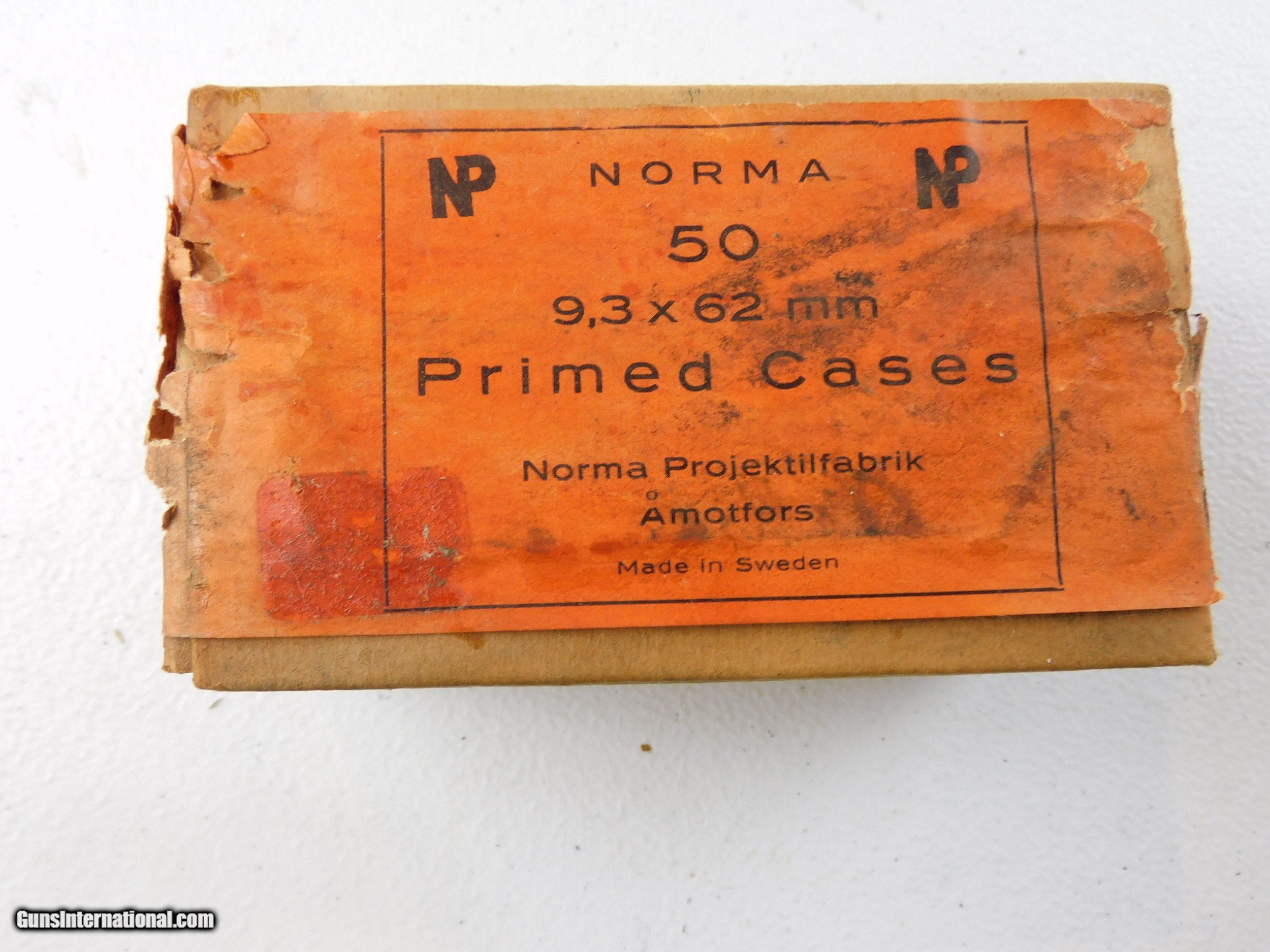 Description: #3924MA 9.3 X 62 MM primed cases, Norma 50 rd. tan sealed box with red label, VG condition, label is in fair condition. $200 SOLD Rifle Caliber: 9.3x62mm |
