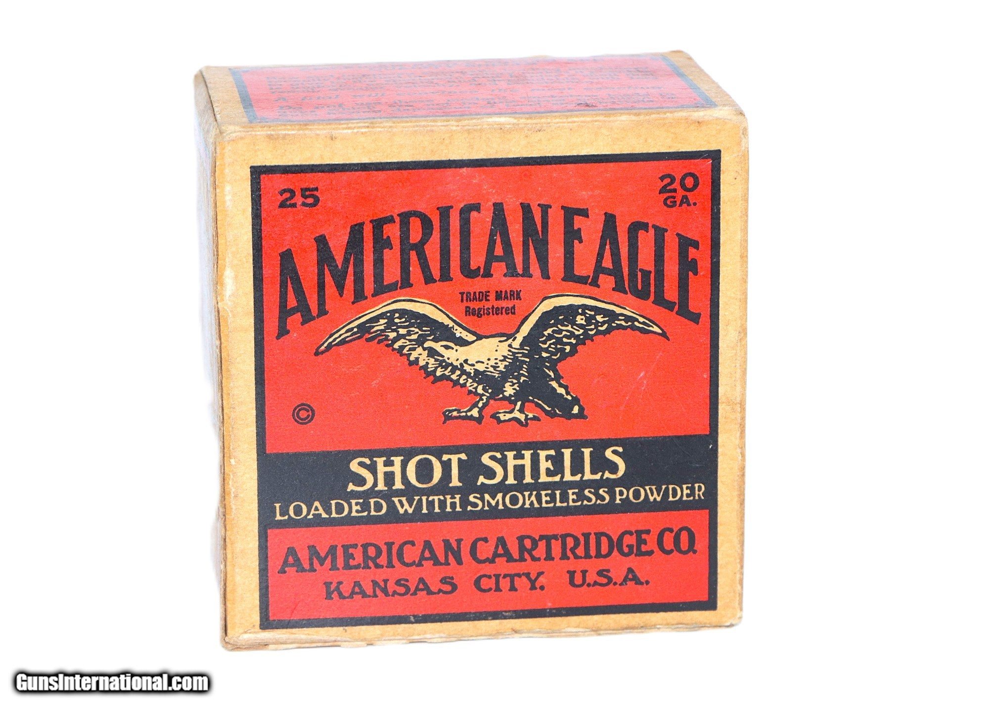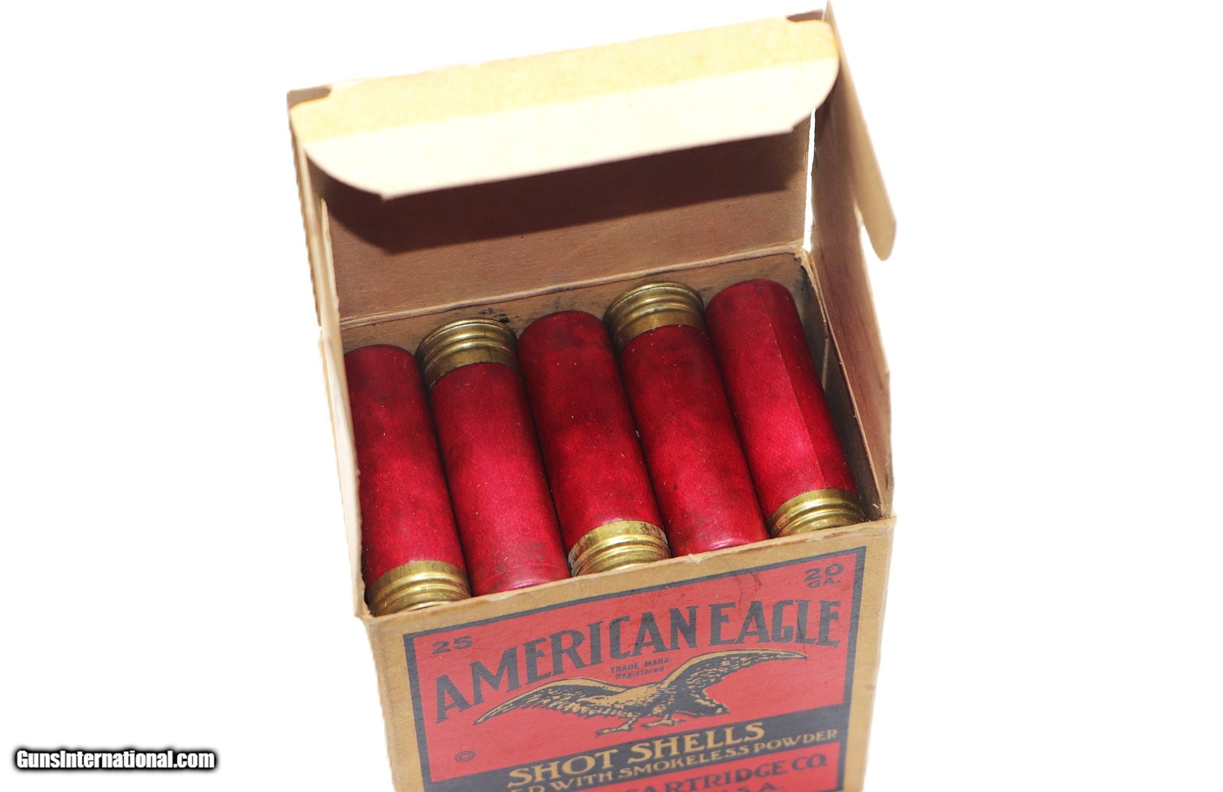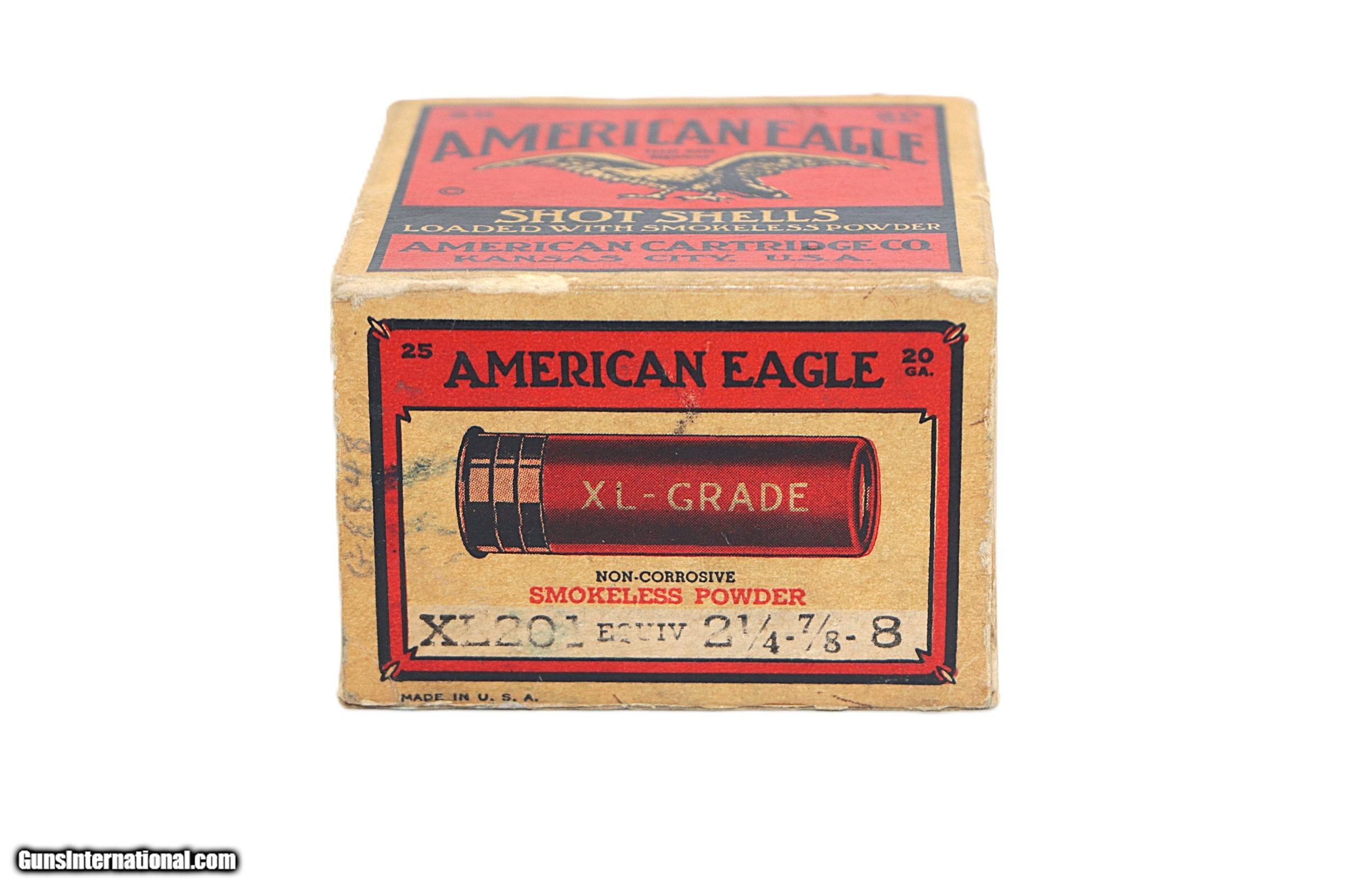 Description: American Eagle XL Shot, 20 Gauge, 2-3/4", Shot Size 8, 25 Exc Factory Rounds. Box is solid with great color, light age staining. Add $15 S+H SOLD Shotgun Gauge: 20 Gauge |