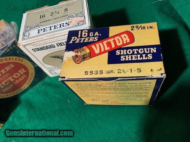 Description: Ammunition - 3 boxes of Peters Victor Field load 16GA #5 paper shells, new boxes original ammo. Another 2 boxes of 16GA plastic shells #8. $100.00 plus $25.00 shipping. For more information call Rick at 973-478-5066. SOLD |