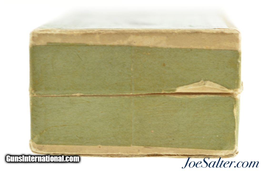 Description: This is a full box, 50 rounds, of .38 S&W ammunition (marked .38 Central Fire) manufactured by Winchester and dating to the late 1890's. The half-split "Picture" box features a top break Smith & Wesson revolver with specific S&W call out "Expressly for SMITH & WESSON New 38 Cal. Central Fire Revolver." The side label features an endorsement from Smith & Wesson dated August 1st, 1898. The labels are intact with very slight flaking on the top edge with the bottom slit on 3 sides having excellent graphics showing only very slight age soiling. The box is solid with slight edge wear and the start of seam separation on the bottom left side. The cartridges are in excellent condition. A beautiful early picture box perfect for the Winchester Ammunition collector or to pair with your early S&W revolver. SOLD |