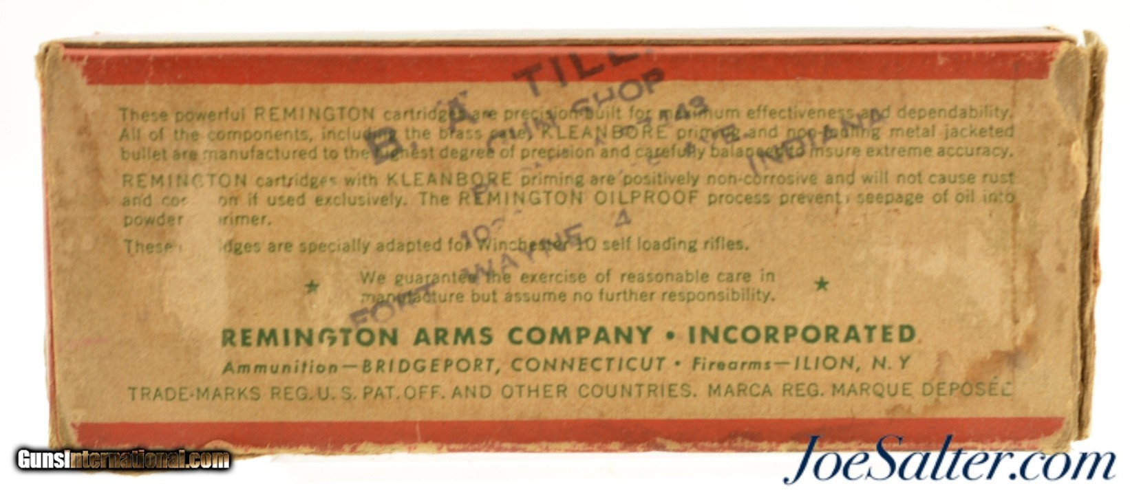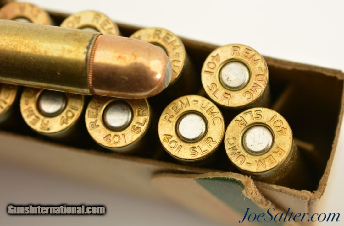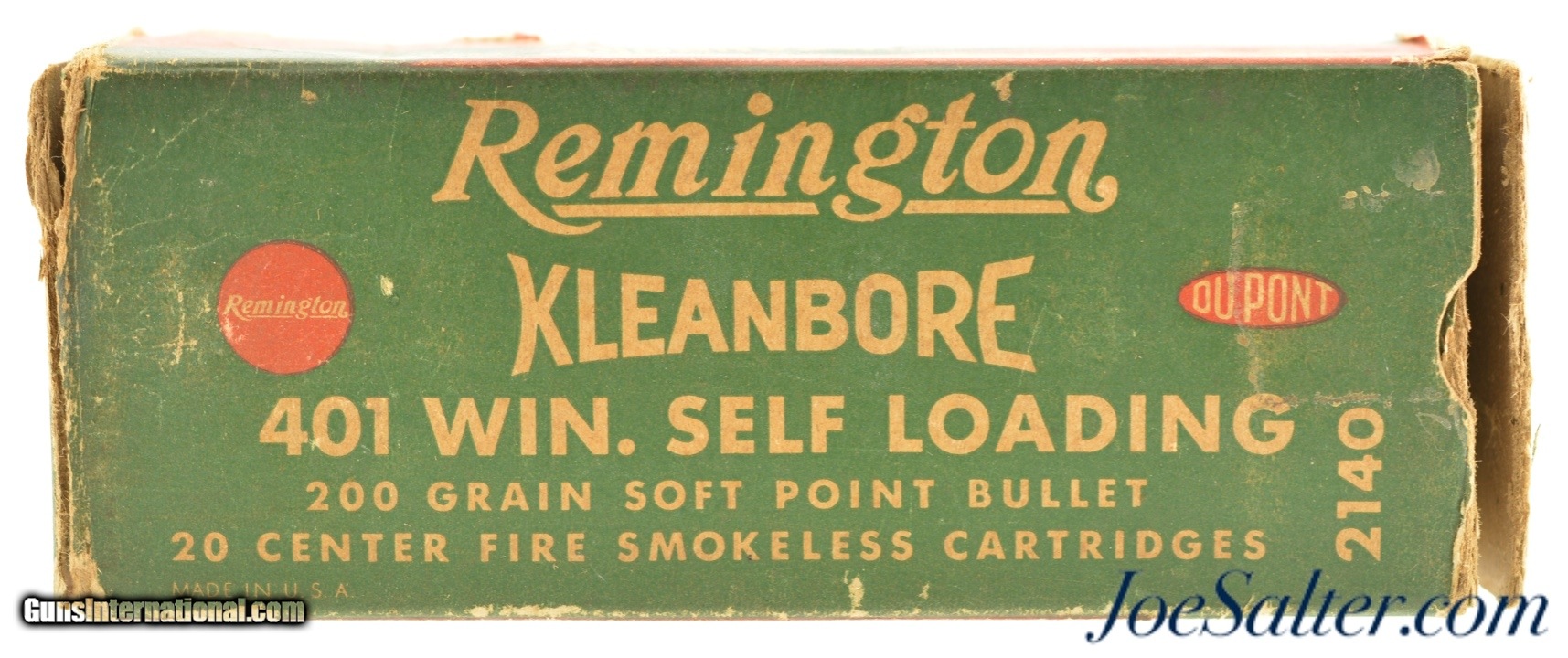 Description: This is an opened, one-piece, green and red 20 rd. box of .401 Winchester Self-Loading Kleanbore cartridges loaded with 200 gr., soft point bullets, with 90-95% of the original red paper label remaining. The box is in about good shape, but does exhibit edge wear, a partial separation of one end flap, and full separation of the other flap and tab (the flap is secured by cello-tape on the interior, and the tab is detached but still present). The printing is still fully legible, although the colors have faded over time. The cartridges are in fine shape, with bright brass cases, and only minor oxidation of the exposed lead of the bullets. ; SOLD |