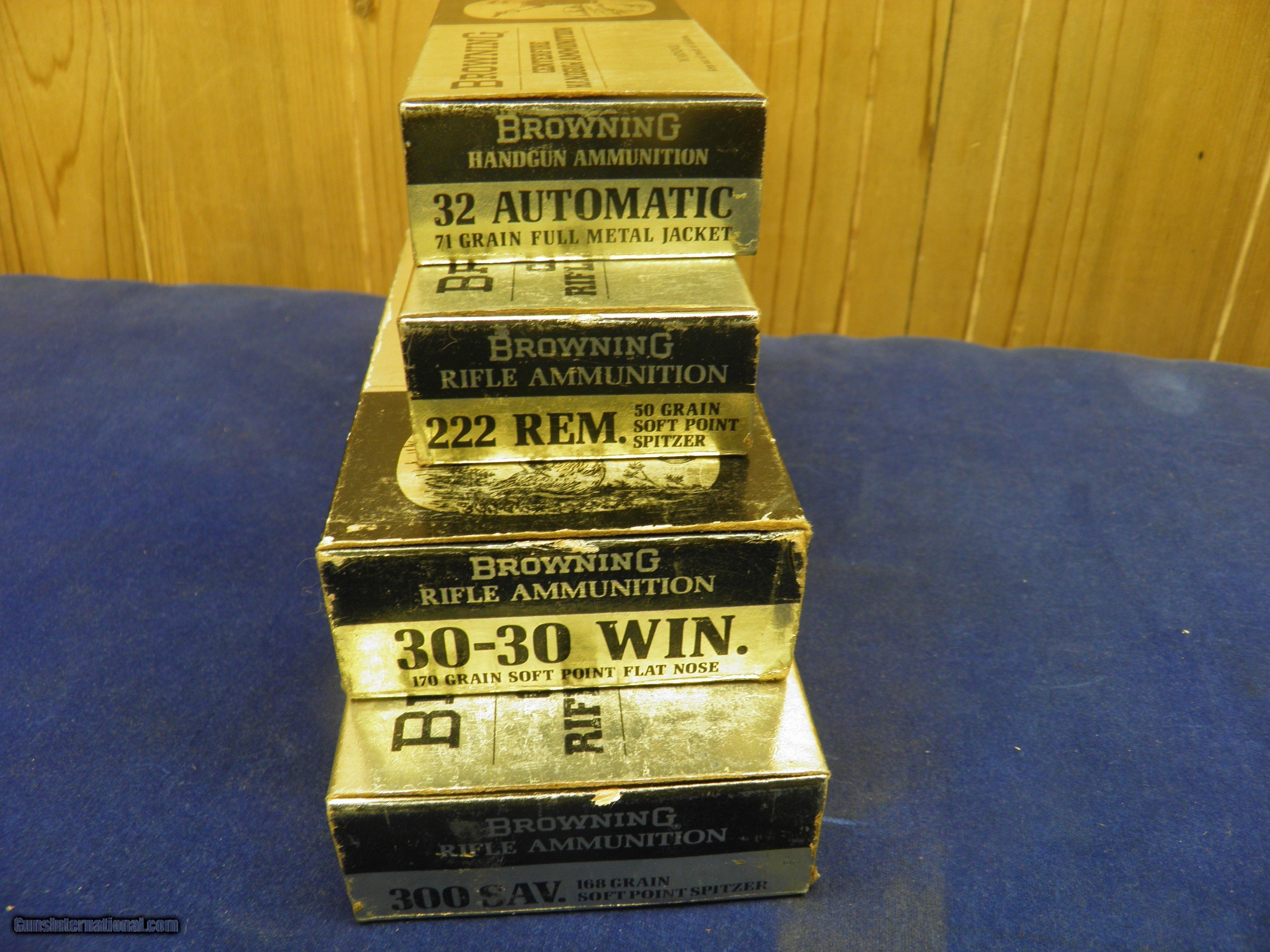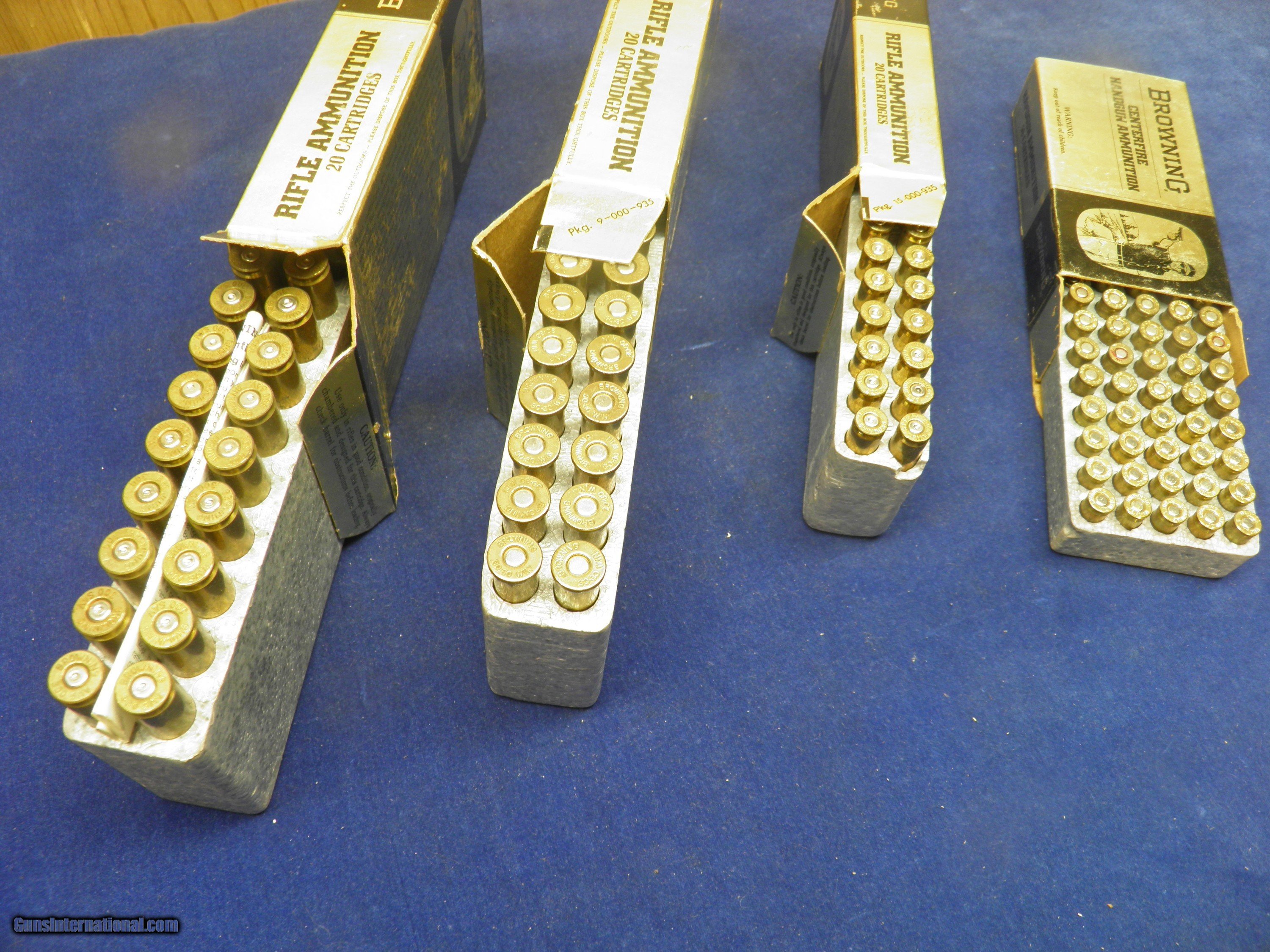 Description: BROWNING AMMO LOT 1 BOX 300 SAVAGE FIRED CASES, 1 BOX 30/30 FACTORY LOADED, 1 BOX 222 REMINGTON FIRED CASES, 1 BOX FACTORY LOADED 32 AUTO. SOLD |