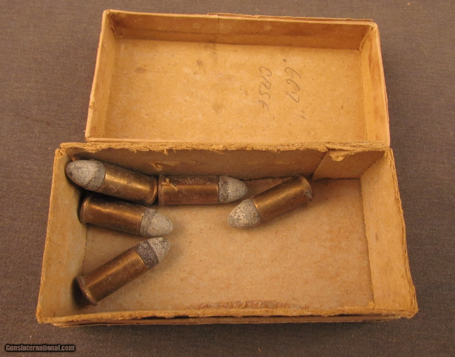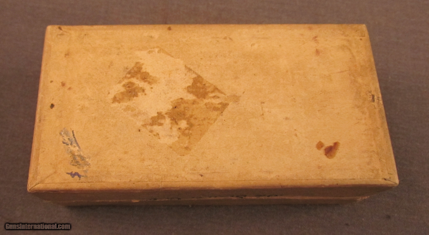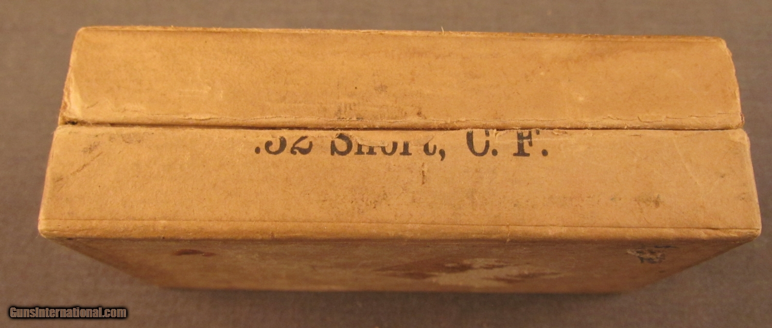 Description: This two piece half split partial (5 rounds) box remains in excellent condition with two small chips in top label with a small scuff and very light water stain. The side label is neatly cut and almost all present. This box is probably from the late 1880's or early 1890's. Several corners have very neatly finished repairs. SOLD Manufacturer: U.S. Cart. Co. Model: Ammo Caliber Info: .32 Short Gauge Info: .32 Short |