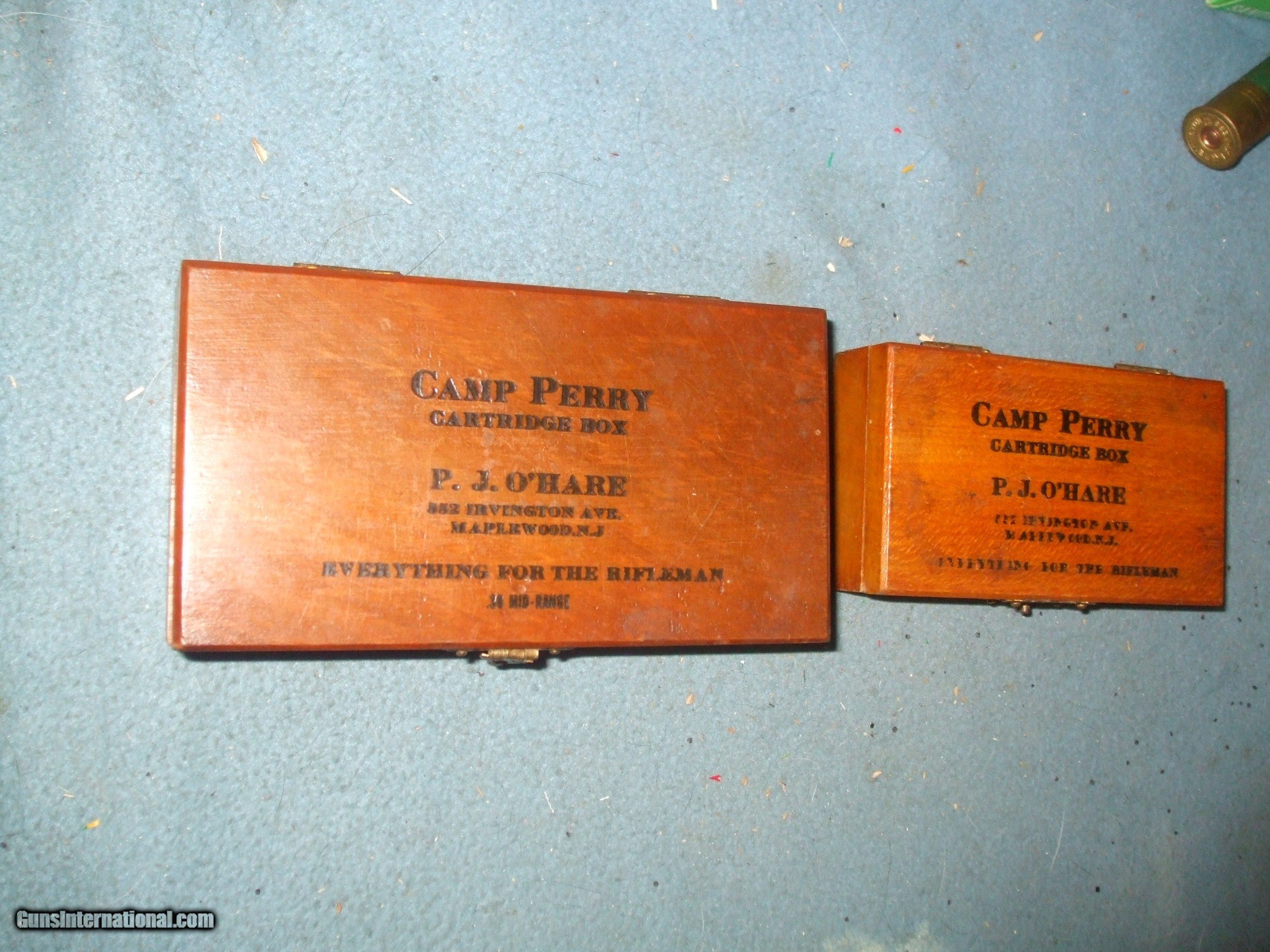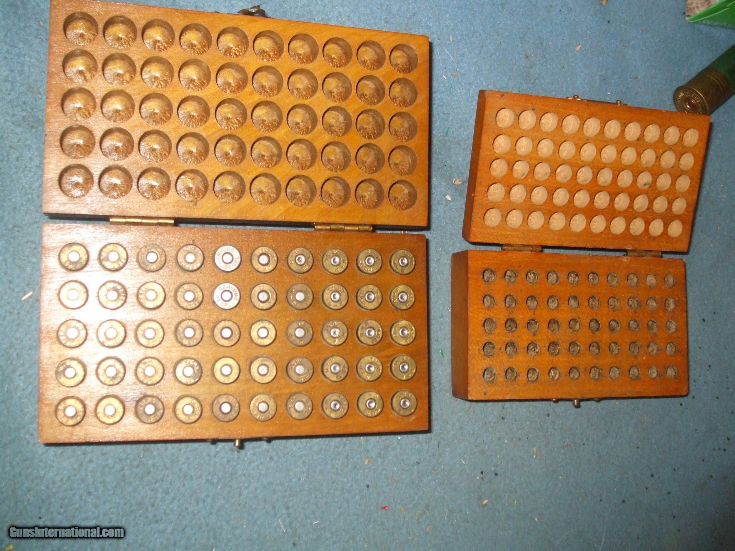 Description: Camp Perry wood ammo boxes. One in 38 Specail one in LR. Latch intact on 38 box part of latch missing on the 22 box. 38 box has 34 primed 38 Special cases and 16 fired ones. Boxes marked manufactured by PJ O'Hare Maplewood, NJ. Boxes in excellent condition first class workmanship. SOLD |
