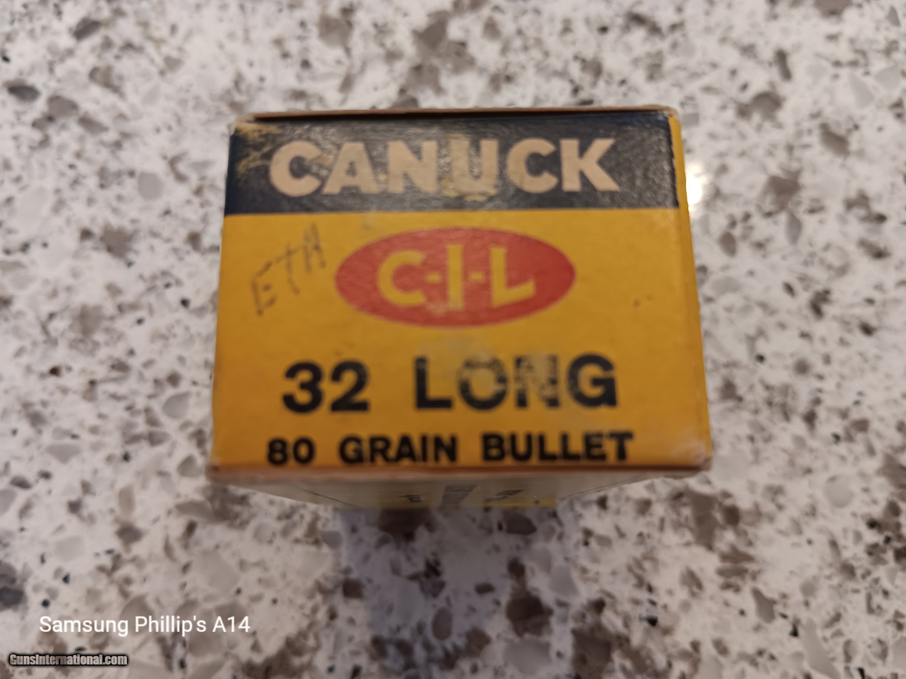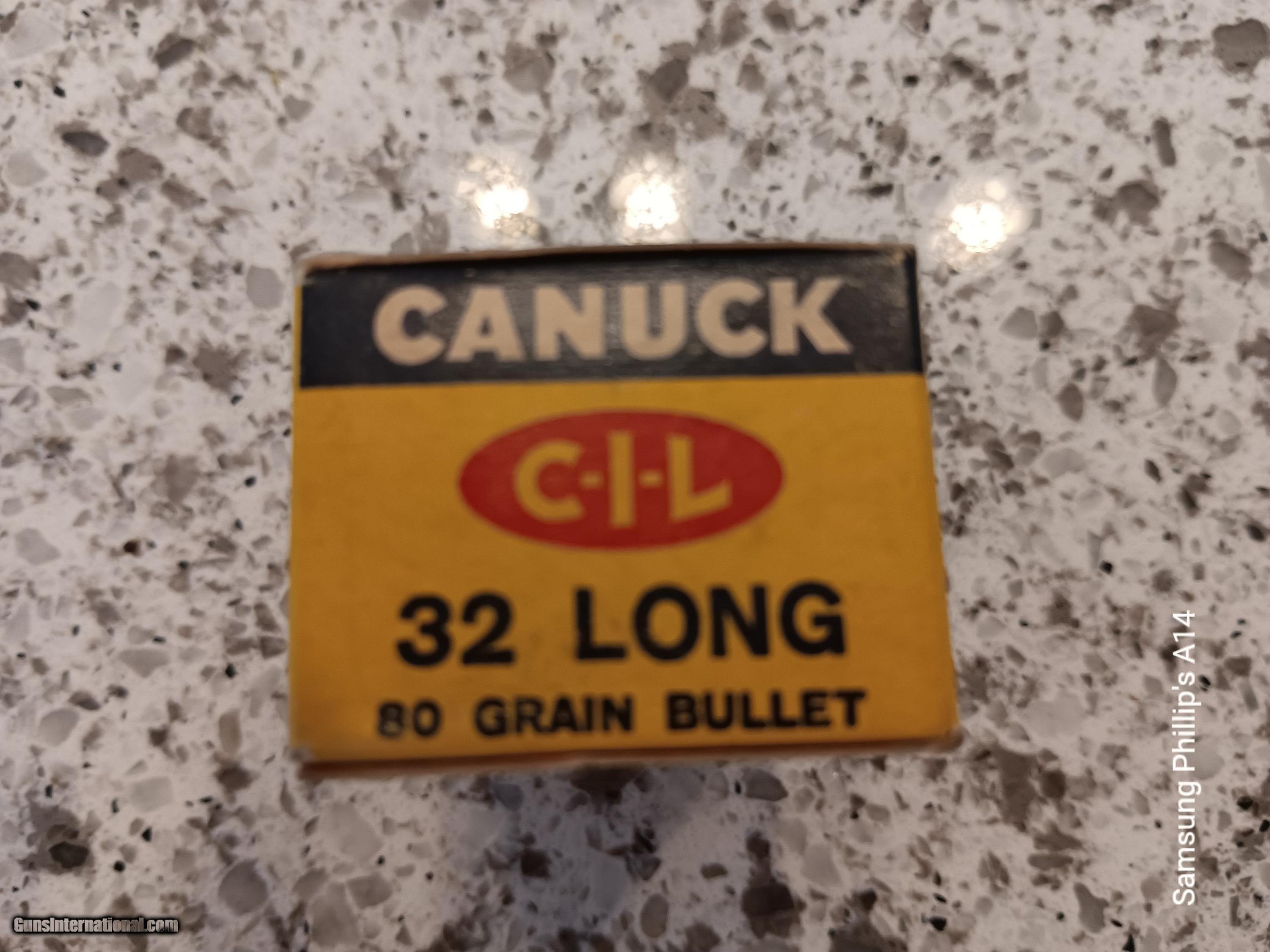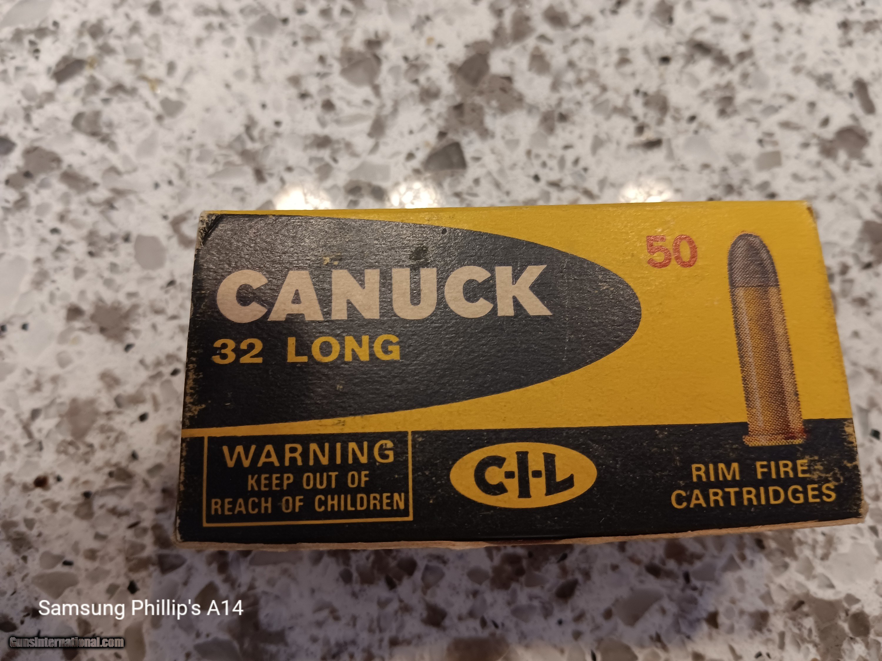 Description: 1 perfect box of CANUCK BRAND 32 LONG RIM FIRE CARTRIDGES BOX IS PERFECT. AMMO IS PERFECT. VERY SCARCE TO FIND .VERY LIMITED PRODUCTION. BUYER pays shipping. . SOLD Rifle Caliber: .32 RF |