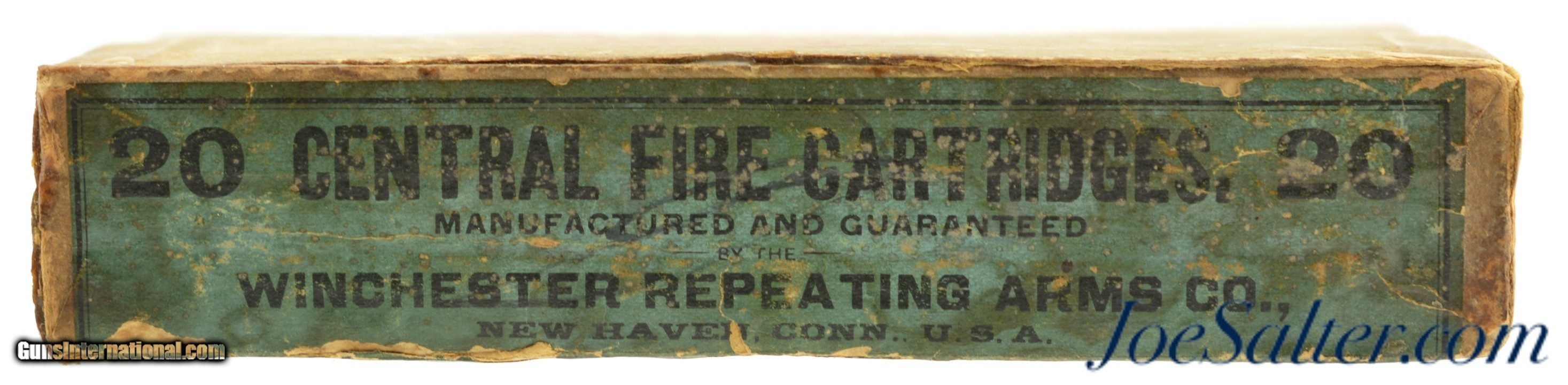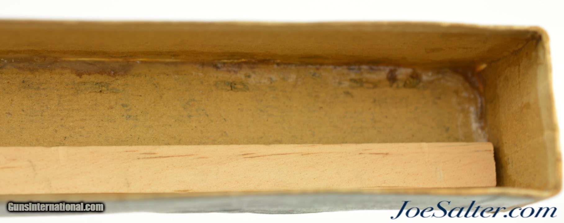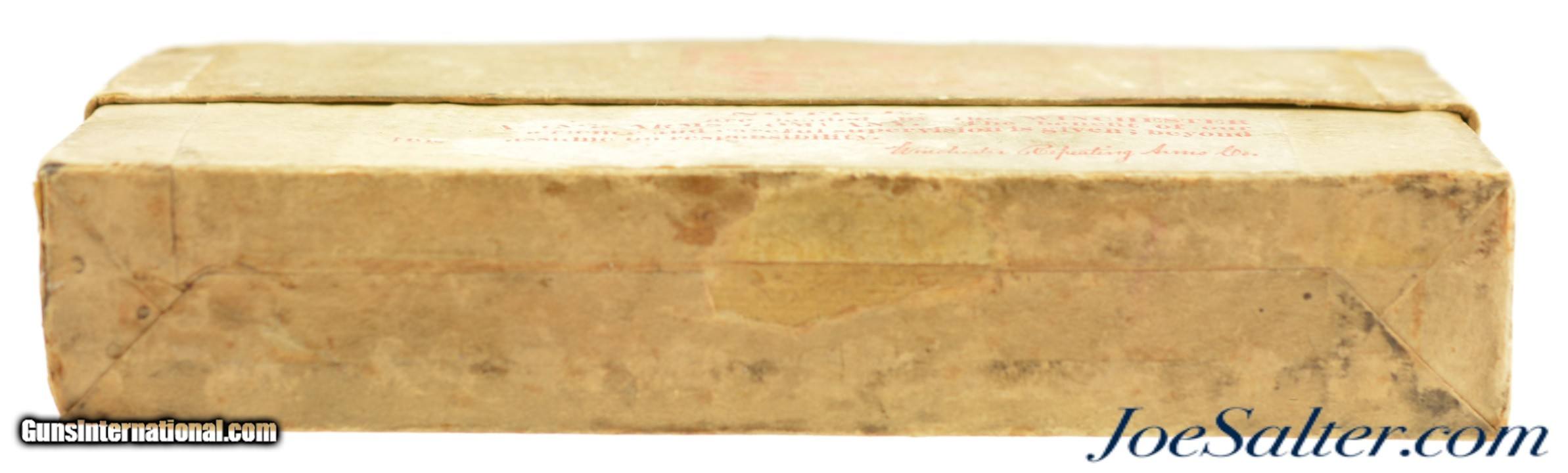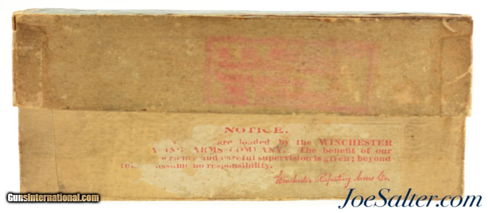 Description: This is a full box, 20 rounds, of .45-75 W.C.F. black powder ammunition manufactured by Winchester circa mid to late 1890's. The two piece, square corner box represents the last version with the prominent "MODEL "CENTENNIAL" 1876" call out below the cartridge cut highlighting the original caliber the M76 was built in. The box has very good graphics with an excellent cartridge cut with with edge flaking and light soiling overall and pencil marking on the sides. The box is solid with old repairs to the inside edges. The cartridges all have matching head stamps and are in excellent condition with several having aged outside of the box. A seldom-seen box that will display well. Price: $695.00 Contact Seller |