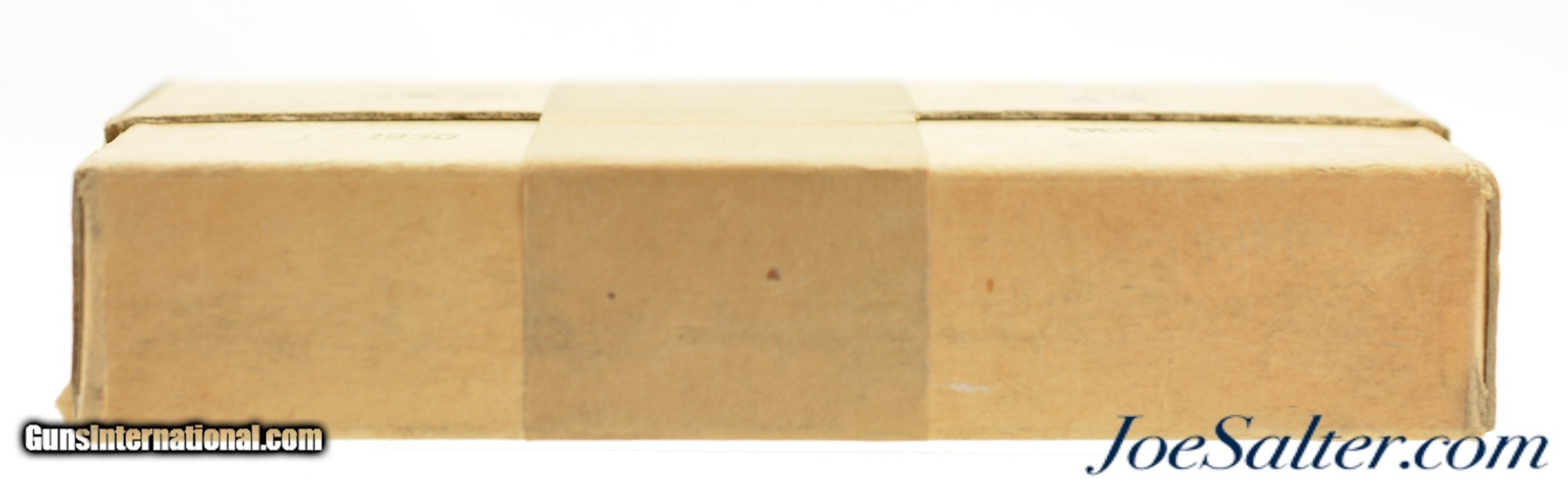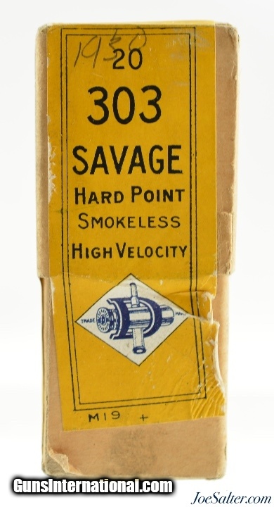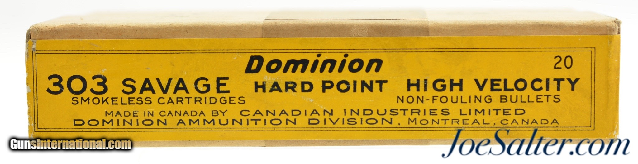 Description: Excellent box of 303 savage hard point from the Dominion/CIL reference collection. This box shows 1930 pencil marked on one end. This box shows the Dominion 303 savage hard point bullet on the front face. The box remains factory sealed and shows the oval bend D logo and the super clean priming over lay on the front. The reverse side shows a factor seal tape and 4 ink stamps 1930. This box comes from a lot of reference boxes that we acquired in the 1990's from the factory reference collection.; SOLD |