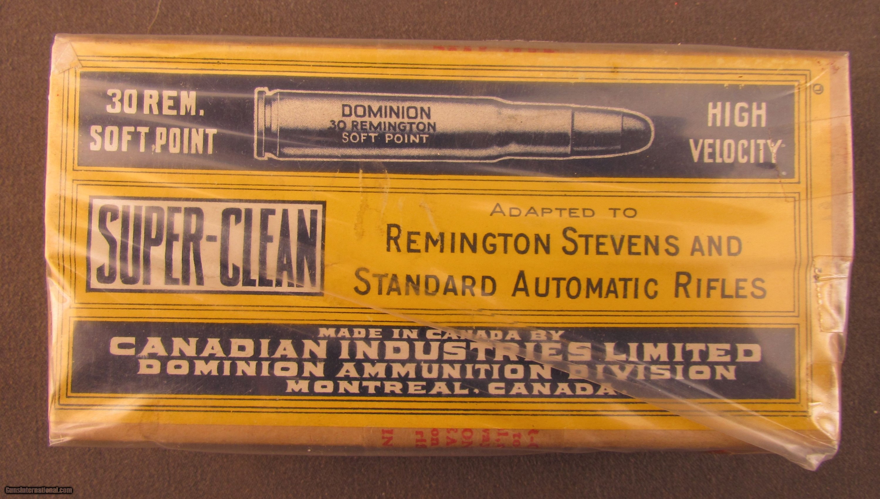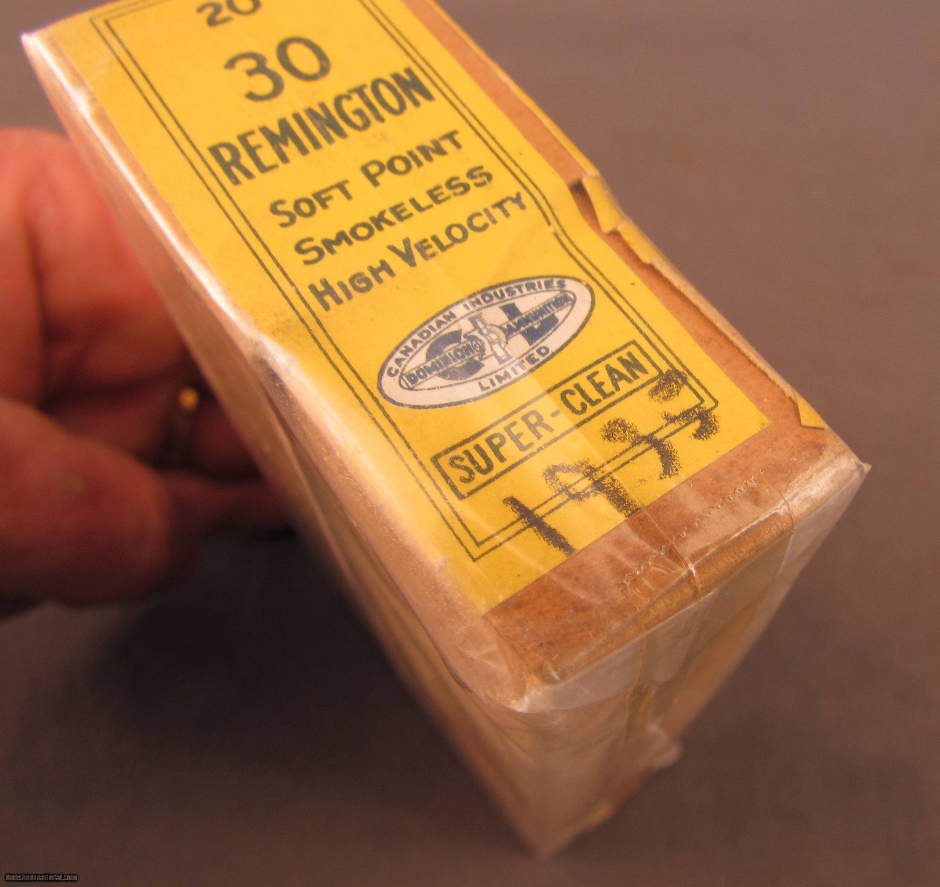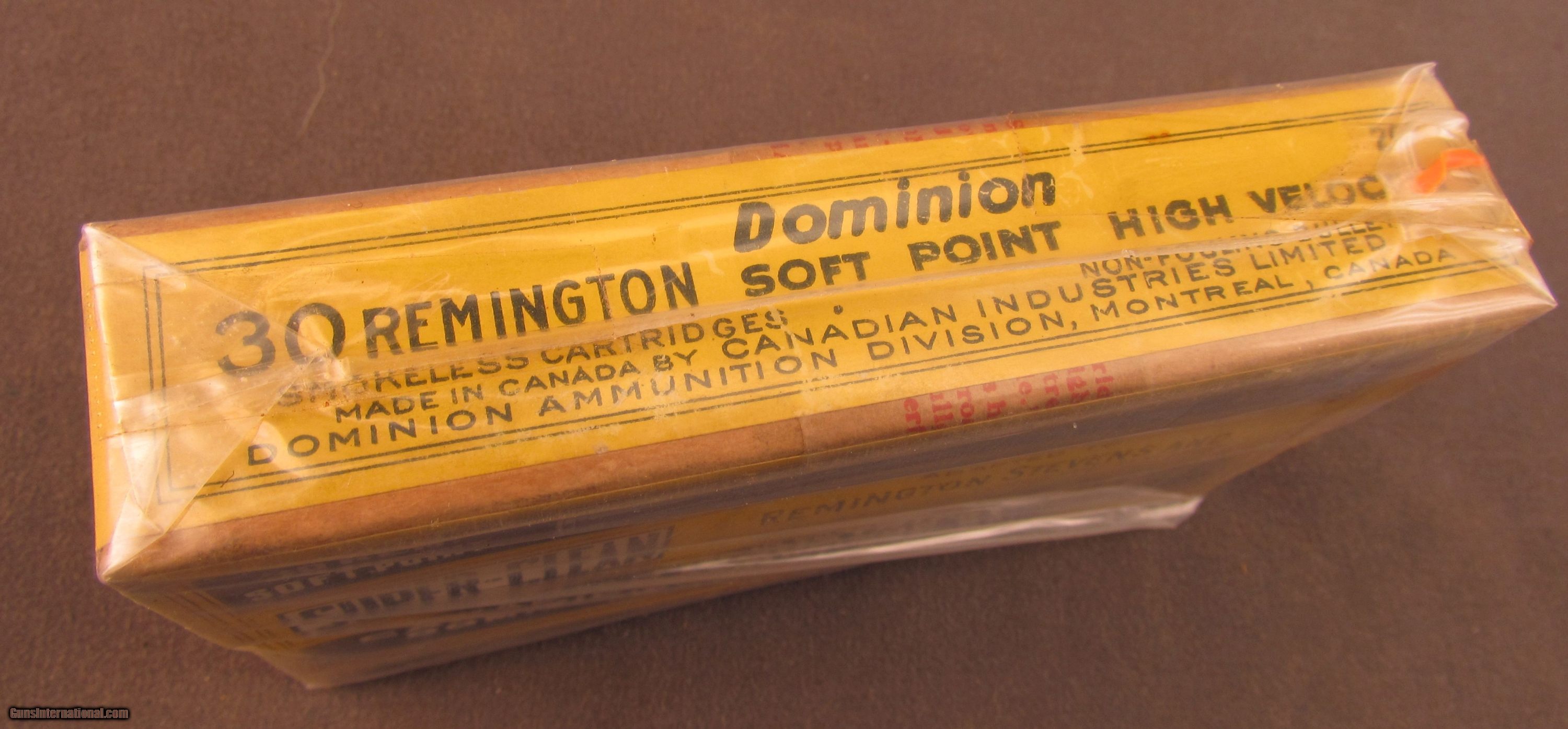 Description: Factory sealed original factory reference box of 30 Remington cartridges. This blue and yellow box shows one end label pencil marked 1935. The bottom shows ink stamp Oct 1935. This is one of the production reference boxes that survived the destruction of all the ammo at the plant in Quebec. The box is wrapped in removable plastic to protect this collector grade box of cartridges. SOLD Manufacturer: Cil/Dominion Model: Ammo Caliber Info: .30 Rem Gauge Info: .30 Rem |