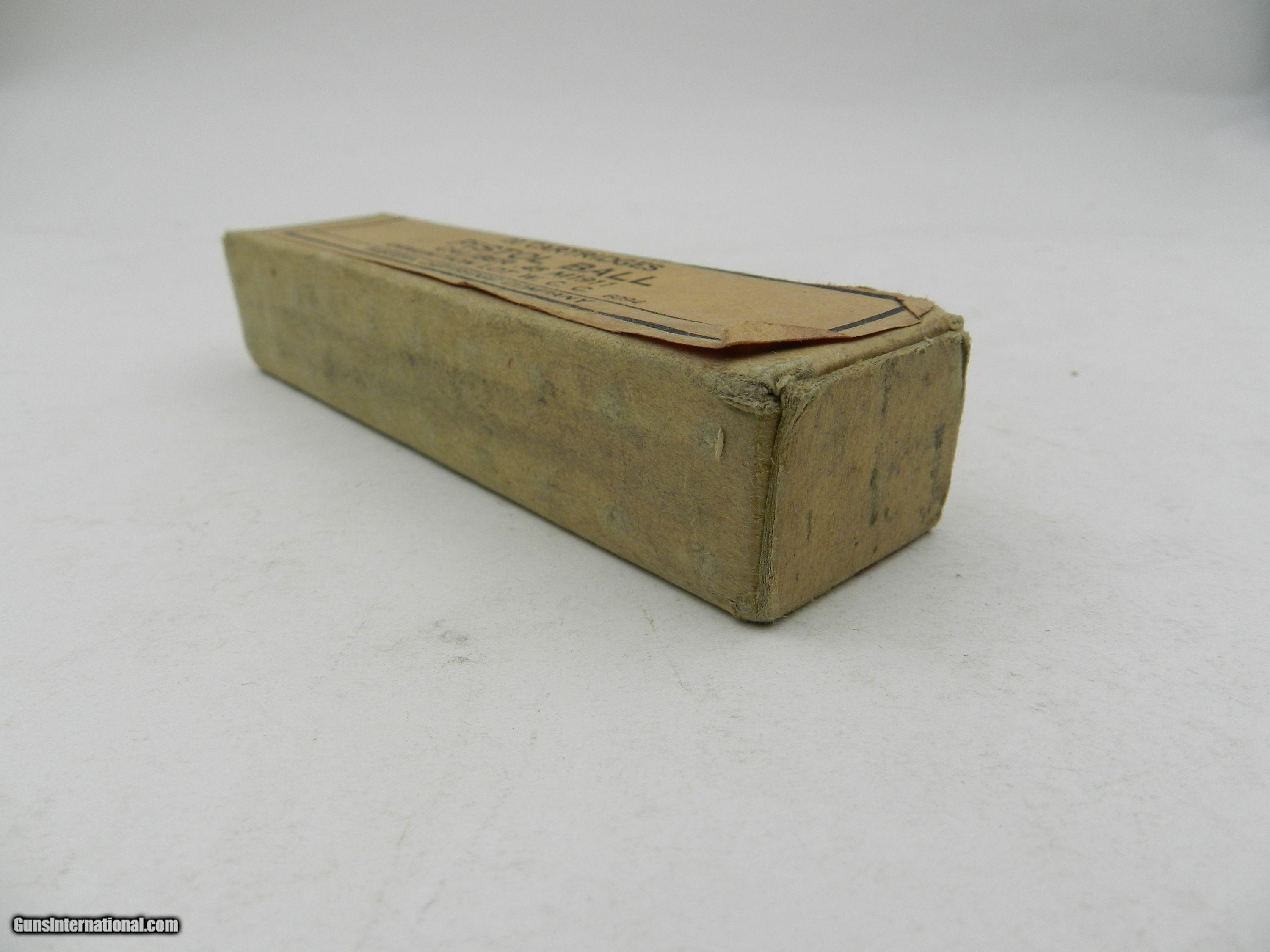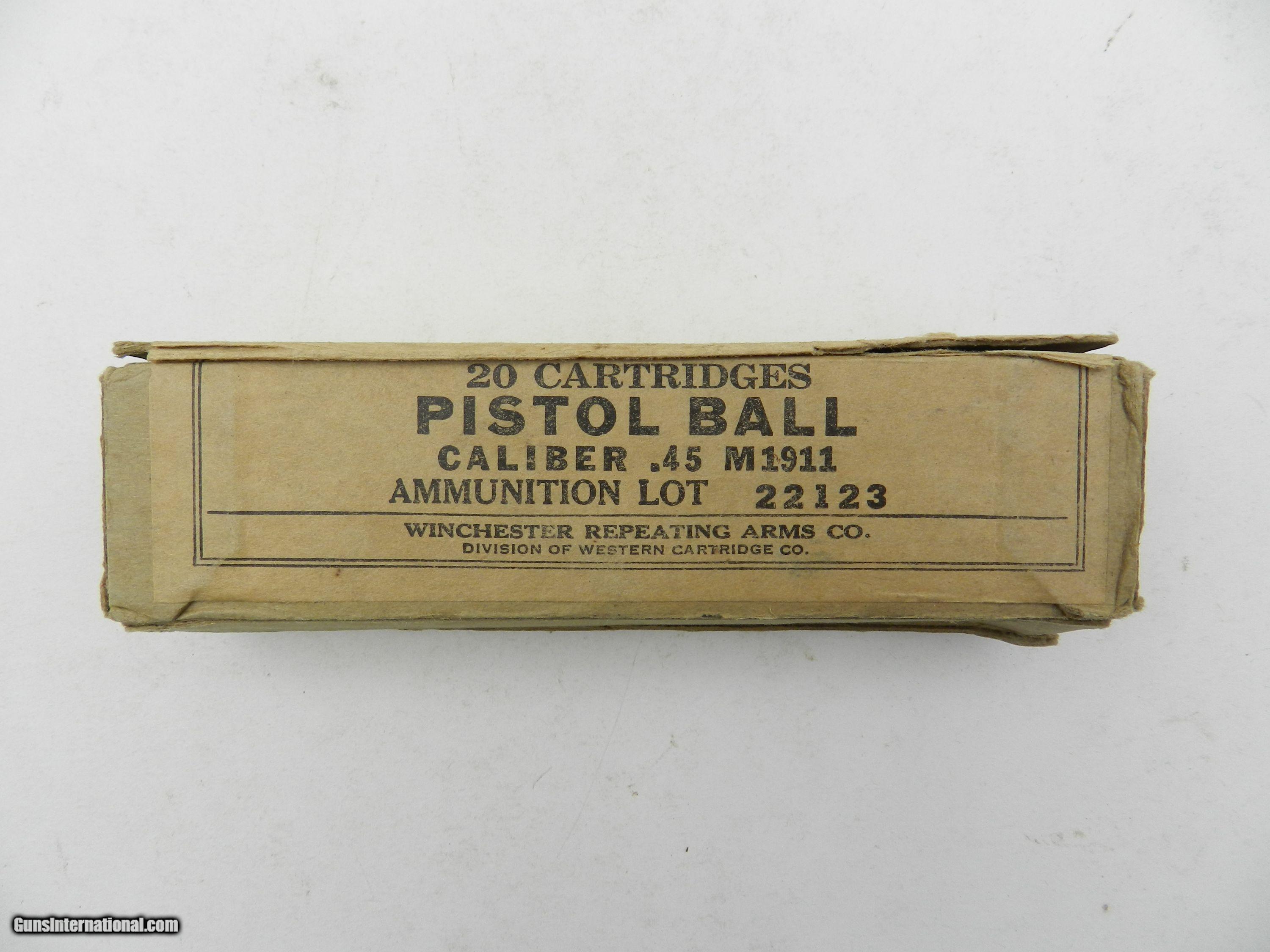 Description: Collectible Ammo: Lot of 2 Boxes of Winchester .45 caliber Pistol Ball Cartridges. Sealed box of Winchester .45 cal in good condition with mild fraying to corners and edges. Red label with some fading and has started to peel away from cardboard at the corners. Back and bottom of box with some light mold. Manufactured by Western Cartridge Co. Ammunition lot W.C.C. 6094. Second box was sealed, but bottom tore away. Box is in good condition fraying and tearing to the corners and edges. Label with some fading, and discoloration to box. Contains 20 cartridges all marked "W.R.A. .45 A.C." on headstamp. Brass in good condition with mild discoloration and toning from age. Ammunition lot 22123. Please refer to photos for condition details. Please contact us with any questions. This ammo is being sold as a collector's item only and we make no guarantees as to its quality or functionality. Free Shipping To The Lower 48 States Free Local PickUp Please know your local laws in regards to purchasing ammunition. There are areas with restricted delivery. We will verify prior to processing your order. California residents pay 7.75% sales tax. SOLD |