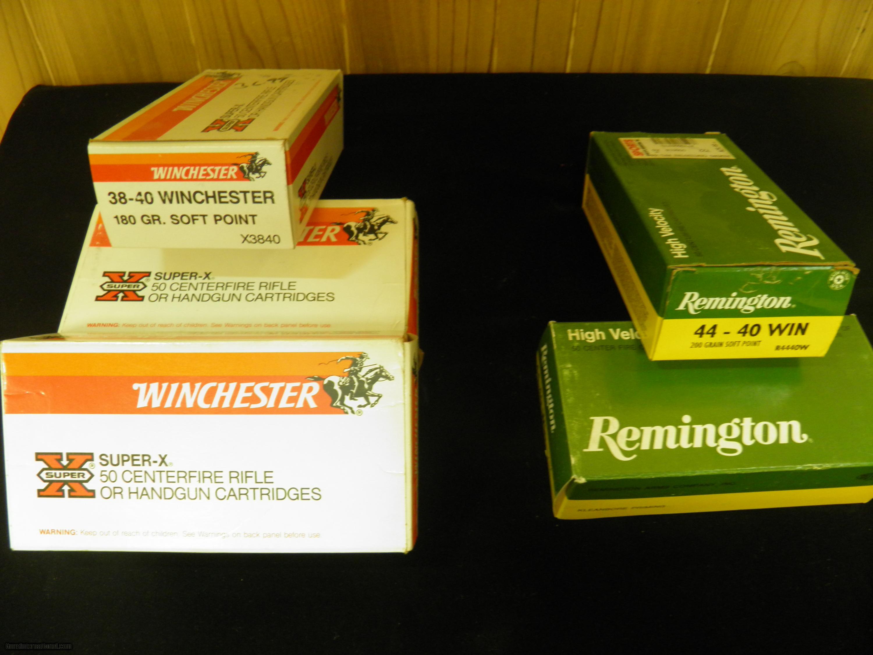 Description: COLLECTOR AMMO RIFLE- 2- BOXES REMINGTON 44-40 200 GRAIN SOFT POINT, 1- BOX WINCHESTER SUPER X 44-40 200 GRAIN SOFT POINT, 3 - BOXES WINCHESTER SUPER X 38-40 180 GRAIN SOFT POINT. ALL BOXES HAVE A FULL 50 ROUNDS AND ARE 100% FACTORY LOADED. YOUR CHOICE $75.00 EACH. SOLD |