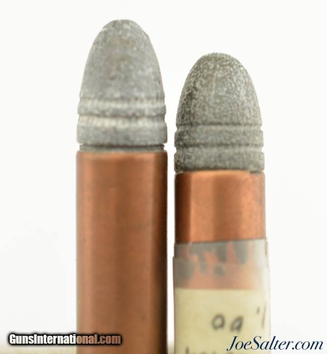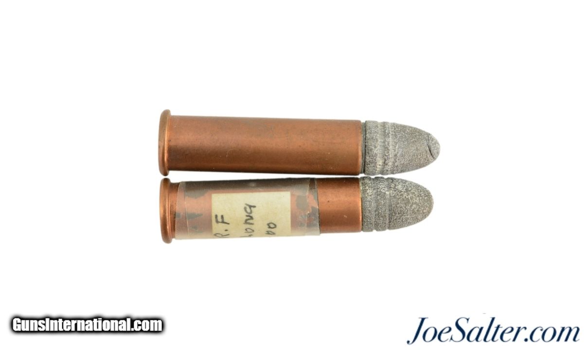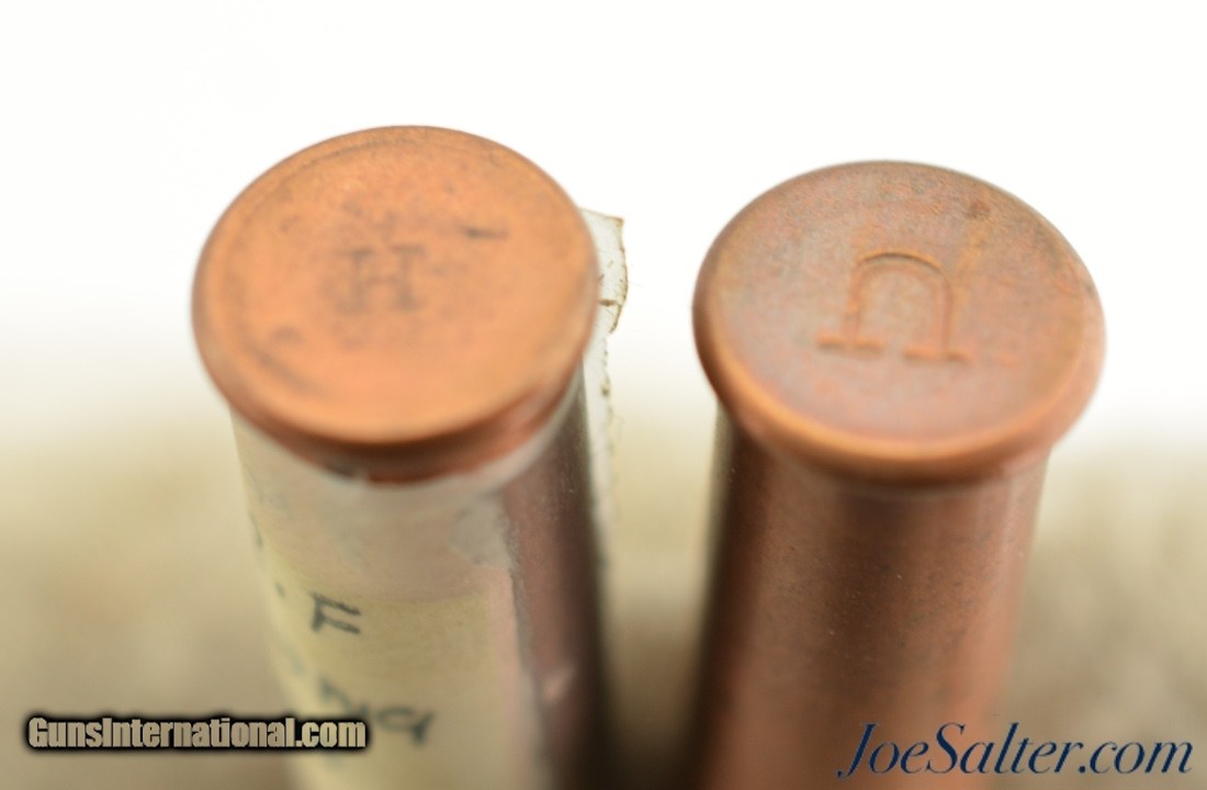 Description: This is a lot of two rounds of .32 Extra Long Rim Fire ammunition with one round bearing the Winchester "H" on the head and the other a UMC "U". Both are in excellent condition with different bullet types, one having collector identification. SOLD |