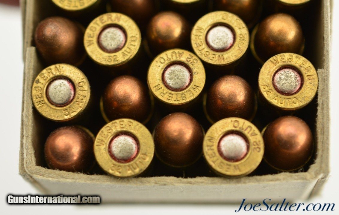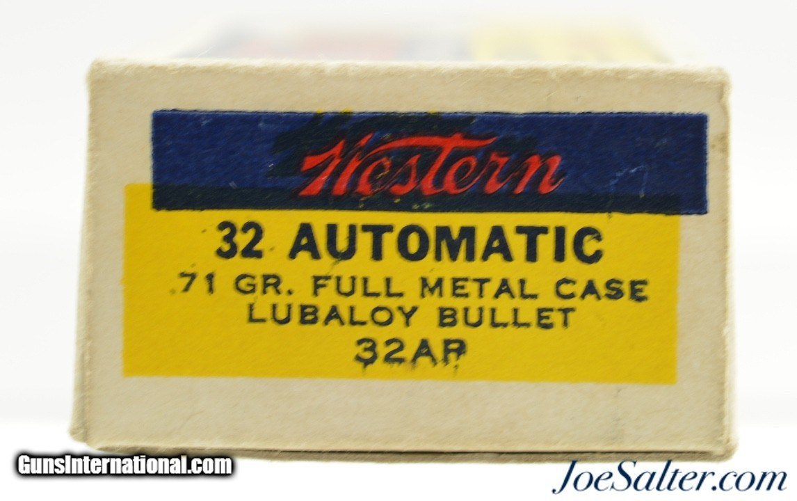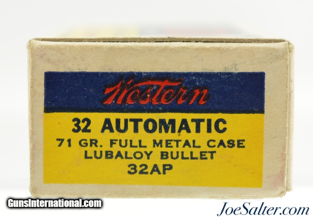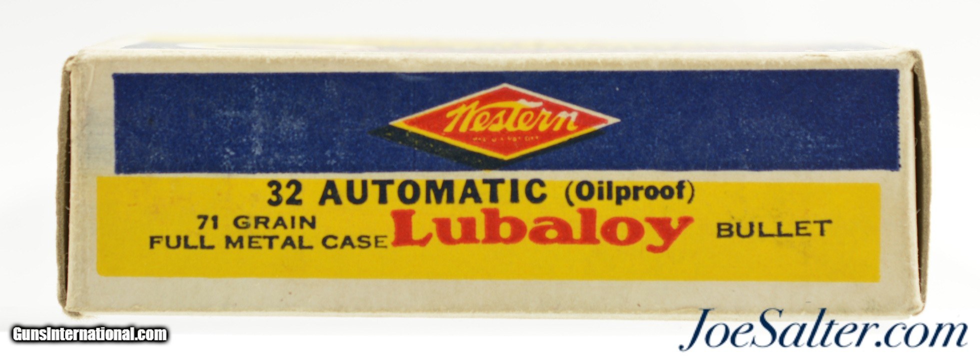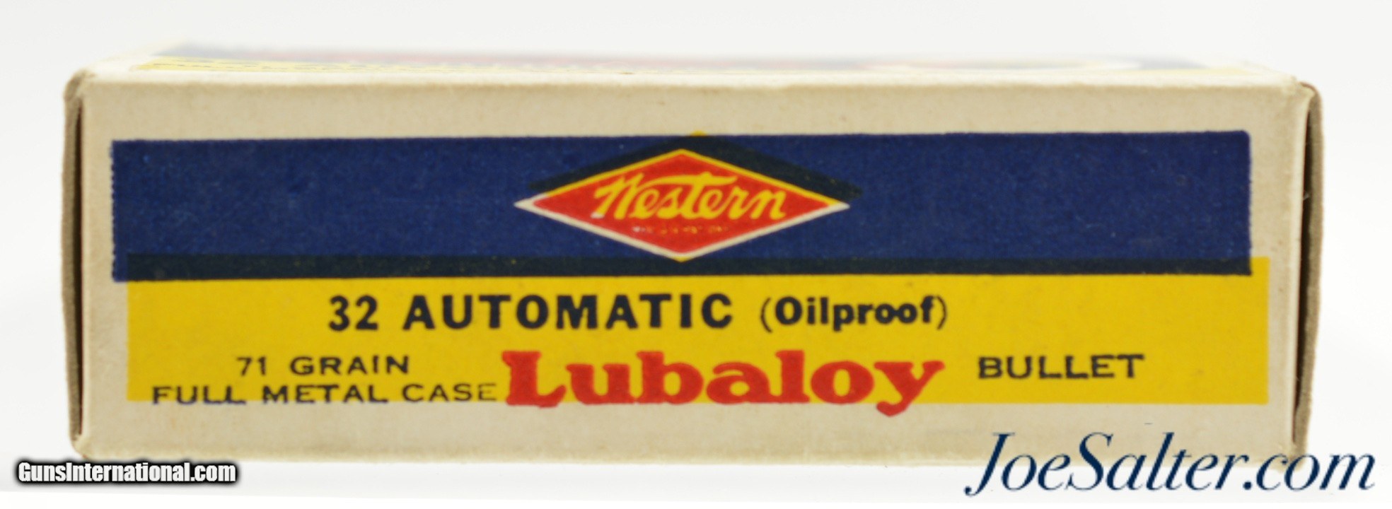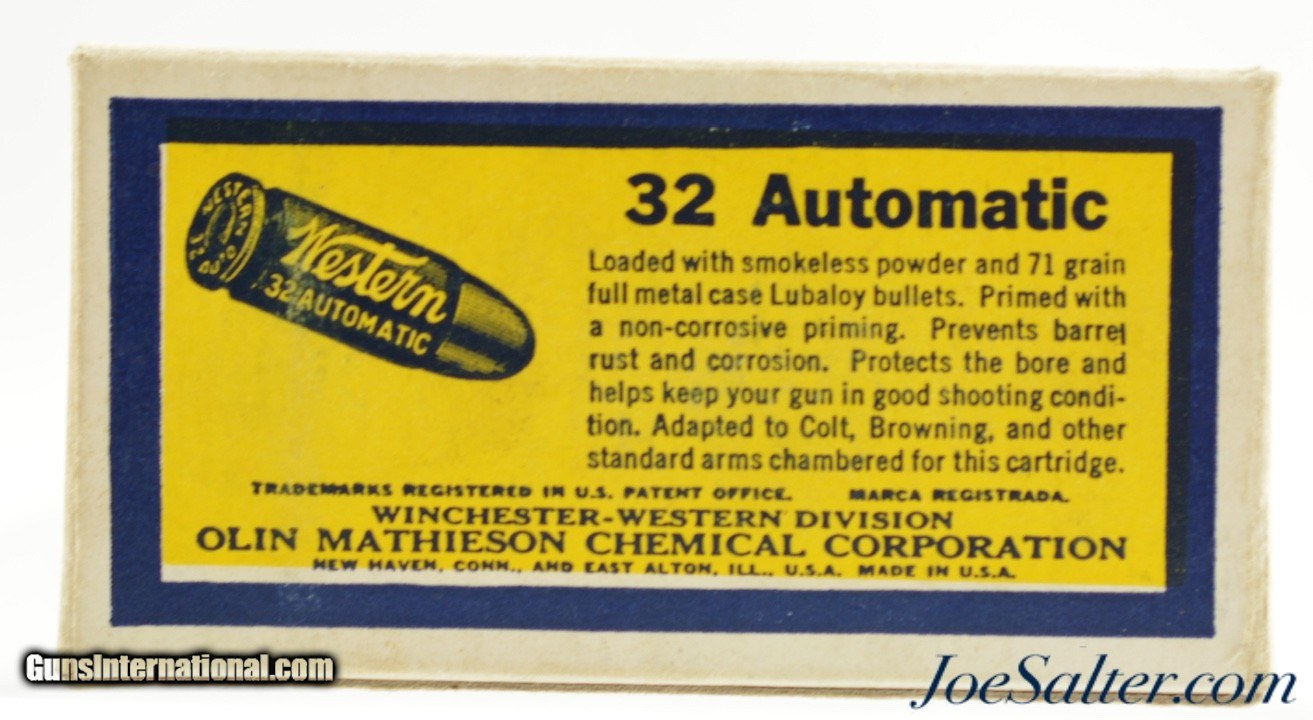 Description: This is a full box, 50 original rounds, of .32 Auto ammunition (.32 ACP) manufactured by Western with 71 grain full metal case Lubaloy bullets. The one piece "Bullseye" target logo box is excellent with bright colors and graphics. The cartridges are excellent. A fantastic crisp box that would be hard to improve upon. Price: $95.00 Contact Seller |