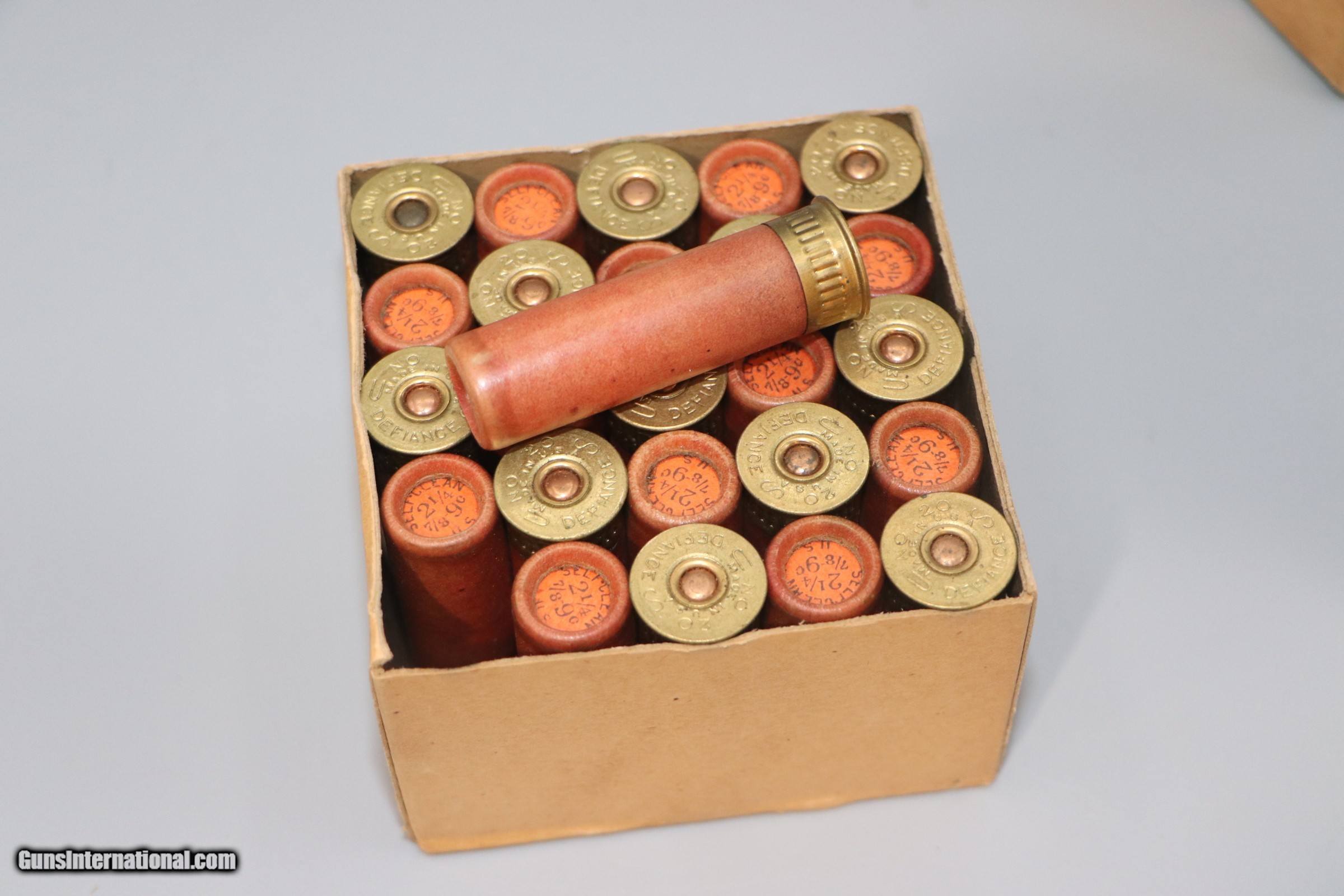 Description: Features some excellent ammo - 2-3/4", 2-1/4 DRS, 7/8 oz, Shot Size 9CH. Box has some scuffing and light tearing on edges. Also some light staining is evident. Box is solid and retrains excellent. Add 13.50 for Shipping SOLD Shotgun Gauge: 20 Gauge |