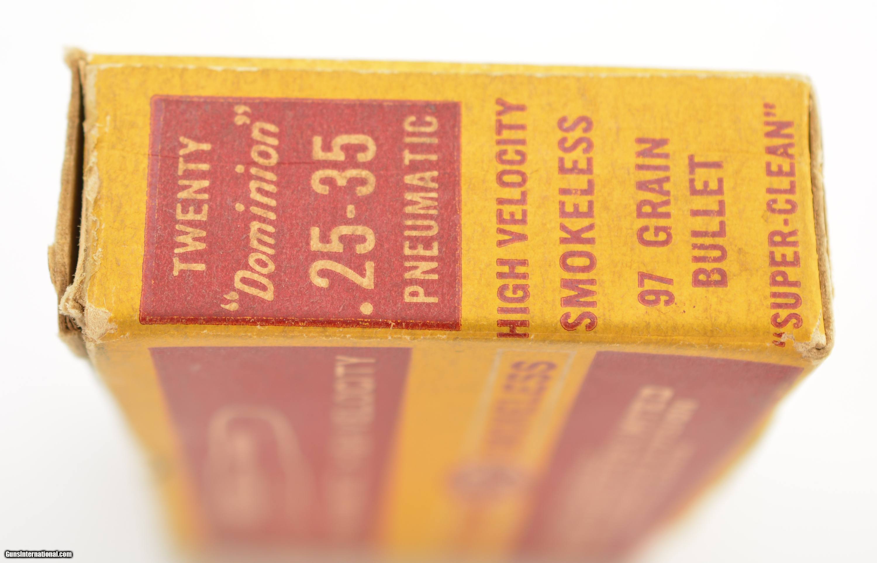 Description: Cil Dominion 25-35 high velocity pneumatic cartridges. This pneumatic bullet was developed by Dominion and patented in Canada in 1926 and in the USA in 1929. Headstamp D.C.Co over 25-35. The box is sound except for the left interior flap which is detached but in the box. Clear graphics on the front and back face. The box shows ageing and edge wear. The cartridges are original and rate excellent. A less common box.- A scarcer box and desirable caliber with a special bullet. SOLD Manufacturer: CIL Model: Ammo Caliber Info: .25-35 Gauge Info: .25-35 |